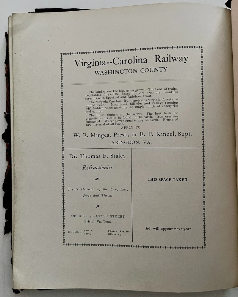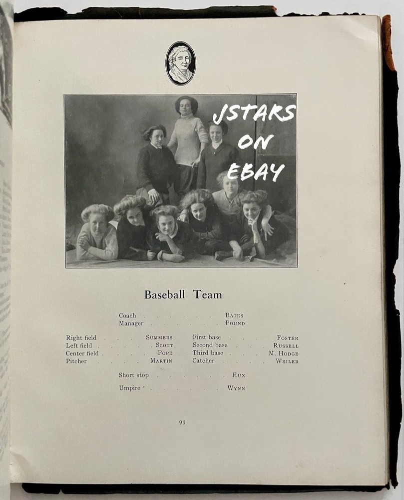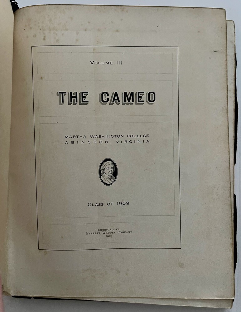 THIS IS A VERY RARE COPY OF "THE CAMEO"! VOLUME III 1909 MARTHA WASHINGTON COLLEGE ABINGDON, VA "THE CAMEO" YEARBOOK ONE OF THOUSANDS OF ITEMS AVAILABLE IN OUR EBAY STORE ! SCHOOL: MARTHA WASHINGTON COLLEGE LOCATION: ABINGDON, VIRGINIA DESCRIPTION: Offered at auction is a fascinating glimpse at life at Martha Washington College in the early twentieth century! This RARE yearbook provides coverage of each faculty member, student and organization. Includes an Advertisements section. Leather bound. Title and year printed in gold on front cover. Black and white photographs with name roster for student. Please write us prior to purchase if you require additional details or a student name look-up. A great addition to your family genealogy reference materials or MWC memorabilia collection! CONDITION DETAILS: VERY GOOD COVERS / VERY GOOD CONTENTS. Normal to moderate rubbing to leather covers. Light age toning to pages. No writing, rips, tears, foxing or missing pages. SHIPPING: UNITED STATES POSTAL SERVICE. Includes Delivery Confirmation. Thanks for looking, and have a blessed day.