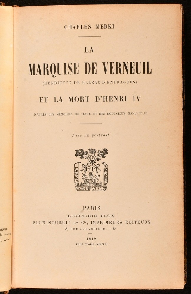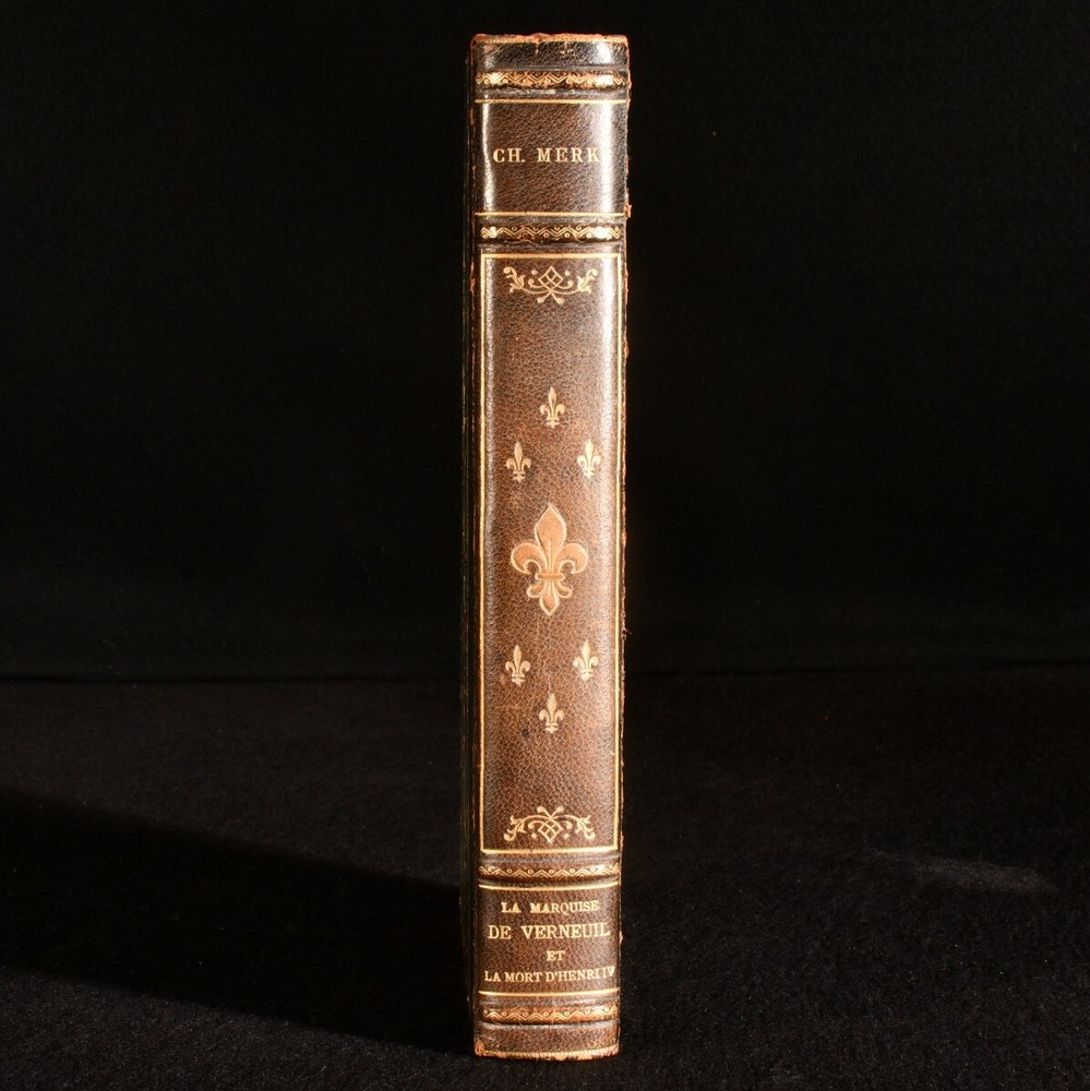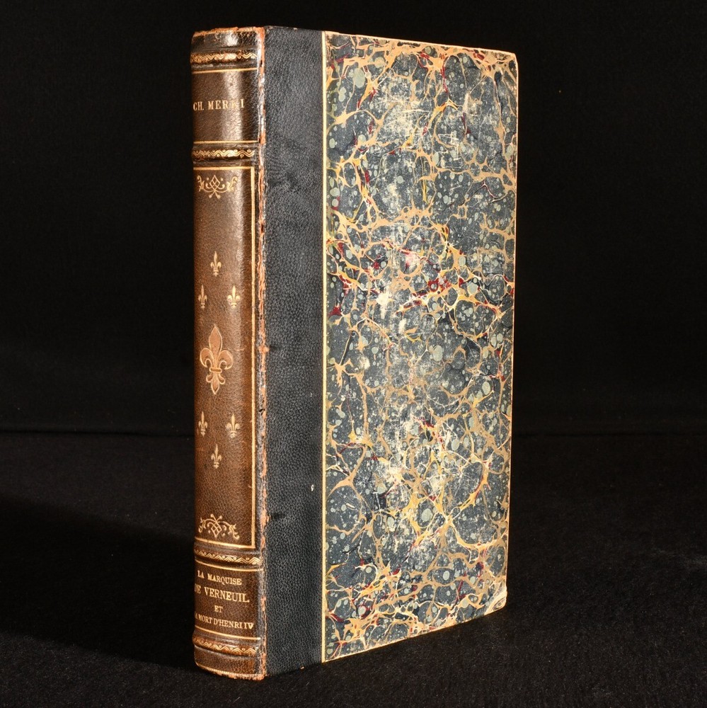 Click here to see our other books! La Marquise de Verneuil (Henriette de Balzac d'Entragues) et la Mort d'Henri IV Charles Merki 1912 Libraire Plon, Plon-Nourrit et Cie. : Paris 9.5" by 6" 2-397pp SUMMARY The first edition of Charles Merki's biography of King Henry IV's favourite mistress, the Marquise de Verneuil. First Edition,Leather Binding Overall Condition: Very Good This book weighs 1 KG when packed UK Postage: £ 3.99 US Postage: £ 22.99 EU Postage : £ 16.99 European Postage: £ 17.99 Asia Postage: £ 22.99 Worldwide Postage: £ 28.99 DESCRIPTION In the original French. With a portrait frontispiece of the subject of the work. The first edition of Merki's biography of Catherine Henriette de Balzac d'Entragues, Marquise de Verneuil. Catherine and her sister were both mistresses of the king, with her mother formerly King Charles IX's sole mistress. Catherine bore Henry IV two children, with only one of them - Gaston Henri - being legitimized. With the bookplate of Mr E. van Beusekom to the front pastedown. CONDITION In a quarter morocco binding, with marbled paper covered boards. Gilt detailing to spine. Fading to back strip. Joints starting, with boards holding firm. Rubbing to board centres. Bookplate to front pastedown. Internally, firmly bound. Pages age toned to perimeters, with the odd spot. Overall Condition: Very Good GLOSSARY OF TERMS Overall Condition (Dustwrapper condition rating is shown after that for the book itself, where a dustwrapper is present) Fine - Very well preserved copy showing very little wear Very Good Indeed - Only one or two minor faults, really a very attractive copy Very Good - Quite a wide term meaning no major faults but probably several smaller ones often expected given the age of the book, but still a respectable copy Good - Meaning not very good. Some more serious faults as will be described in the condition report under 'condition' Good Only - Meaning one or more faults that could really do with repair Fair - As with good only above but with other faults leaving a compromised copy even after repair Poor - Really bad and possibly seriously incomplete. We only sell books in this condition where their rarity or value makes them attractive none the less. Major defects will be described. GUARANTEE We offer a full money back guarantee on our descriptions. Please ask for details and conditions. We prefer PAYPAL. If you pay via PAYPAL we will post the item off the same or the next working day with the postage you have selected. Please note we cannot accept USD cheques