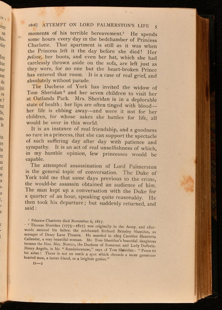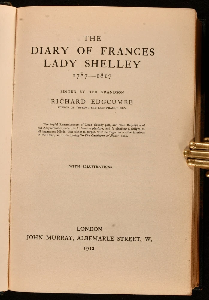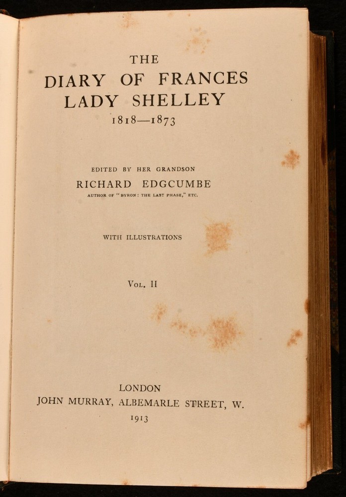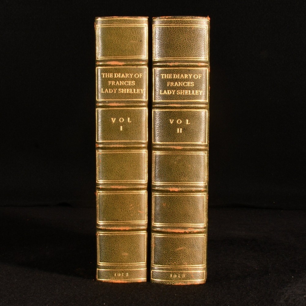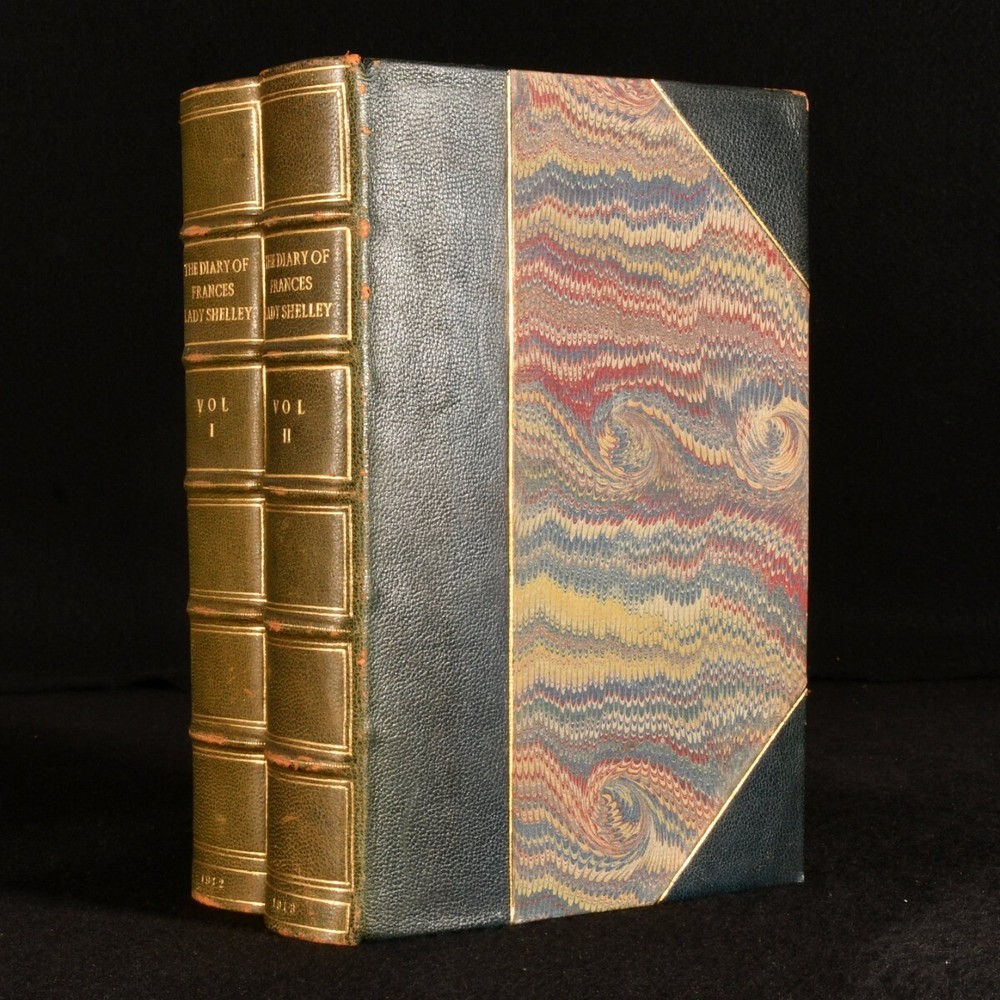 Click here to see our other books! The Diary of Frances Lady Shelley 1787-1817 and 1818-1873 Richard Edgcumbe 1912-1913 John Murray : London 8.5" by 5.5" vii, 406; ix, 424pp SUMMARY A smart two volume set of the dairies of Frances Lady Shelley, with illustrations. Illustrated,Leather Binding Overall Condition: Very Good This book weighs 2 KG when packed UK Postage: £ 3.99 US Postage: £ 29.99 EU Postage : £ 21.99 European Postage: £ 23.99 Asia Postage: £ 37.99 Worldwide Postage: £ 38.99 DESCRIPTION Two volumes of The Diary of Frances Lady Shelley from 1787-1817 and 1818-1873. The diaries have been edited by her grandson Richard Edgcumbe. Frances Lady Shelley was a noted diarist and friend of the Duke of Wellington and these volumes provide a fascinating insight into her life. With six illustrations including a frontispiece to volume one and seven to volume two and a folding plate. Collated, complete. The first volume is a reprint and the second is a first edition copy. Bookplate of Oliver Brett later Viscount Esher, who was a politician and British Peer. Bound by Roger de Coverly & Sons. CONDITION In half morocco binding with marbled boards. Externally, very smart, with some rubbing to the spine. Previous owner bookplate to the front pastedown of both volumes. Internally, firmly bound with bright and clean pages. Overall Condition: Very Good GLOSSARY OF TERMS Overall Condition (Dustwrapper condition rating is shown after that for the book itself, where a dustwrapper is present) Fine - Very well preserved copy showing very little wear Very Good Indeed - Only one or two minor faults, really a very attractive copy Very Good - Quite a wide term meaning no major faults but probably several smaller ones often expected given the age of the book, but still a respectable copy Good - Meaning not very good. Some more serious faults as will be described in the condition report under 'condition' Good Only - Meaning one or more faults that could really do with repair Fair - As with good only above but with other faults leaving a compromised copy even after repair Poor - Really bad and possibly seriously incomplete. We only sell books in this condition where their rarity or value makes them attractive none the less. Major defects will be described. GUARANTEE We offer a full money back guarantee on our descriptions. Please ask for details and conditions. We prefer PAYPAL. If you pay via PAYPAL we will post the item off the same or the next working day with the postage you have selected. Please note we cannot accept USD cheques