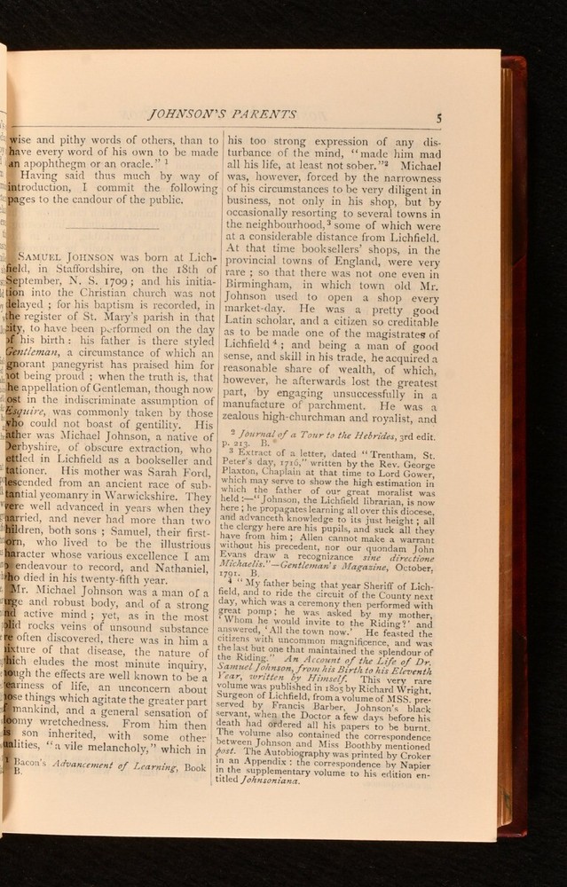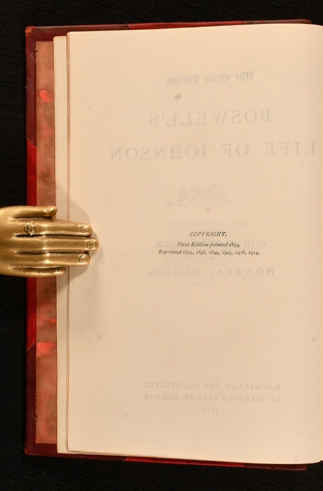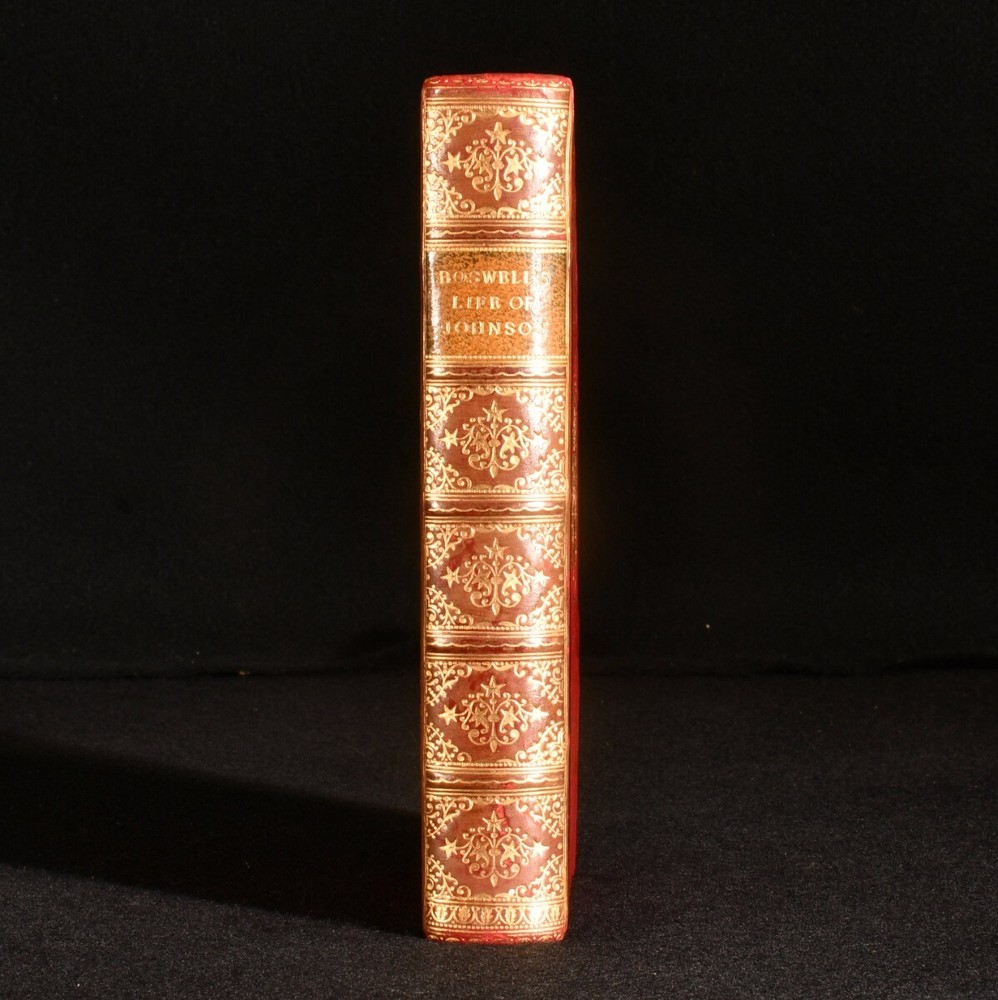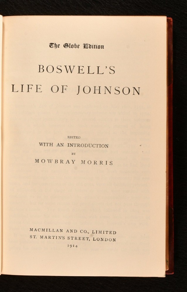 Click here to see our other books! Boswell's Life of Johnson James Boswell; Mowbray Morris [intro] 1914 Macmillan and Co. : London 7.5" by 5" xxiii, 718pp. SUMMARY A Globe Edition of Boswell's biography of Samuel Johnson, in a very smart half calf binding with the gilt crest of Marlborough College to the front board. Leather Binding Overall Condition: Near Fine This book weighs 0.75 KG when packed UK Postage: £ 3.99 US Postage: £ 19.99 EU Postage : £ 15.99 European Postage: £ 16.99 Asia Postage: £ 21.99 Worldwide Postage: £ 25.99 DESCRIPTION The sixth reprint of the Globe Edition of this work in a half calf binding, with the gilt crest of Marlborough College to the front board, and decorative gilt to the spine. Marbled end papers and edges. James Boswell (1740-1795) was best known for this biography of his friend Samuel Johnson, commonly said to be the greatest biography written in the English language. It gives an account of his personality, his studies and works, as well as his correspondence and some previously unpublished work. Samuel Johnson had an influential and lasting effect on the development of English literature, particularly due to his dictionary, literary criticism and biographical works. This edition contains a facsimile of the title page from the original quarto edition and an advertisement to the first edition, along with an introduction by Mowbray Morris. CONDITION In a half calf binding. Externally very smart, with light rubbing to the extremities and joints. Colour and gilt remain bright to the boards and spine. Internally, firmly bound. Pages are very bright and clean. Overall Condition: Near Fine GLOSSARY OF TERMS Overall Condition (Dustwrapper condition rating is shown after that for the book itself, where a dustwrapper is present) Fine - Very well preserved copy showing very little wear Very Good Indeed - Only one or two minor faults, really a very attractive copy Very Good - Quite a wide term meaning no major faults but probably several smaller ones often expected given the age of the book, but still a respectable copy Good - Meaning not very good. Some more serious faults as will be described in the condition report under 'condition' Good Only - Meaning one or more faults that could really do with repair Fair - As with good only above but with other faults leaving a compromised copy even after repair Poor - Really bad and possibly seriously incomplete. We only sell books in this condition where their rarity or value makes them attractive none the less. Major defects will be described. GUARANTEE We offer a full money back guarantee on our descriptions. Please ask for details and conditions. We prefer PAYPAL. If you pay via PAYPAL we will post the item off the same or the next working day with the postage you have selected. Please note we cannot accept USD cheques