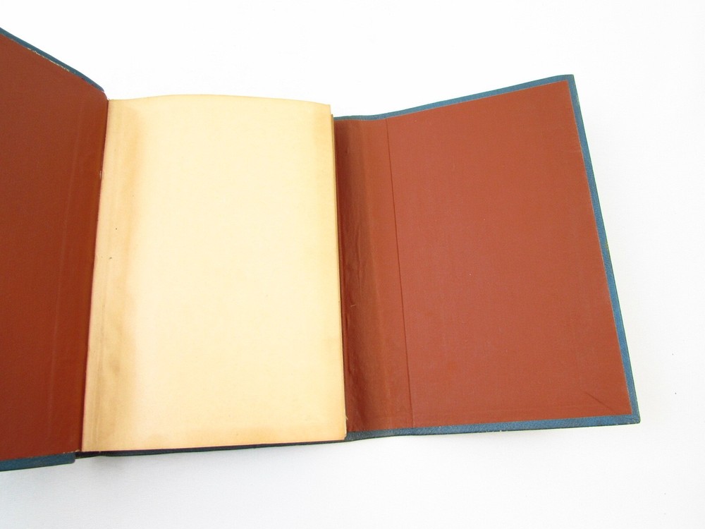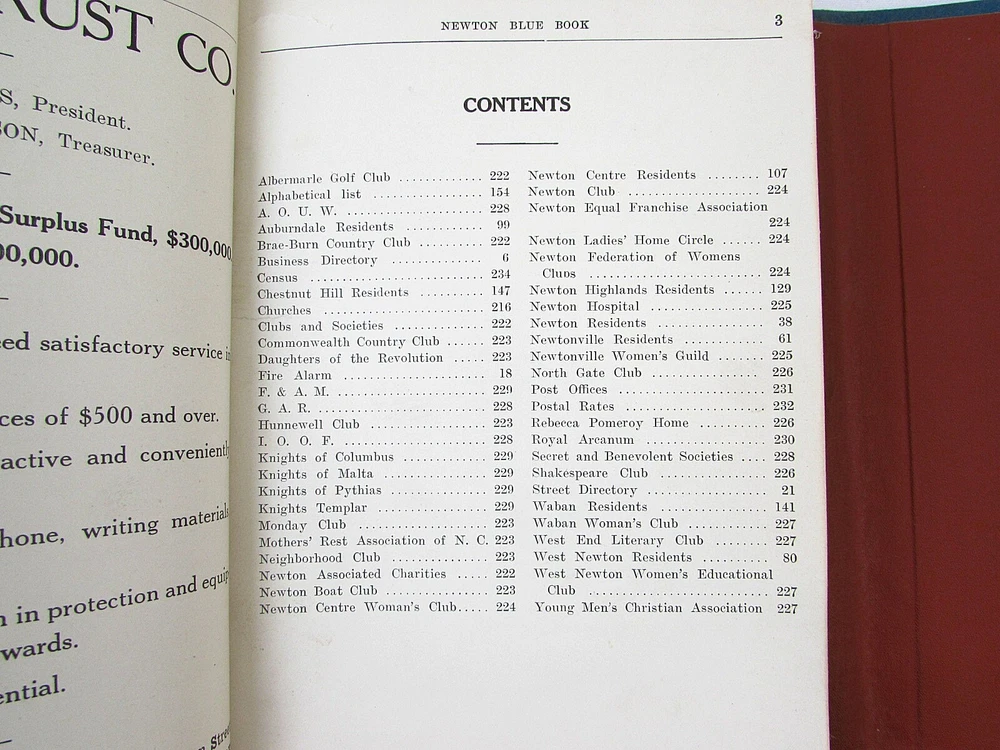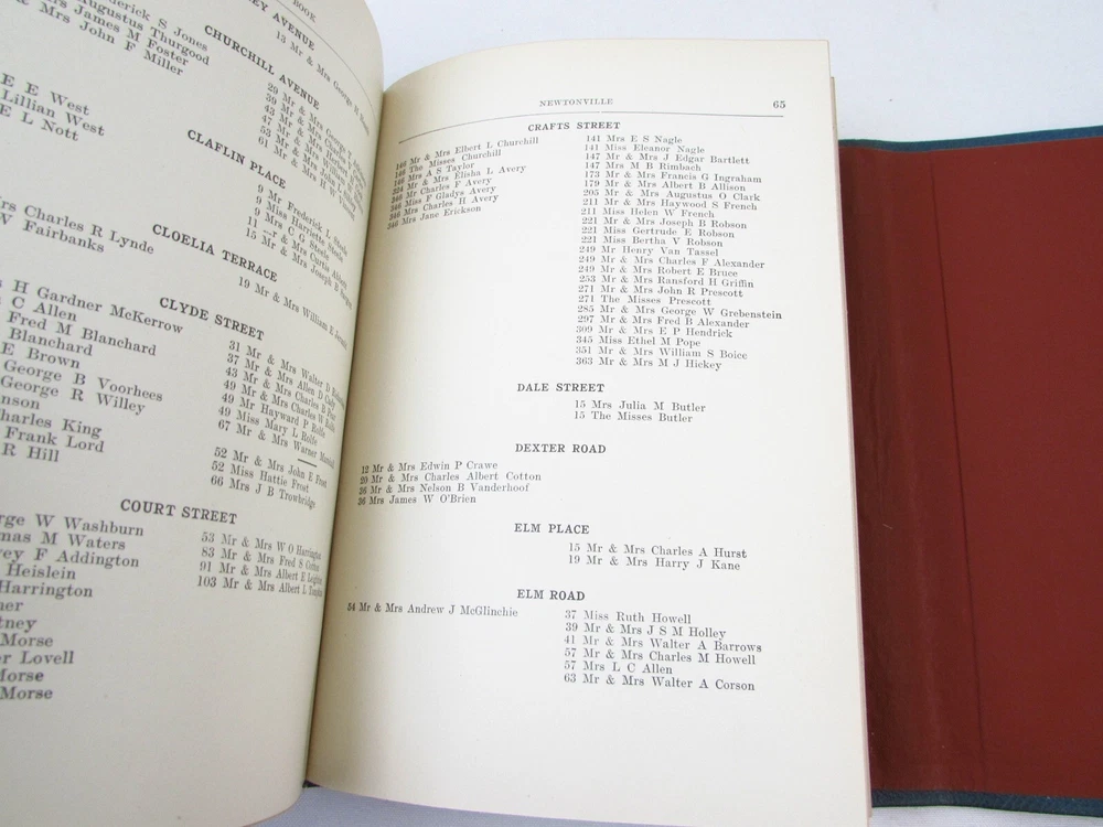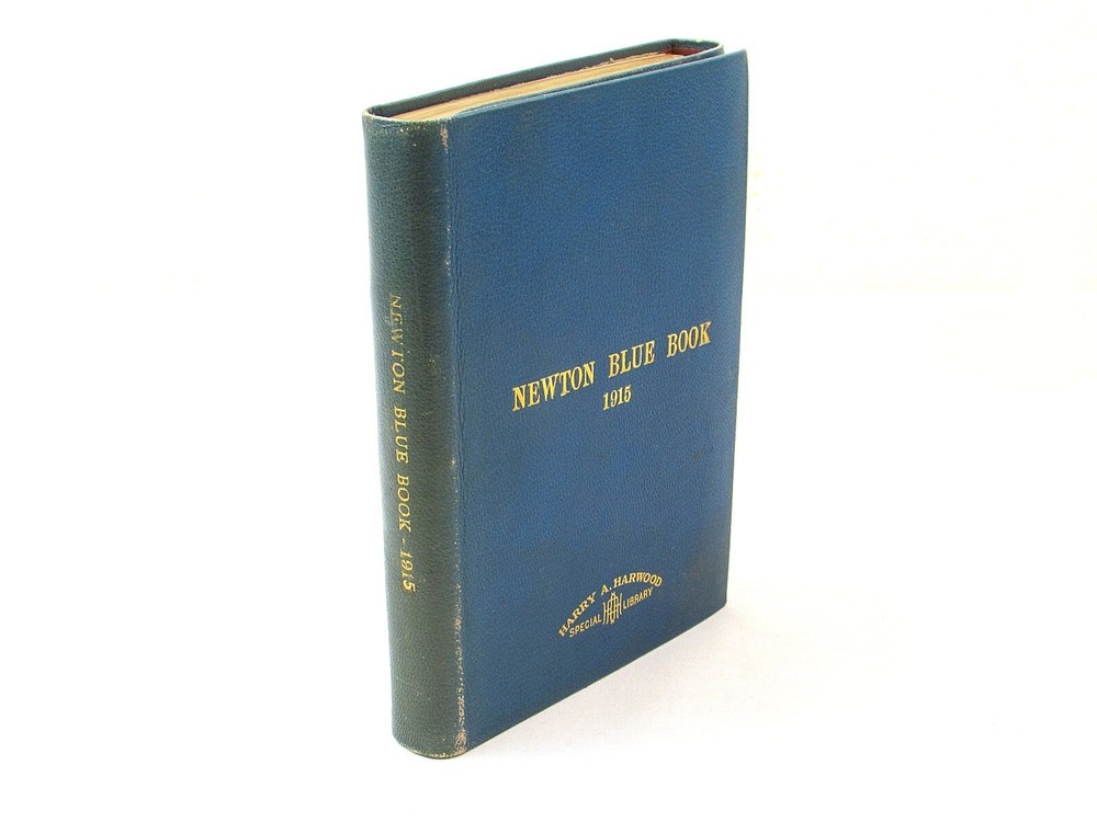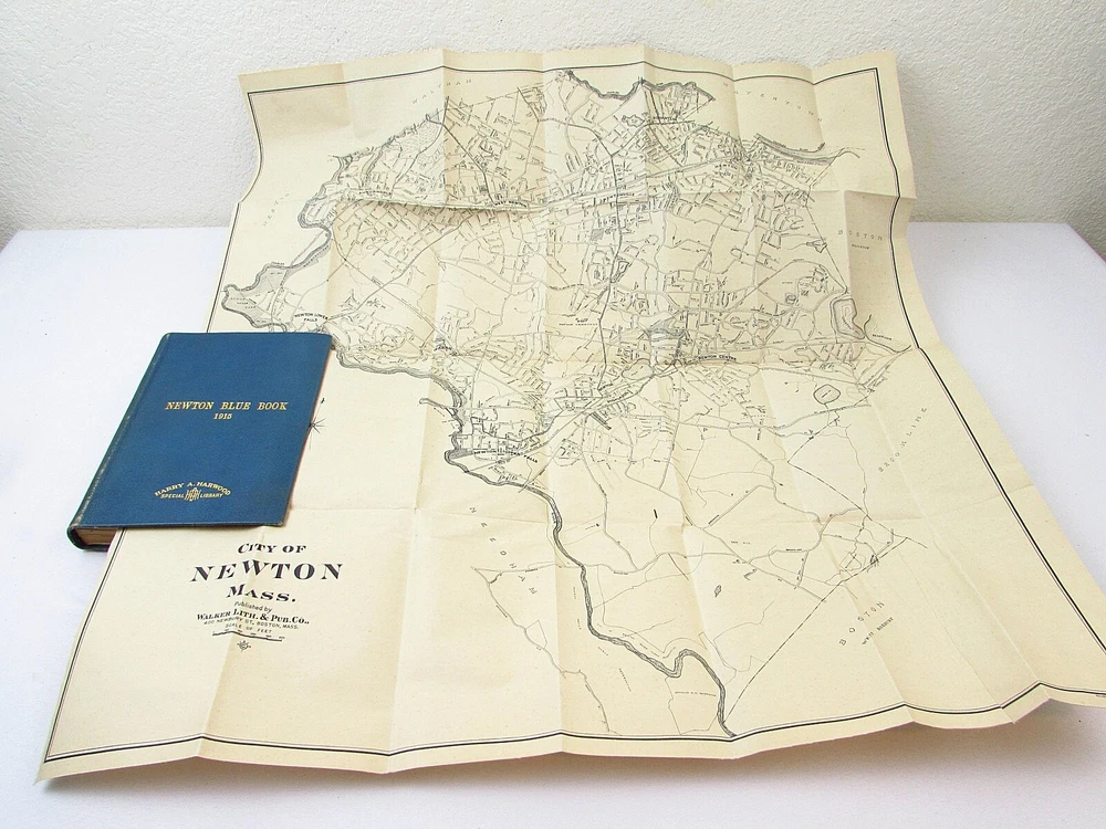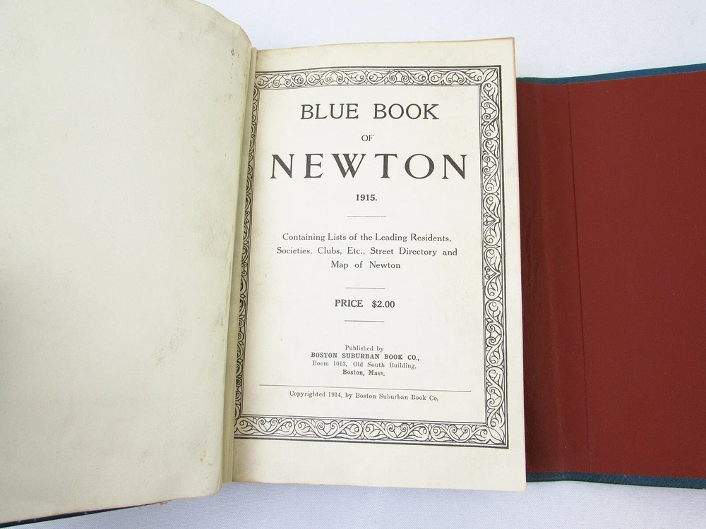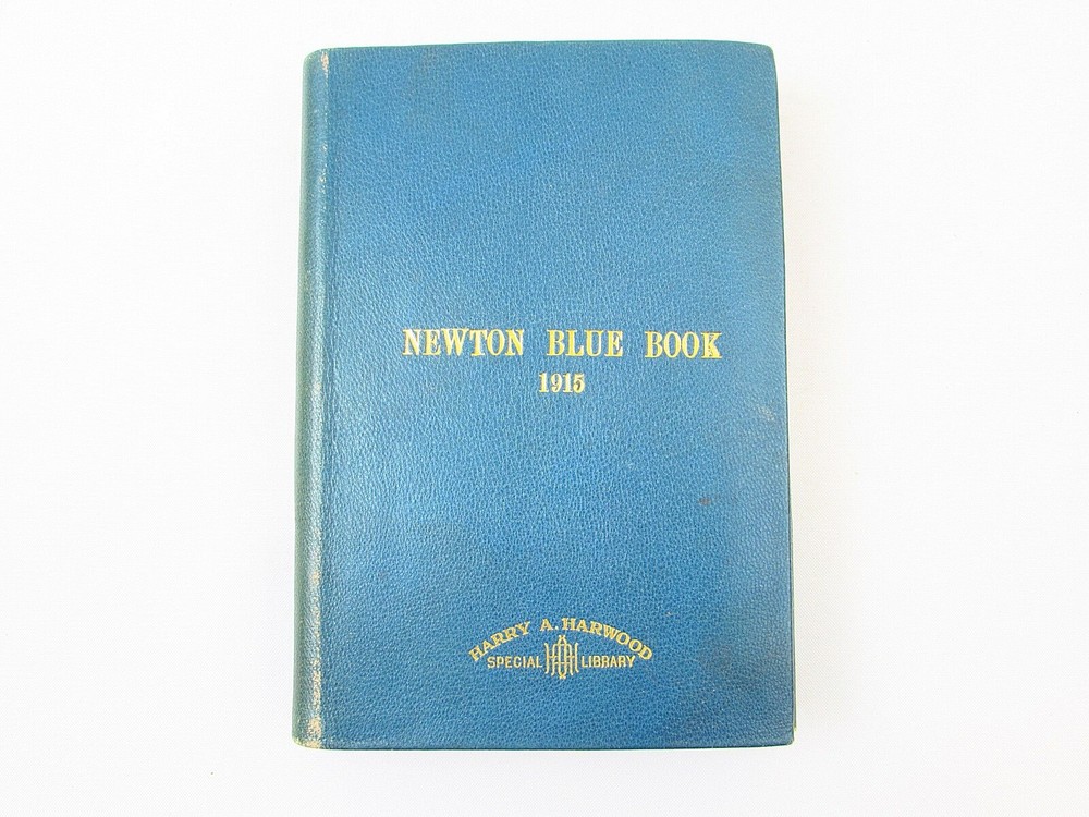 ______________________________________________________________________________________________ 1915 Newton Blue Book - Published by the Boston Suburban Book Company - Copyright 1914 - Leather binding with gilt lettering I believe this was rebound in leather between ~1910-1930 based on knowledge of the estate collection this came from. The binding is relatively unusual, as it includes a third protective flap. Includes large, cloth-backed fold-out map, and some of the prior owners own photos bound in.. Moderate general handling wear and evidence of age. Several slightly loose pages, otherwise very good overall condition inside. See photos. FREE Shipping within the U.S. via USPS Media Mail!!! Expedited and International shipping available. Please let me know if you have any questions and I'll be glad to help.