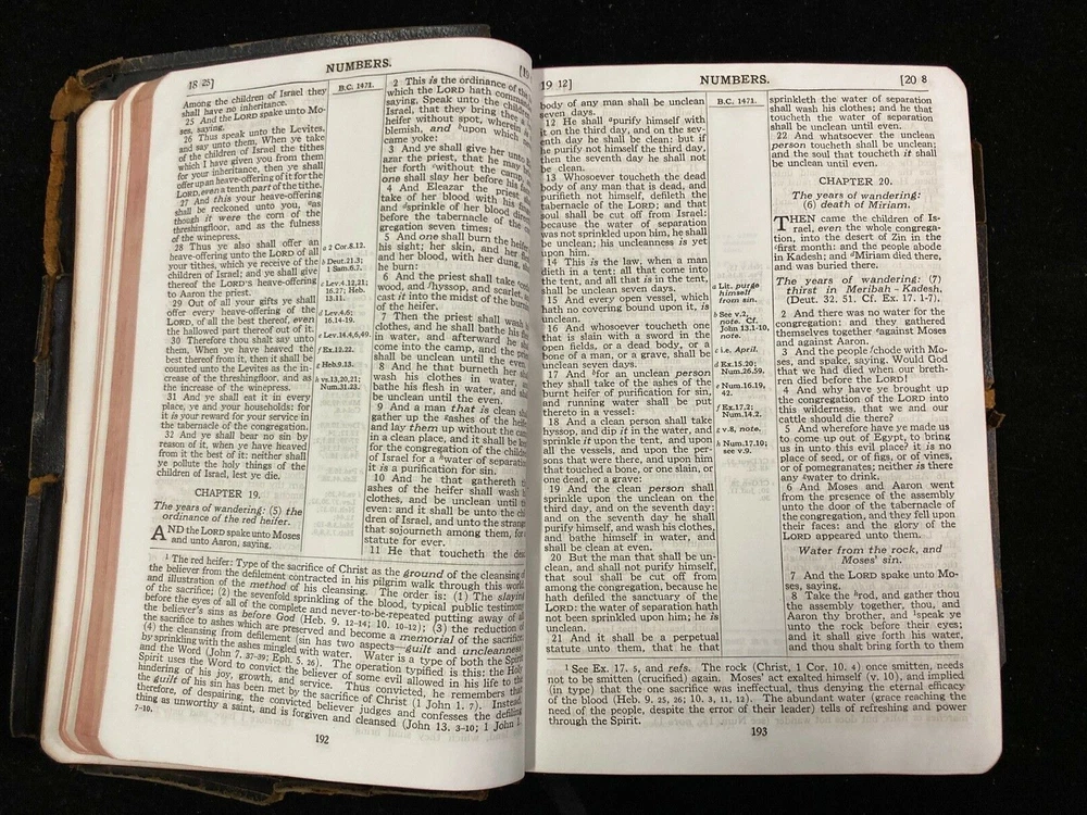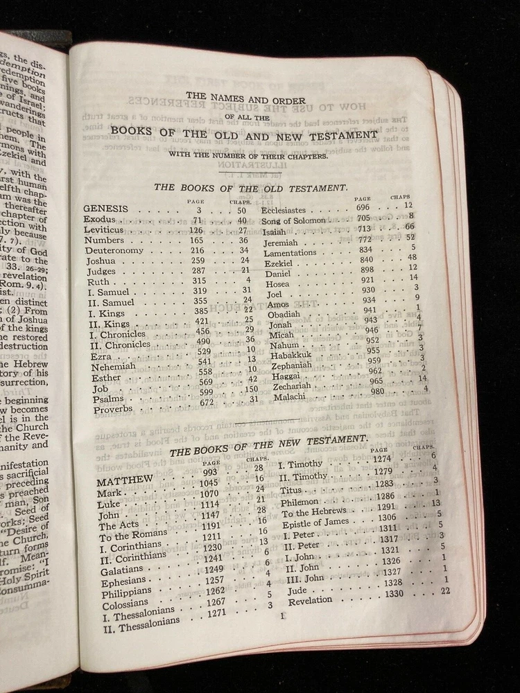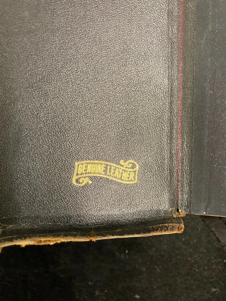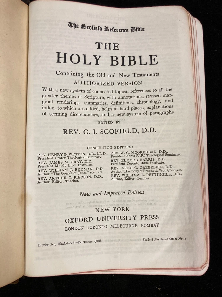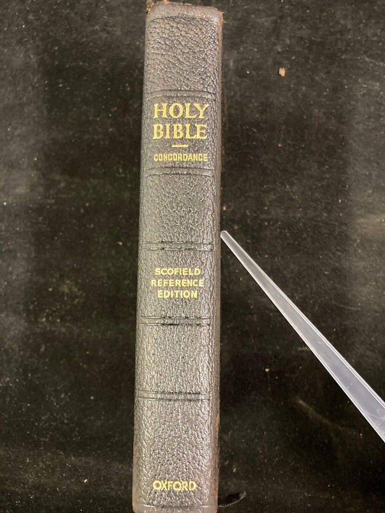 1917 HOLY BIBLE CONCORDANCE SCOFIELD REFERENCE EDITION, OXFORD, GENUINE LEATHER. GOOD CONDITION, EXCEPT FOR COVER EDGE WEAR, ONE SMALL PAGE BOTTOM EDGE TEAR, A FEW CORNER CREASES, & HANDWRITTEN NOTATIONS ON FIRST TWO PAGES. ENJOY!!! (CABINET 3, SHELF 3, CENTER)