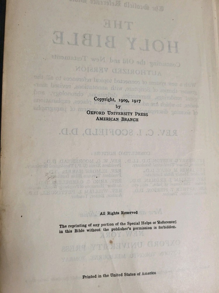This is a 1917 Holy Bible Scofield Reference Bible Oxford US Edition, WWI Era , In excellent Condition....