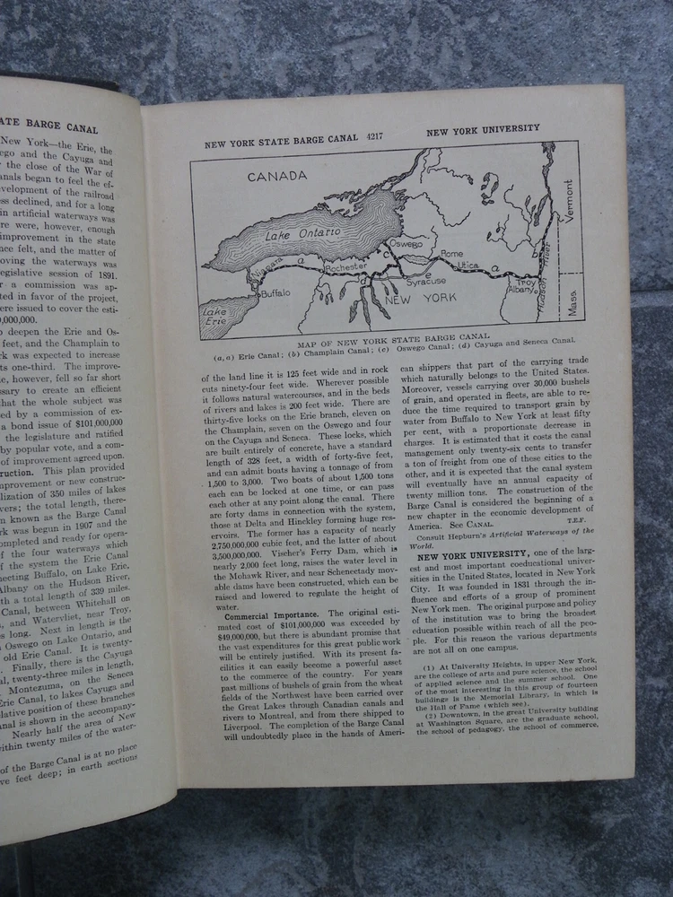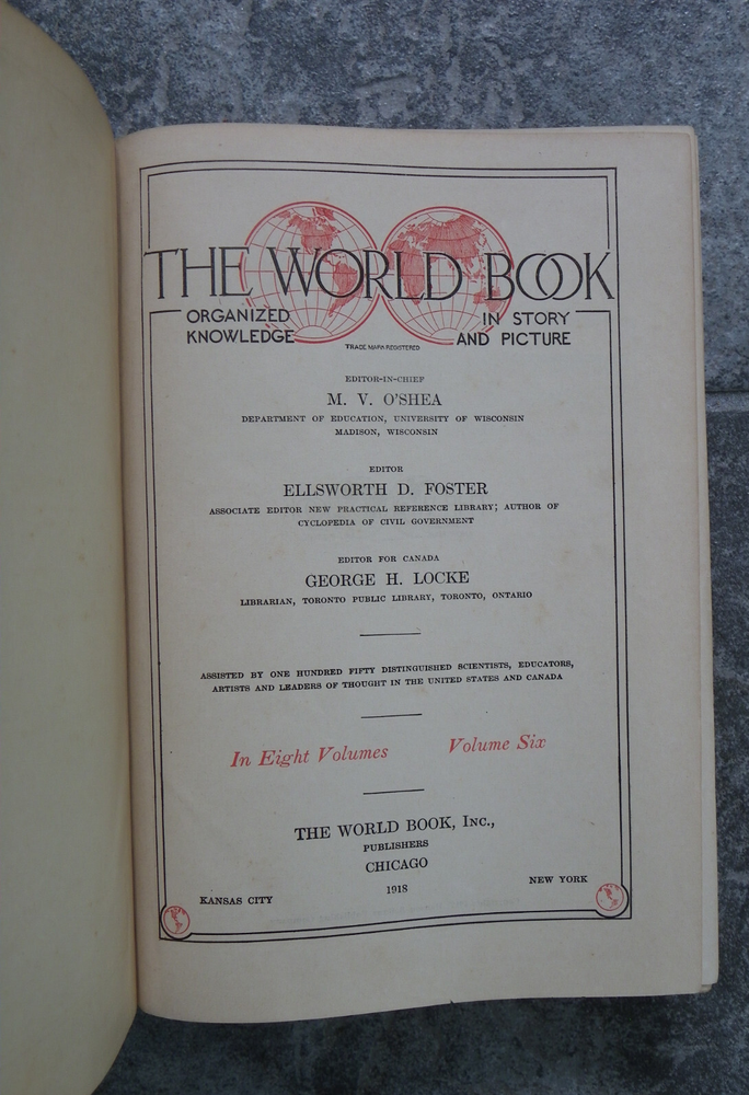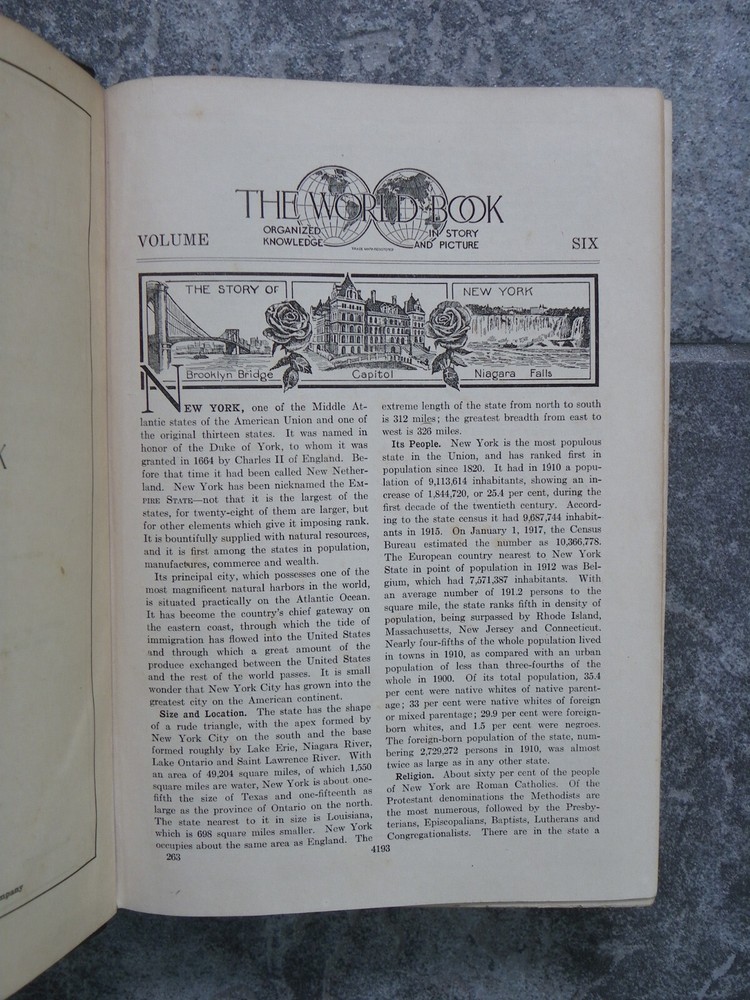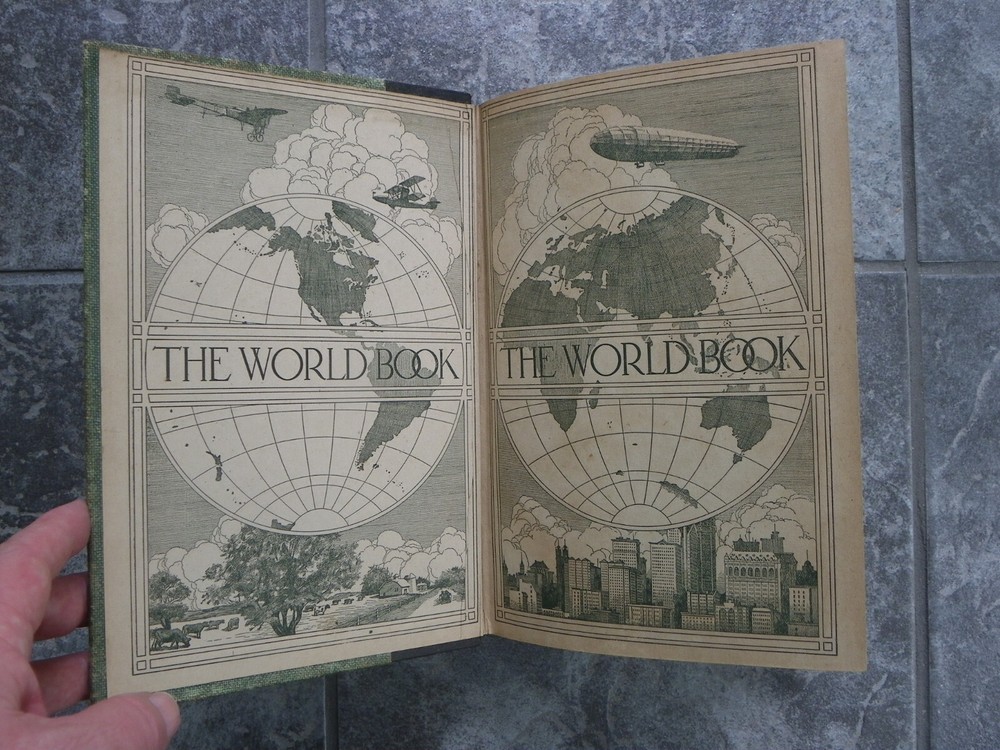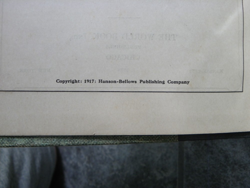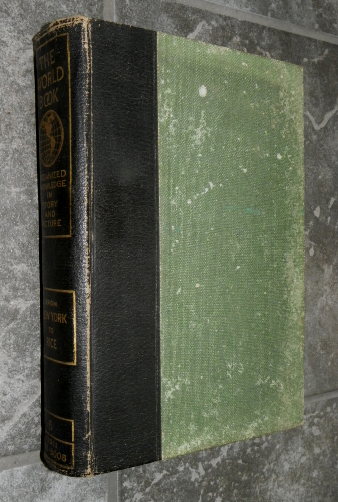 Offered is the antique leather-and-board encyclopedia "The World Book-Volume 6-New York to Rice", published in Chicago by the World Book, Inc. in 1918, with a Hanson-Bellows copyright date of 1917. This is a very early edition of this popular encyclopedia, which debuted in 1917-possibly a second printing of the first edition? There are many black and white photos, illustrations and maps, plus at least one color map and illustration. The first and other very early editions of the World Book are rare; at the time of original listing I could only find three other volumes for sale on eBay, none volume 6. NOTE THAT THIS IS VOLUME 6 of 8 ONLY. The book is approx. 9 3/4" x 7" and contains 816 pages, numbered consecutively from previous volumes. It is in good condition overall. The hard black leather and green cloth cover has light to moderate wear, with considerable surface blotchiness. The gold words and symbol on the spine are still mostly shiny. There is no cracking inside either the front or back cover. The design endpapers have yellowed slightly but are otherwise mostly clean. I see no missing pages and all are well-attached to the binding. I see a couple with small tears and a few that have "dog-eared" corners. They have yellowed slightly but are otherwise mostly clean, with only occasional light foxing. I see no writing in the book. I have a lot of experience with vintage and antique books but am not an expert so please let me know if my description is missing information and you have additional questions. I will do my best to answer them! Please take a moment to look at some of the other items in my eBay store!