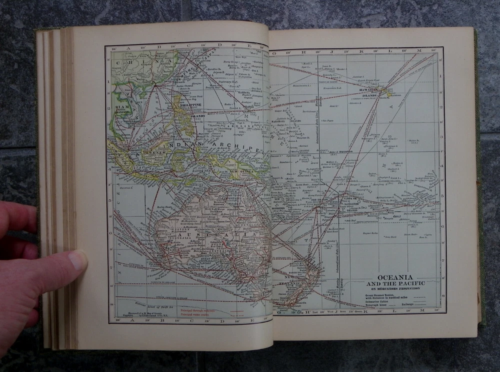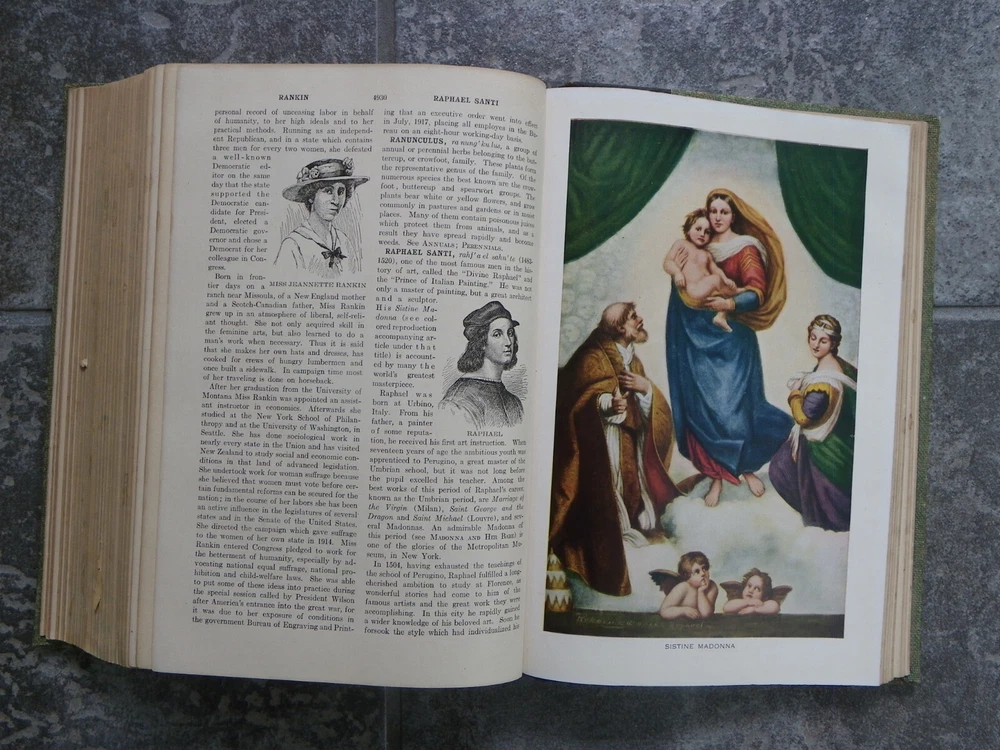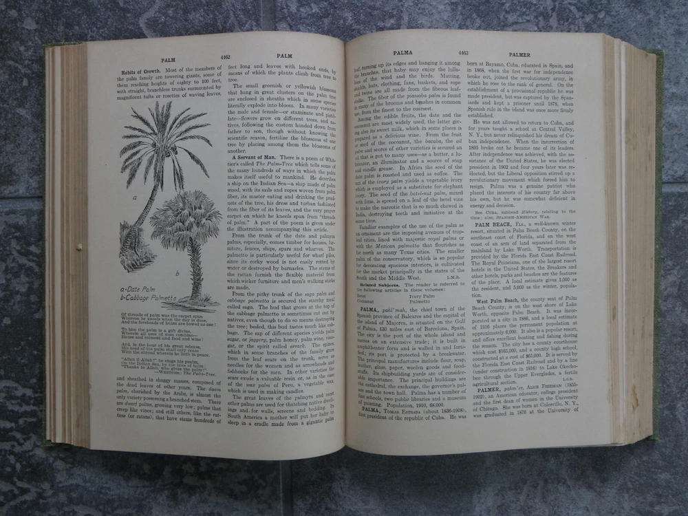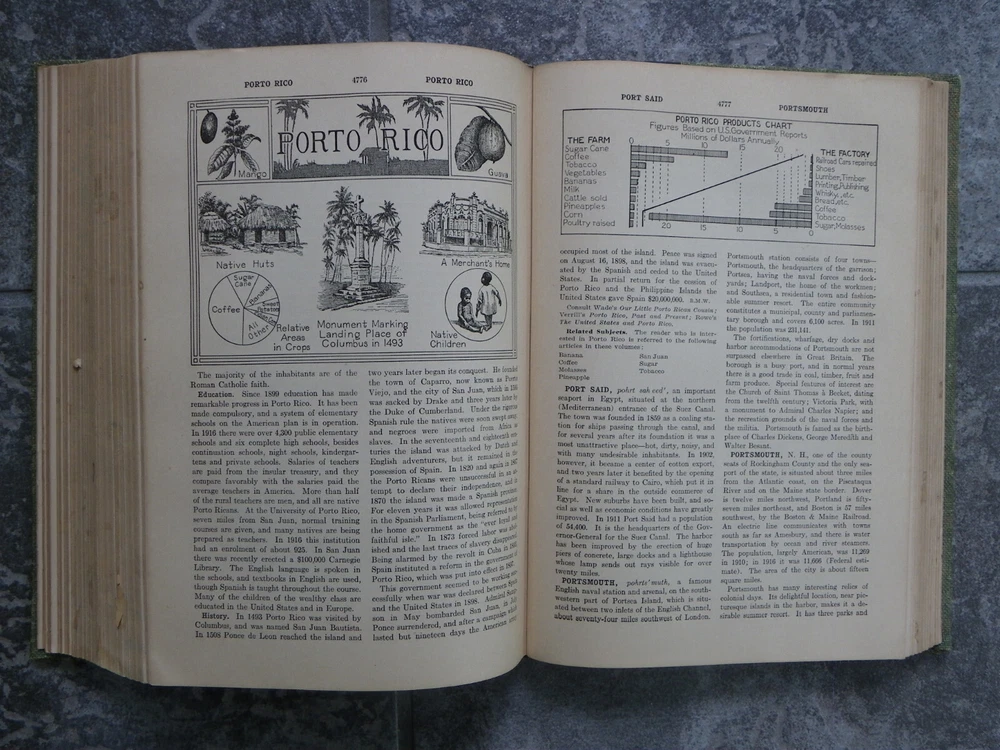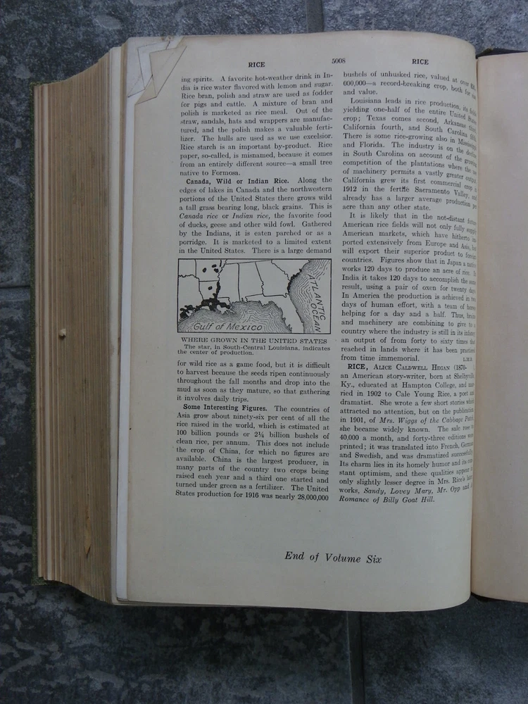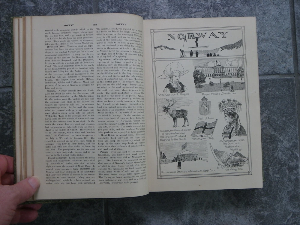 Offered is the antique leather-and-board encyclopedia "The World Book-Volume 6-New York to Rice", published in Chicago by the World Book, Inc. in 1918, with a Hanson-Bellows copyright date of 1917. This is a very early edition of this popular encyclopedia, which debuted in 1917-possibly a second printing of the first edition? There are many black and white photos, illustrations and maps, plus at least one color map and illustration. The first and other very early editions of the World Book are rare; at the time of original listing I could only find three other volumes for sale on eBay, none volume 6. NOTE THAT THIS IS VOLUME 6 of 8 ONLY. The book is approx. 9 3/4" x 7" and contains 816 pages, numbered consecutively from previous volumes. It is in good condition overall. The hard black leather and green cloth cover has light to moderate wear, with considerable surface blotchiness. The gold words and symbol on the spine are still mostly shiny. There is no cracking inside either the front or back cover. The design endpapers have yellowed slightly but are otherwise mostly clean. I see no missing pages and all are well-attached to the binding. I see a couple with small tears and a few that have "dog-eared" corners. They have yellowed slightly but are otherwise mostly clean, with only occasional light foxing. I see no writing in the book. I have a lot of experience with vintage and antique books but am not an expert so please let me know if my description is missing information and you have additional questions. I will do my best to answer them! Please take a moment to look at some of the other items in my eBay store!