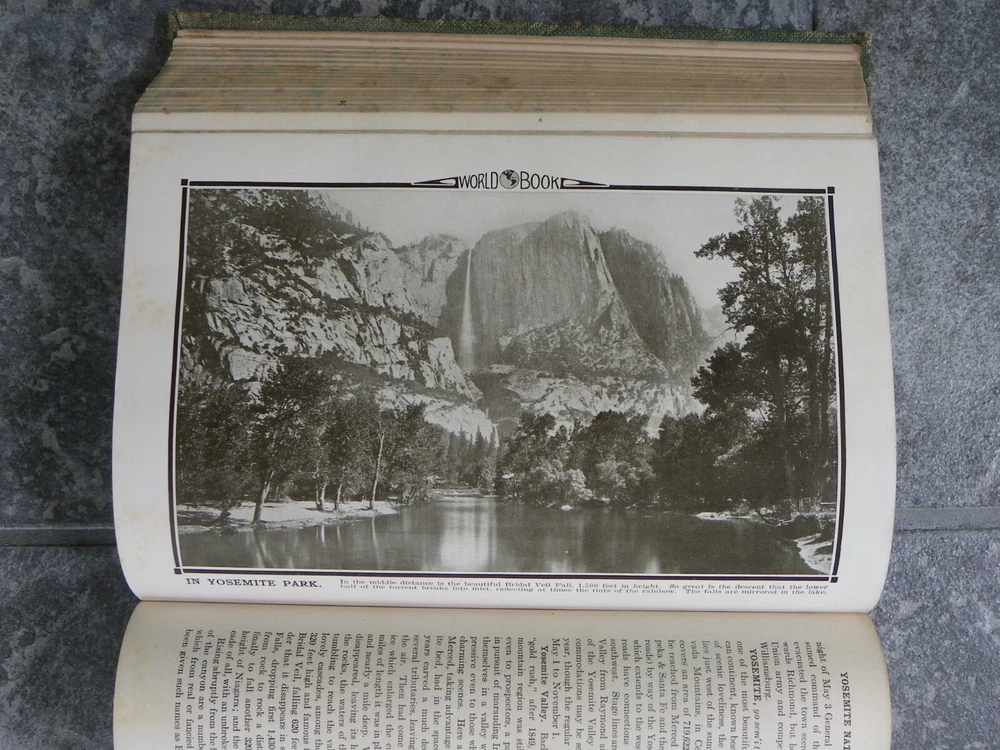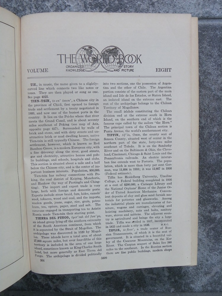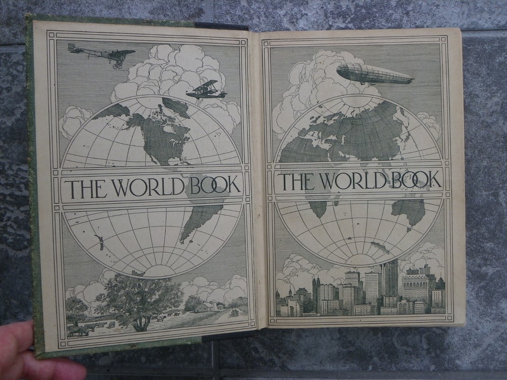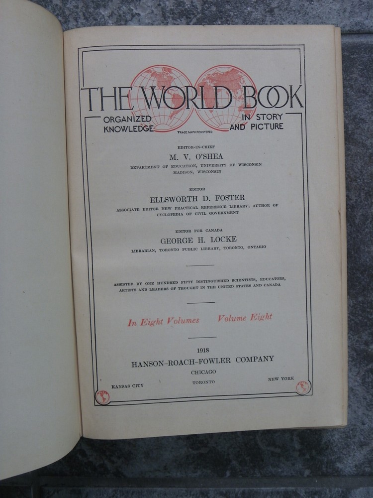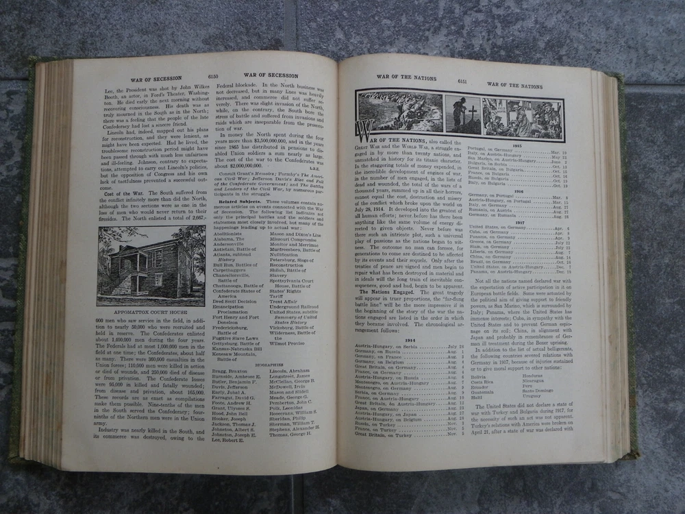 Offered is the antique leather-and-board encyclopedia "The World Book-Volume 8-Tie to Zwingli", published in Chicago by the Hanson-Roach-Fowler Co. in 1918, with a Hanson-Bellows copyright date of 1918. This is a very early edition of this popular encyclopedia, which debuted in 1917-possibly a second printing of the first edition? There are many black and white photos, illustrations and maps, plus at least one color illustration. The first and other very early editions of the World Book are rare; at the time of original listing I could only find three other volumes for sale on eBay, none volume 8. NOTE THAT THIS IS VOLUME 8 of 8 ONLY. The book is approx. 9 3/4" x 7" and contains 720 pages, numbered consecutively from previous volumes, including the index to the whole set. It is in fair to good condition overall. The hard black leather and green cloth cover has light to moderate wear, with considerable surface blotchiness. The gold words and symbol on the spine are still mostly shiny. There is no cracking inside either the front or back cover. The design endpapers have yellowed slightly but are otherwise mostly clean. I see no missing pages and most are well-attached to the binding but some are slightly loose. I see a couple with small tears and a few that have "dog-eared" corners. They have yellowed slightly but are otherwise mostly clean, with only occasional light foxing. I see no writing in the book. I have a lot of experience with vintage and antique books but am not an expert so please let me know if my description is missing information and you have additional questions. I will do my best to answer them! Please take a moment to look at some of the other items in my eBay store!