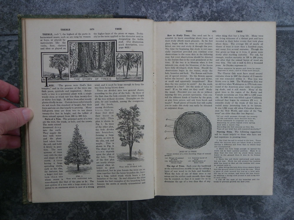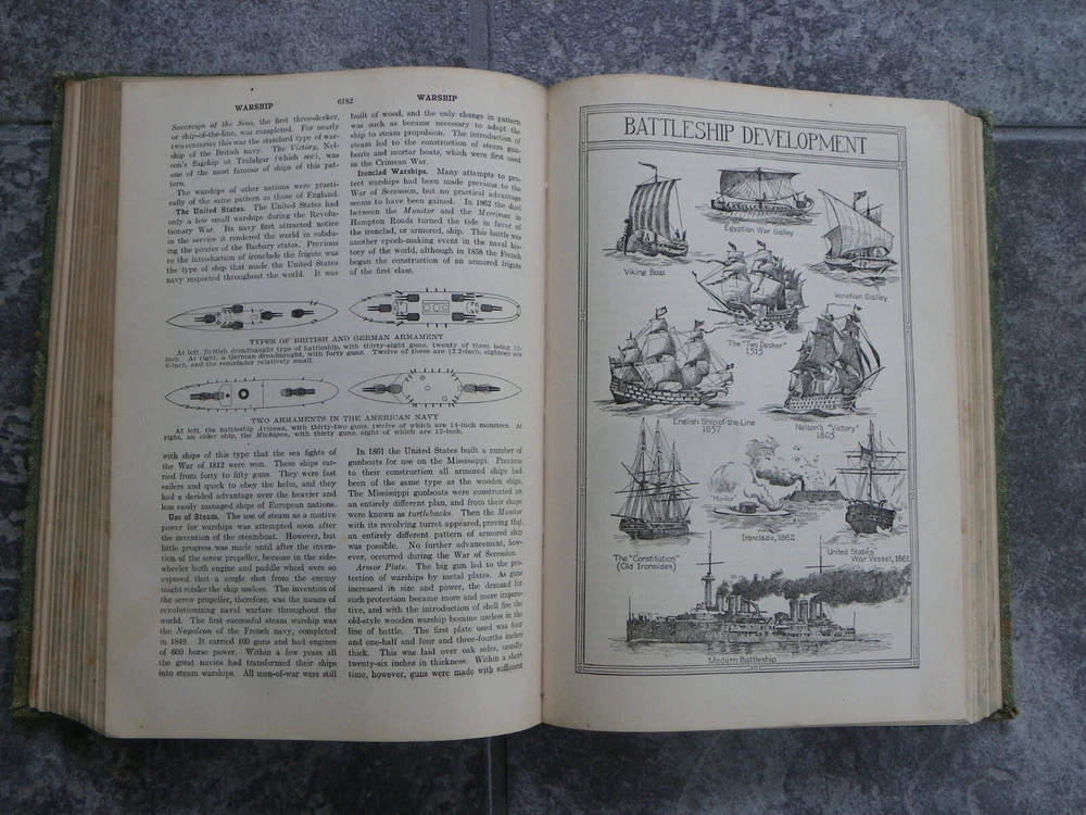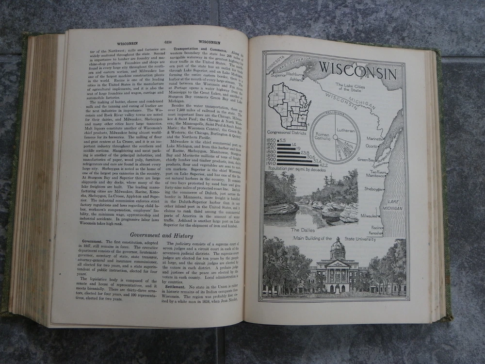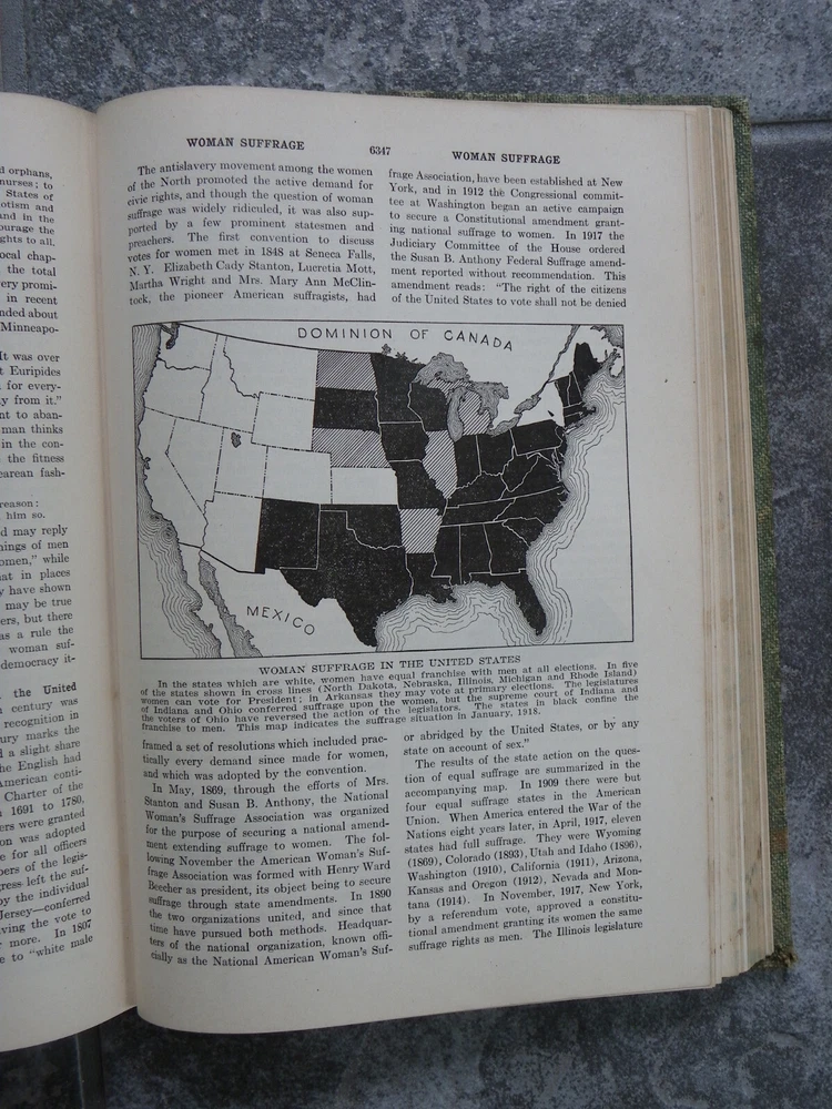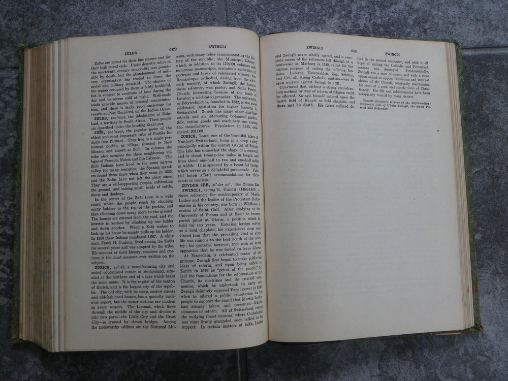 Offered is the antique leather-and-board encyclopedia "The World Book-Volume 8-Tie to Zwingli", published in Chicago by the Hanson-Roach-Fowler Co. in 1918, with a Hanson-Bellows copyright date of 1918. This is a very early edition of this popular encyclopedia, which debuted in 1917-possibly a second printing of the first edition? There are many black and white photos, illustrations and maps, plus at least one color illustration. The first and other very early editions of the World Book are rare; at the time of original listing I could only find three other volumes for sale on eBay, none volume 8. NOTE THAT THIS IS VOLUME 8 of 8 ONLY. The book is approx. 9 3/4" x 7" and contains 720 pages, numbered consecutively from previous volumes, including the index to the whole set. It is in fair to good condition overall. The hard black leather and green cloth cover has light to moderate wear, with considerable surface blotchiness. The gold words and symbol on the spine are still mostly shiny. There is no cracking inside either the front or back cover. The design endpapers have yellowed slightly but are otherwise mostly clean. I see no missing pages and most are well-attached to the binding but some are slightly loose. I see a couple with small tears and a few that have "dog-eared" corners. They have yellowed slightly but are otherwise mostly clean, with only occasional light foxing. I see no writing in the book. I have a lot of experience with vintage and antique books but am not an expert so please let me know if my description is missing information and you have additional questions. I will do my best to answer them! Please take a moment to look at some of the other items in my eBay store!
