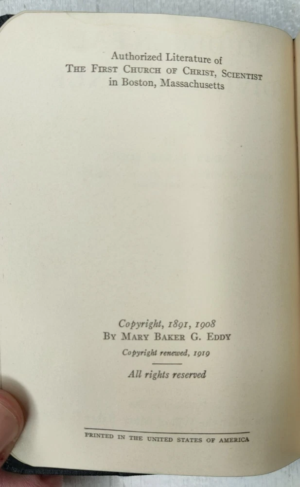 1919 Rudimental Divine Science Mary Baker Eddy Pocket Size Christian Healer. Two of the very first pages seem to be ripped out. But the book itself is fully intact. The missing pages are before the title and copyright pages.