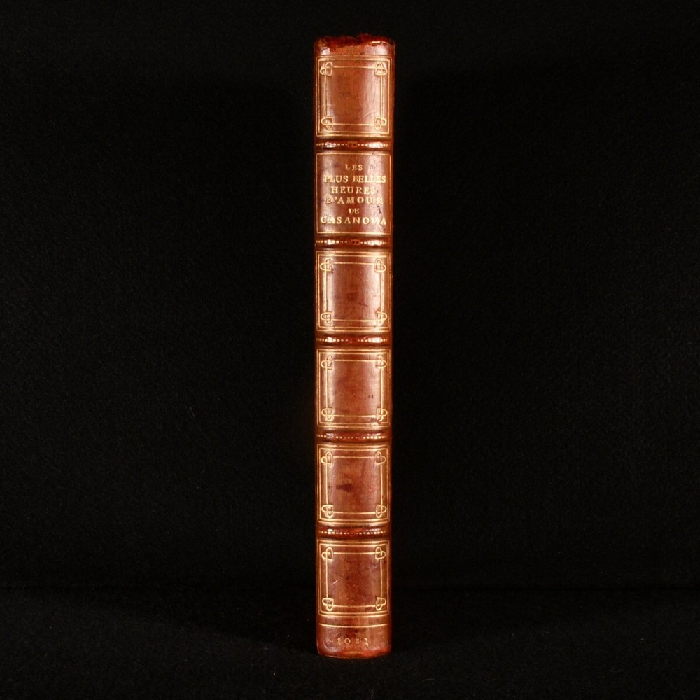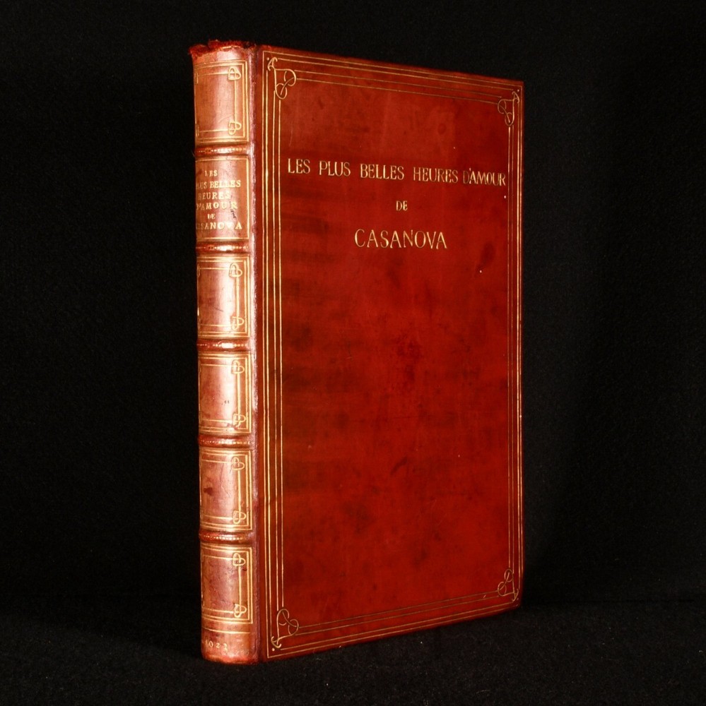 Click here to see our other books! Les Plus Belles Heures d'Amour de Casanova Giacomo Casanova; Edouard Maynial 1923 Les Editions G. Cres & Co. : Paris 10.5" by 7.5" x, 177pp SUMMARY A handsomely bound, limited edition copy of these memoirs of Georges Casanova, illustrated throughout. In French. Illustrated,Leather Binding,Limited Edition,Pleasing Copy,Rebound,Scarce Overall Condition: Very Good Indeed This book weighs 2 KG when packed UK Postage: £ 3.99 US Postage: £ 29.99 EU Postage : £ 21.99 European Postage: £ 23.99 Asia Postage: £ 37.99 Worldwide Postage: £ 38.99 DESCRIPTION A collection of amorous memoirs of Giacomo Casanova, Italian explorer and renowned womaniser. Including an introduction by Edouard Maynial. Including the illustrations of George Barbier engraved on wood by Georges Aubert. Part of a limited edition publishing of 1,026 copies, of which this is number 442. Previous owner's ink inscription to one of the front free-endpapers, dated 1940. CONDITION Handsomely bound in full calf binding with gilt stamping to the boards and spine. Externally, very smart, with minor shelf wear and small amount of rubbing to the head of the spine. Previous owner's ink inscription to one of the front free-endpapers. Internally, hinges are tender but firm. Volume is firmly bound. A few spots and handling marks to the first and last few pages, but otherwise pages are bright and clean. Overall Condition: Very Good Indeed GLOSSARY OF TERMS Overall Condition (Dustwrapper condition rating is shown after that for the book itself, where a dustwrapper is present) Fine - Very well preserved copy showing very little wear Very Good Indeed - Only one or two minor faults, really a very attractive copy Very Good - Quite a wide term meaning no major faults but probably several smaller ones often expected given the age of the book, but still a respectable copy Good - Meaning not very good. Some more serious faults as will be described in the condition report under 'condition' Good Only - Meaning one or more faults that could really do with repair Fair - As with good only above but with other faults leaving a compromised copy even after repair Poor - Really bad and possibly seriously incomplete. We only sell books in this condition where their rarity or value makes them attractive none the less. Major defects will be described. GUARANTEE We offer a full money back guarantee on our descriptions. Please ask for details and conditions. We prefer PAYPAL. If you pay via PAYPAL we will post the item off the same or the next working day with the postage you have selected. Please note we cannot accept USD cheques