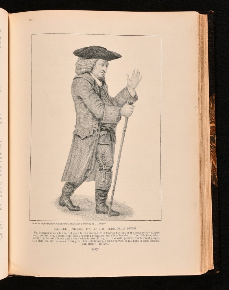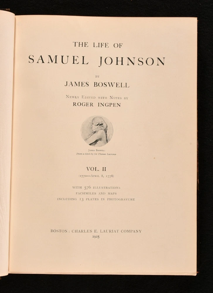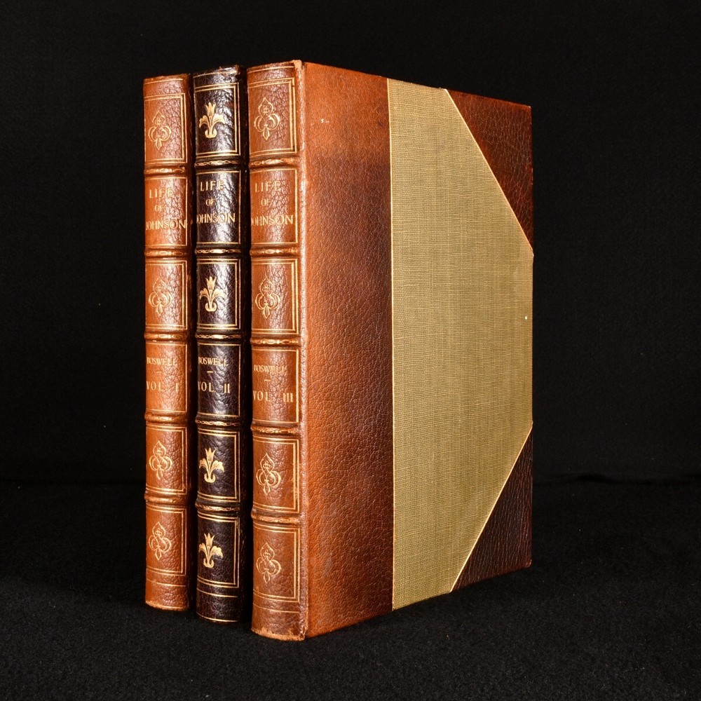 Click here to see our other books! The Life of Samuel Johnson James Boswell; Roger Ingpin 1925 Charles E. Lauriat Company : Boston 10" by 7.5" xxxvi, 364; xv, 365-762; xii, 763-1172pp. SUMMARY A new illustrated edition of James Boswell's famous biography of Samuel Johnson, complete in three volumes, two of which are in uniform Bayntun signed half morocco binding. Illustrated,Leather Binding,Pleasing Copy,Rebound,Signed Binding Overall Condition: Very Good This book weighs 5 KG when packed UK Postage: £ 4.49 US Postage: £ 42.99 EU Postage : £ 27.99 European Postage: £ 45.99 Asia Postage: £ 74.99 Worldwide Postage: £ 129.99 DESCRIPTION A collection complete in three volumes of this work by Scottish biographer James Boswell, often described as one of the greatest English biographies of all time. A new edition with edited with notes by Roger Ingpen. With numerous illustrations facsimile and maps, including thirteen plates in photogravure. Collated, complete. Samuel Johnson was an English author, well-known in the literary world for his many lasting contributions to various areas of humanist art, including poetry, essay-writing, biography, and more. He is described by the 'Oxford Dictionary of National Biographies' as the most distinguished man of letters in English history. This biography is notable for its extensive reports of Johnson's conversation, compiled through Boswell's acquaintance of Johnson since 1763. Originally published in 1791. This edition is reprinted from that prepared by Mr Mowbray Morris for the 'Globe' series of 1893. Volume I and III in uniform Bayntun signed half morocco bindings over cloth covered boards, volume II in attractive half morocco binding over pictorial paper covered boards. Complete with half titles. CONDITION Volume I and III in uniform Bayntun signed half morocco bindings over cloth covered boards, volume II in attractive half morocco binding over pictorial paper covered boards. With gilt to the top edges. Externally very smart with minor shelf war and minor rubbing to the spine and extremities. Volume III with a previous ownership inscription to the front free endpaper, dated 1946. Internally, firmly bound. The pages are bright and clean. With numerous illustrations facsimile and maps, including thirteen plates in photogravure. Collated, complete. Frontispieces are protected by tissue guards. Overall Condition: Very Good GLOSSARY OF TERMS Overall Condition (Dustwrapper condition rating is shown after that for the book itself, where a dustwrapper is present) Fine - Very well preserved copy showing very little wear Very Good Indeed - Only one or two minor faults, really a very attractive copy Very Good - Quite a wide term meaning no major faults but probably several smaller ones often expected given the age of the book, but still a respectable copy Good - Meaning not very good. Some more serious faults as will be described in the condition report under 'condition' Good Only - Meaning one or more faults that could really do with repair Fair - As with good only above but with other faults leaving a compromised copy even after repair Poor - Really bad and possibly seriously incomplete. We only sell books in this condition where their rarity or value makes them attractive none the less. Major defects will be described. GUARANTEE We offer a full money back guarantee on our descriptions. Please ask for details and conditions. We prefer PAYPAL. If you pay via PAYPAL we will post the item off the same or the next working day with the postage you have selected. Please note we cannot accept USD cheques