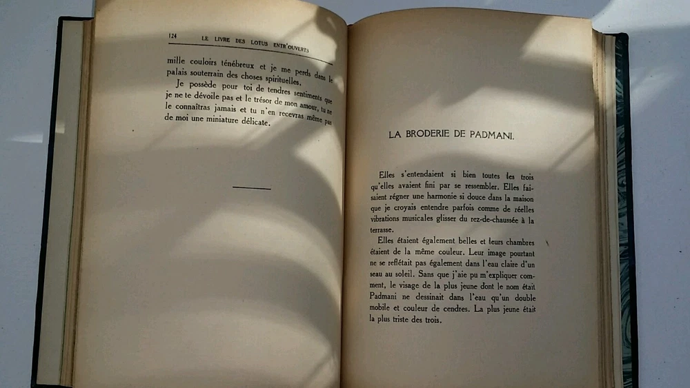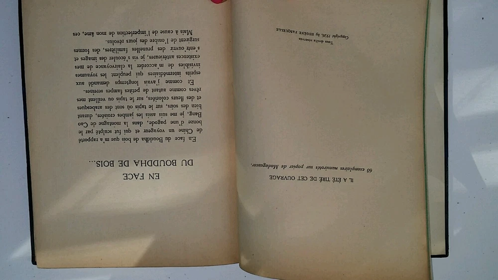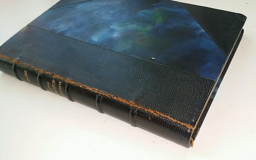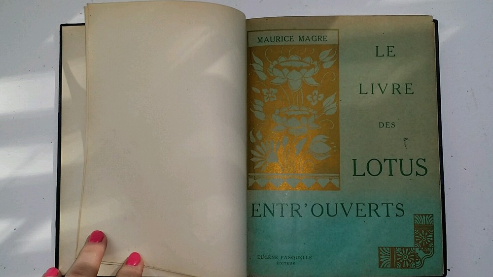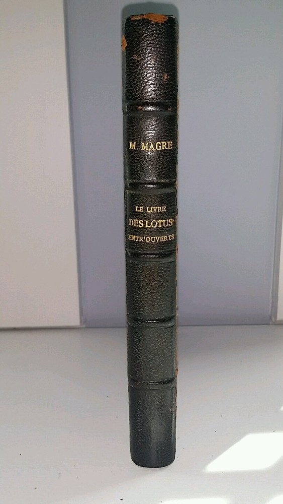 I brought some lovely things from my Victorian house in NJ to the new house in Florida. I don't have room for it all and am selling a large number of my collectibles. Background: I bought this piece at an auction in NJ that clears Manhattan estates. Description: This is a leather edition of a Magre's "Le Livre des Lotus Entr'Ouverts" in French . Published in 1926 by Eugene Fasquelle. It is categorized as one of his spiritually pieces. Marbleized end papers Opening page with an "illumination" like printing Blue leather spine and quarter panels Blue leather with gilding on spine, marbled paper on covers 203 pages Has a blue ribbon placeholder Gilding on top pages Marbled end papers Five raised bands on the spine Gilding on front and back covers and along spine Condition: Handsome book with some wear to spine and where board meets the spine Knocked corners Firmly bound Very minor yellowing of paper Please feel free to contact me if you have any questions. Background on the author: Sylvestre Bonnard, a member of the Institute, is a historian and philologist , gifted with great erudition. He lives among books, and launches himself into the research, in Sicily and Paris , of the precious manuscript of the French version of the Golden Legend , which he finally obtains. By chance he meets a young girl named Jeanne, the granddaughter of a woman he once loved. To protect the child from her abusive guardian Maitre Mouche, he takes her away, and she ends up marrying Henri Gelis, one of Bonnard's students.
