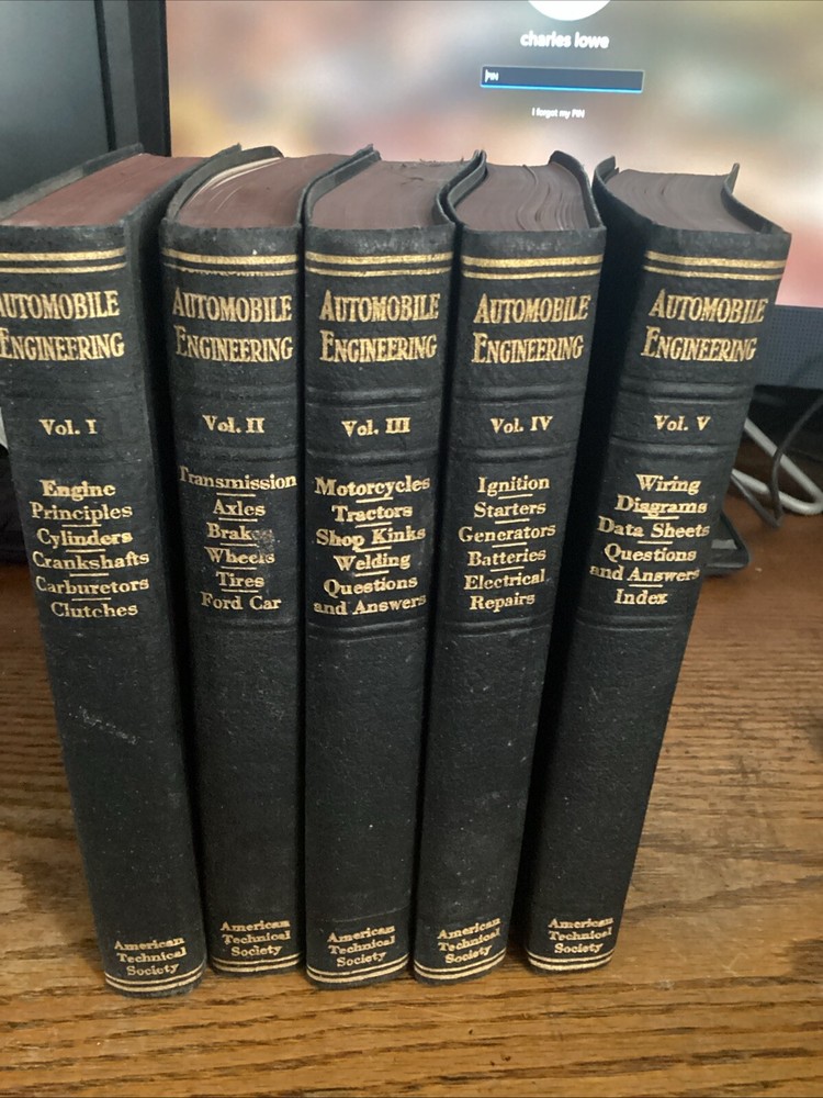 This is a set of 5 original 1927 Automobile Engineering books by the American Technical Society, written in English and focused on engineering topics. The books are leather-bound and illustrated, making them a valuable collectible for those interested in automotive history and technical reference materials from North America. The publisher, American Technical Society, produced this comprehensive set which is a part of antiquarian and collectible books.