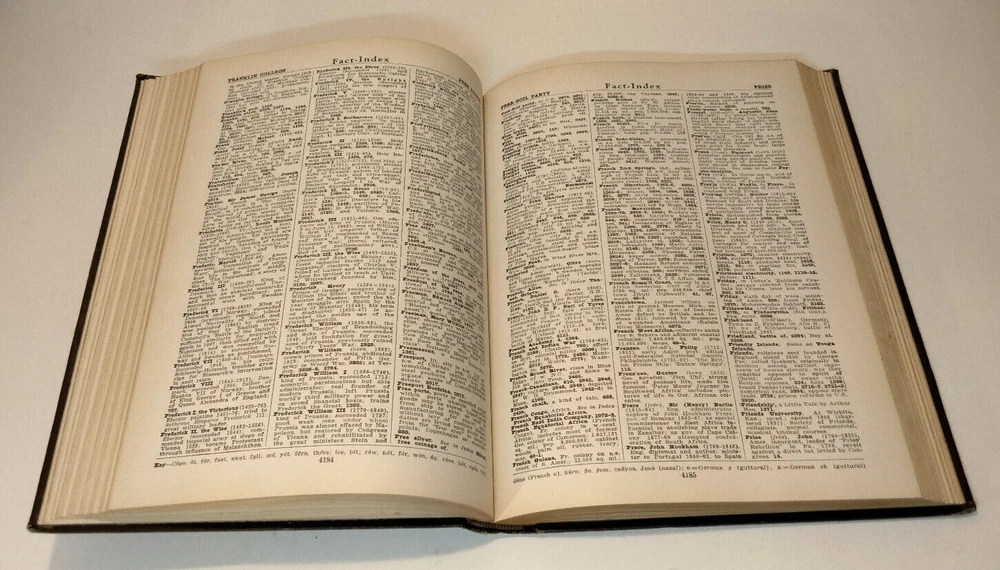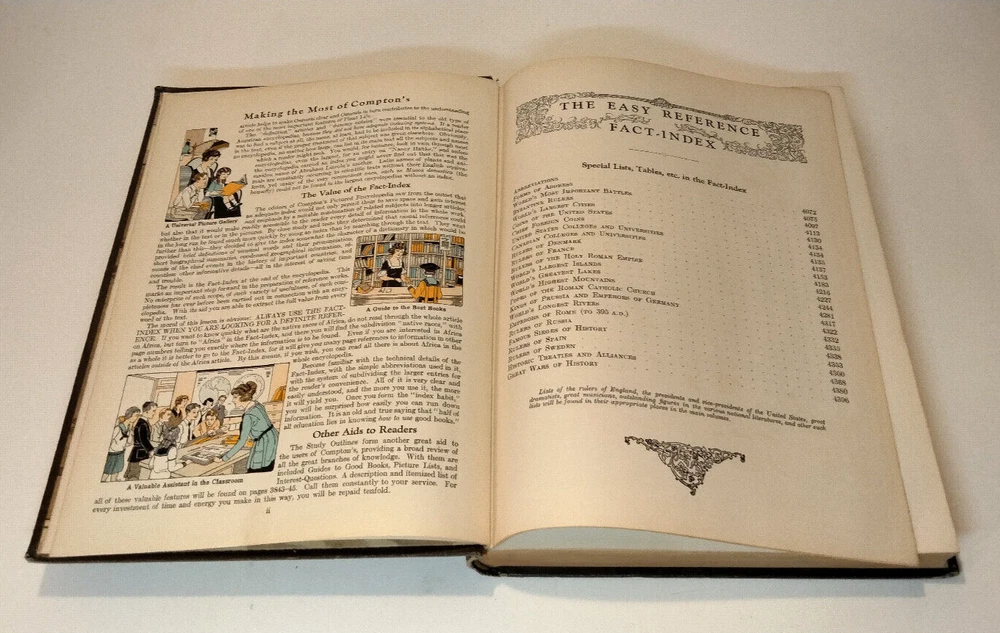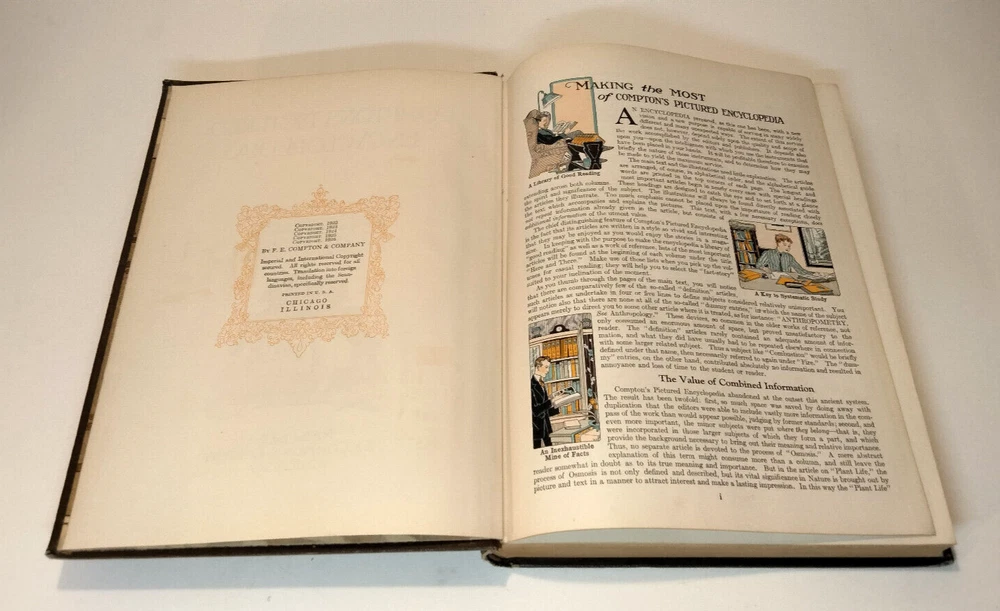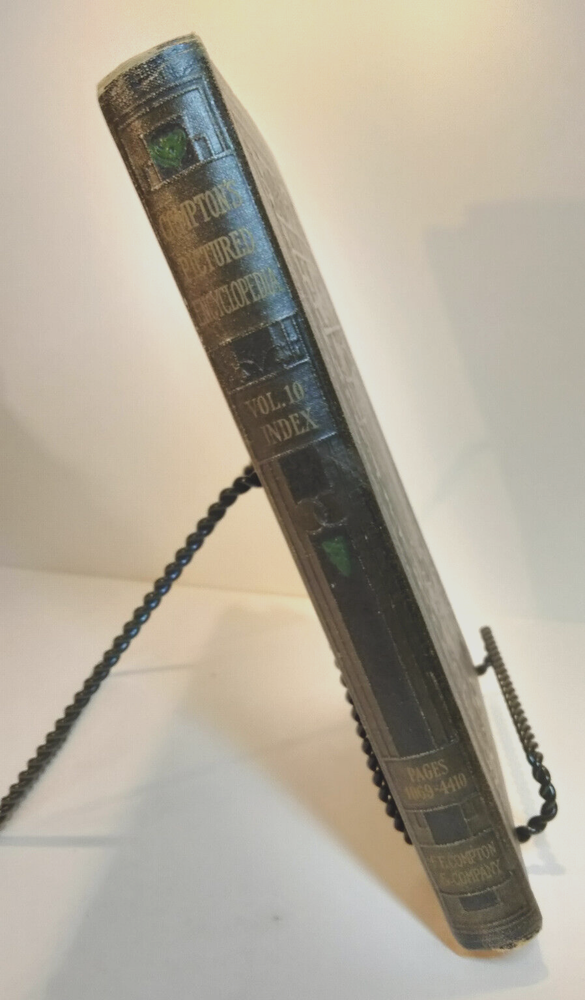 For sale is Volume 10, Index, of Compton's Pictured Encyclopedia 1927 edition. Published by F.E. Compton and Company of Chicago. This is a leather bound book that is 341 pages in length. It is a fascinating and detailed look at the world of the 1920's. First published in 1922, Compton's Pictured Encyclopedia was unique in its unprecedented number of pictures and illustrations. These books are incredible just for all of the pictures themselves, in a time where opportunities for photographs were few and far between. Additionally, there are a number of color illustrations, which was not nearly as common at the time. Ultimately F.E. Compton and Company was purchased by Encyclopedia Britannica in the early 1960's, and its modern continuation is published under the name of "Compton's by Britannica". See description above. Ships with USPS Media Mail.