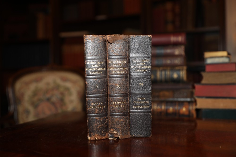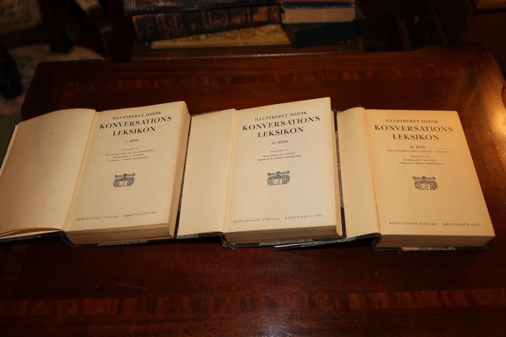 A stunning and rare 3-volume set of Illustreret Dansk Konversations Leksikon (Illustrated Danish Conversational Encyclopedia), published between 1924 and 1927 by Berlingske Forlag in Copenhagen. These elegantly bound books feature a classic half-leather design with marbled boards, gilt lettering on the spines, and gold-embossed details. This set provides a glimpse into early 20th-century Danish knowledge and culture, featuring a wealth of illustrated content. While the bindings show wear, including scuffed edges and minor damage to the spine, the interiors remain in good condition with clear and legible pages. These books would make a beautiful addition to any antique book collection, Scandinavian literature archive, or vintage decor display. Year: 1924-1927 Price: $95 Keywords: Antique books, Danish encyclopedia, leather-bound books, rare book set, vintage reference books, 1920s books, Scandinavian history, Berlingske Forlag, collectible books, European antiques.