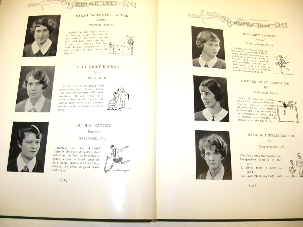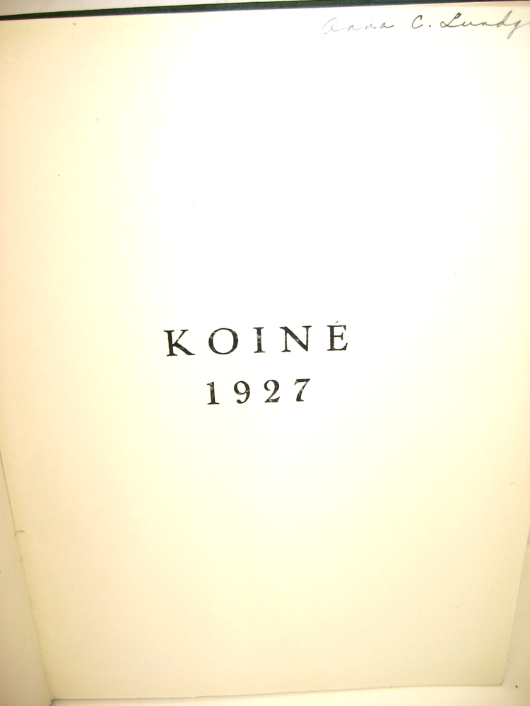 We will be listing rare, original junior high school, high school and college yearbooks from time to time with FREE PRIORITY MIAL SHIPPING to US addresses . Many of them are old, up to 100+ years in some cases, and have usually been on someone's library shelf or attic for a long time. Where specific condition issues require we will let you know about them. If you are wondering if someone is in a yearbook, let us know and we will try to go through the book and let you know. The yearbook in this listing is: * TITLE : KOINE * SCHOOL or COLLEGE : Connecticut College, New London, Connecticut * YEAR/CLASS OF : 1927 * WRITING/AUTOGRAPHS : Yes * CONDITION ISSUES : - This book is in very good condition - There is a light to moderate amount of writing inside * ADDITIONAL INFO : - SHIPPING: * FREE PRIORITY MAIL SHIPPING in the USA * This item can be picked up here in Coventry, CT at no charge. * Or it will be shipped within 1 business day after receipt of payment via Priority Mail. * 100% SATISFACTION GUARANTEED! We want our customers to be happy! If the item is not as described we will refund purchase price and postage if it is returned within 30 days of receipt and in the same condition. * Please contact us if you have any questions or would like additional photos.