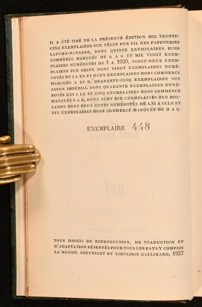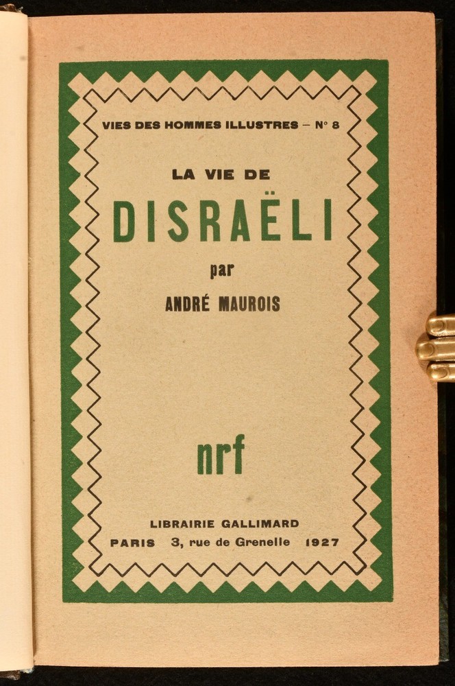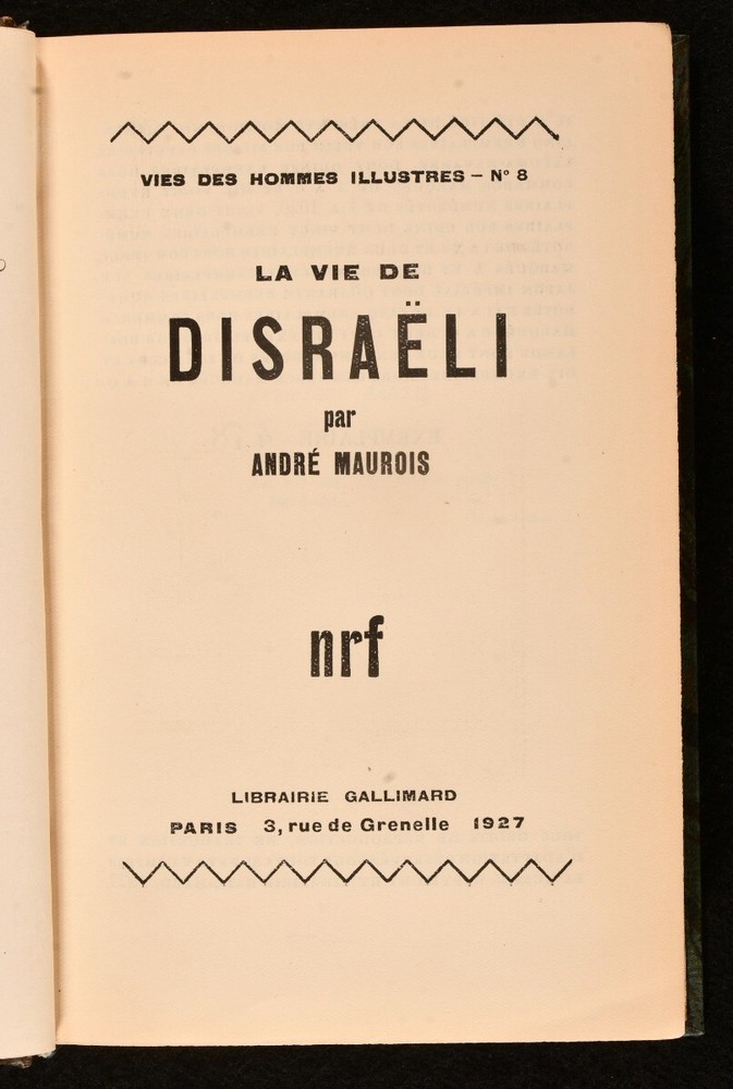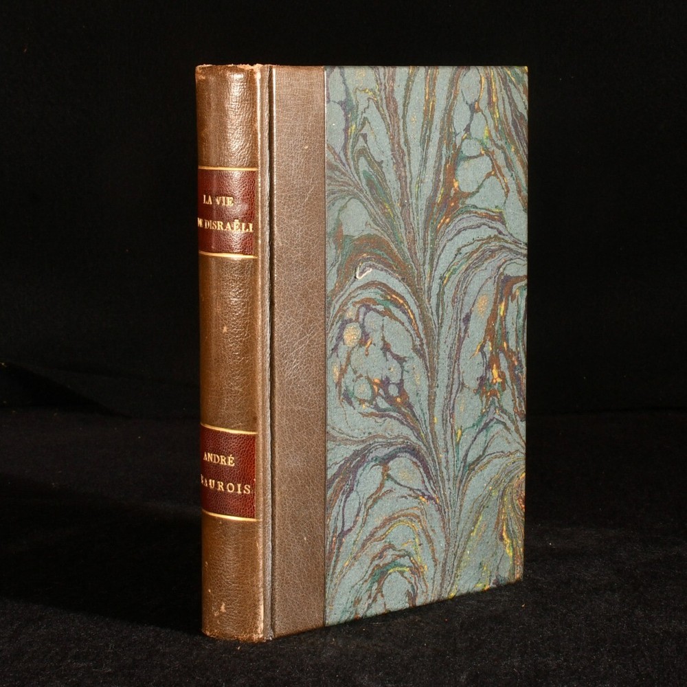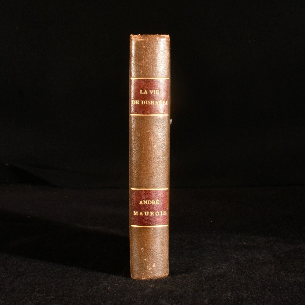 Click here to see our other books! La Vie de Disraeli Andre Maurois 1927 Gallimard : Paris 7.5" by 4.5" [8], iv, 340pp SUMMARY A smart leather bound, limited edition copy of this French biography of Benjamin Disraeli. Leather Binding,Limited Edition,Signed Binding Overall Condition: Very Good Indeed This book weighs 1 KG when packed UK Postage: £ 3.99 US Postage: £ 22.99 EU Postage : £ 16.99 European Postage: £ 17.99 Asia Postage: £ 22.99 Worldwide Postage: £ 28.99 DESCRIPTION Limited edition, being number 448 of 1020. In the original French. From the series, the lives of great men, this is a biography of Benjamin Disraeli. Disraeli was a British statesman, Conservative politician and served as Prime Minister of the United Kingdom twice. Signed binding by G. Schroeder, with the original paper wraps and spine bound within. With a previous owner bookplate to the front pastedown for Marie Louise Maxwell-Scott. CONDITION In quarter leather with marbled boards. Externally, very smart indeed with just light rubbing to the spine. With a previous owner bookplate to the front pastedown for Marie Louise Maxwell-Scott. Internally, firmly bound with bright and clean pages. Overall Condition: Very Good Indeed GLOSSARY OF TERMS Overall Condition (Dustwrapper condition rating is shown after that for the book itself, where a dustwrapper is present) Fine - Very well preserved copy showing very little wear Very Good Indeed - Only one or two minor faults, really a very attractive copy Very Good - Quite a wide term meaning no major faults but probably several smaller ones often expected given the age of the book, but still a respectable copy Good - Meaning not very good. Some more serious faults as will be described in the condition report under 'condition' Good Only - Meaning one or more faults that could really do with repair Fair - As with good only above but with other faults leaving a compromised copy even after repair Poor - Really bad and possibly seriously incomplete. We only sell books in this condition where their rarity or value makes them attractive none the less. Major defects will be described. GUARANTEE We offer a full money back guarantee on our descriptions. Please ask for details and conditions. We prefer PAYPAL. If you pay via PAYPAL we will post the item off the same or the next working day with the postage you have selected. Please note we cannot accept USD cheques