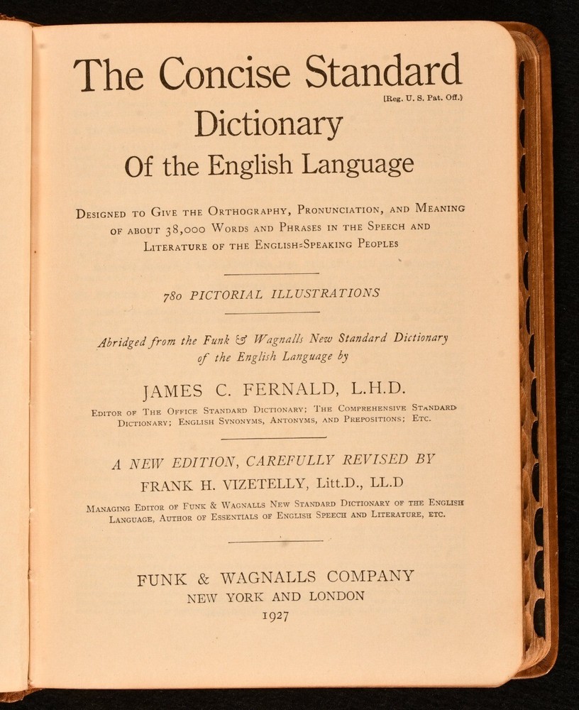 Click here to see our other books! The Concise Standard Dictionary of the English Language James C. Fernald; Frank H. Vizetelly 1927 Funk & Wagnalls Company : New York and London 6.5" by 5" vi, 583pp. SUMMARY A smart copy of this illustrated concise standard English dictionary. Illustrated,Leather Binding Overall Condition: Good This book weighs 0.75 KG when packed UK Postage: £ 3.99 US Postage: £ 19.99 EU Postage : £ 15.99 European Postage: £ 16.99 Asia Postage: £ 21.99 Worldwide Postage: £ 25.99 DESCRIPTION Illustrated with seven hundred and eighty illustrations in-text. A standard and concise English dictionary designed to provide the orthography, pronunciation, and meaning of words and phrases in the speech and literature of English speaking peoples. Abridges from the Funk & Wagnalls New Standard Dictionary of the English Language by James Champlin Fernald, and American clergyman and author considered an authority on the English language. Revised by Frank Horace Vizetelly, an English-American lexicographer, etymologist, and editor. CONDITION In the original full brown calf binding with ivorine embellishment to the front board. Externally, very smart with light shelf wear and minor fading to the spine and extremities. The odd mark to the board. Front hinge tender with spine loosening from textblock. Internally, firmly bound. Pages are very bright and clean throughout. Contemporary ink inscription to the front endpaper dated 1927. Overall Condition: Good GLOSSARY OF TERMS Overall Condition (Dustwrapper condition rating is shown after that for the book itself, where a dustwrapper is present) Fine - Very well preserved copy showing very little wear Very Good Indeed - Only one or two minor faults, really a very attractive copy Very Good - Quite a wide term meaning no major faults but probably several smaller ones often expected given the age of the book, but still a respectable copy Good - Meaning not very good. Some more serious faults as will be described in the condition report under 'condition' Good Only - Meaning one or more faults that could really do with repair Fair - As with good only above but with other faults leaving a compromised copy even after repair Poor - Really bad and possibly seriously incomplete. We only sell books in this condition where their rarity or value makes them attractive none the less. Major defects will be described. GUARANTEE We offer a full money back guarantee on our descriptions. Please ask for details and conditions. We prefer PAYPAL. If you pay via PAYPAL we will post the item off the same or the next working day with the postage you have selected. Please note we cannot accept USD cheques