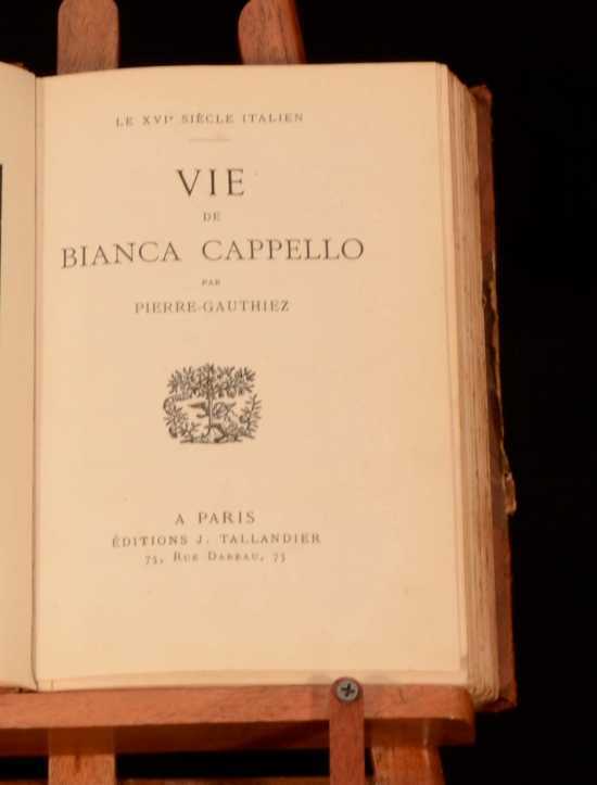 Click here to see our other books! Vie de Bianca Cappello Pierre-Gauthiez 1928 Jules Tallandier : Paris 8" by 5" 221pp SUMMARY A fascinating biography on the life of the Italian noblewoman Bianna Cappello. Illustrated,Leather Binding Overall Condition: Very Good This book weighs 0.5 KG when packed UK Postage: £ 3.99 US Postage: £ 15.99 EU Postage : £ 13.99 European Postage: £ 14.99 Asia Postage: £ 18.99 Worldwide Postage: £ 19.99 DESCRIPTION In French. A 1928 edition of Pierre-Guathiez's 1862 biography of Bianca Cappello, a sixteenth-century Italian noblewoman. Bianca Coppello was the mistress, and afterward second wife, of Francesco L de' Medici, Grand Duke of Tuscany, who later made her his consort. The edition is illustrated throughout, including photographs. Features a frontispiece portrait of Cappello. CONDITION In a half-calf binding with marbled paper to the boards. Externally, with slight rubbing and wear to the extremities. Internally firmly bound. Pages are generally bright and clean with some odd spots. A little edgewear to some pages. Overall Condition: Very Good GLOSSARY OF TERMS Overall Condition (Dustwrapper condition rating is shown after that for the book itself, where a dustwrapper is present) Fine - Very well preserved copy showing very little wear Very Good Indeed - Only one or two minor faults, really a very attractive copy Very Good - Quite a wide term meaning no major faults but probably several smaller ones often expected given the age of the book, but still a respectable copy Good - Meaning not very good. Some more serious faults as will be described in the condition report under 'condition' Good Only - Meaning one or more faults that could really do with repair Fair - As with good only above but with other faults leaving a compromised copy even after repair Poor - Really bad and possibly seriously incomplete. We only sell books in this condition where their rarity or value makes them attractive none the less. Major defects will be described. GUARANTEE We offer a full money back guarantee on our descriptions. Please ask for details and conditions. We prefer PAYPAL. If you pay via PAYPAL we will post the item off the same or the next working day with the postage you have selected. Please note we cannot accept USD cheques