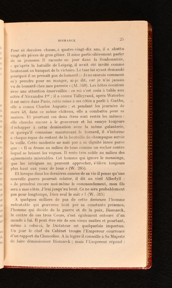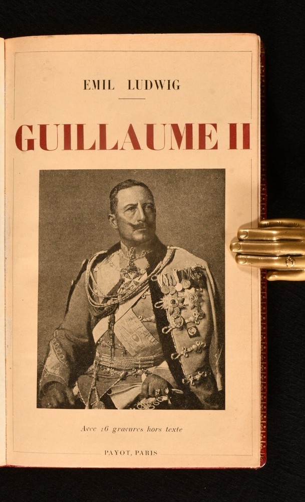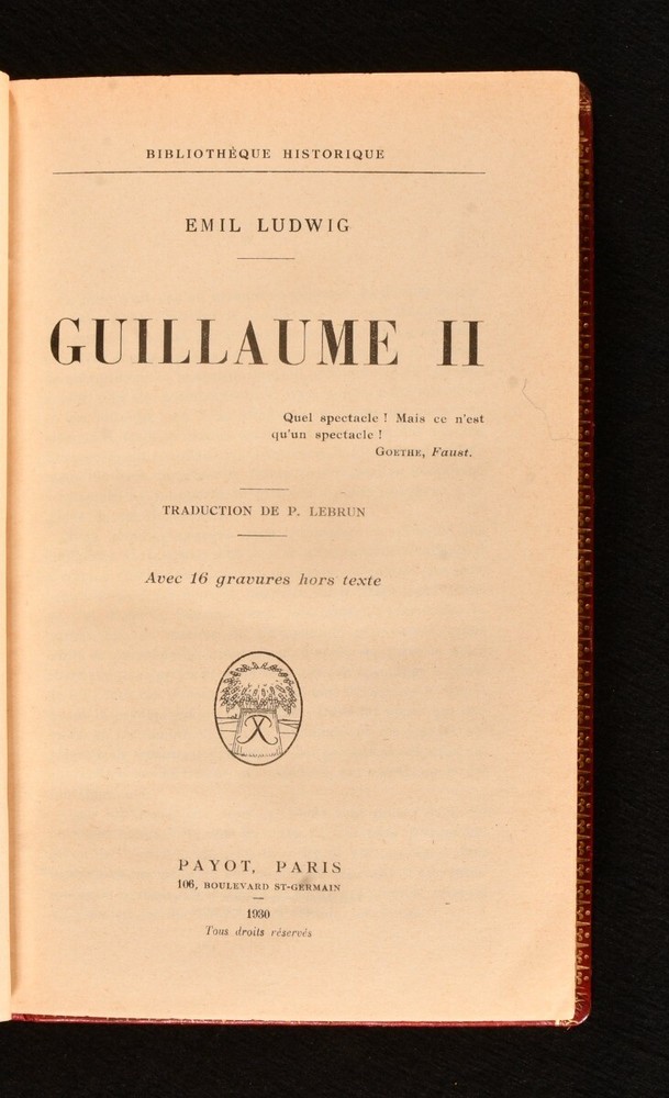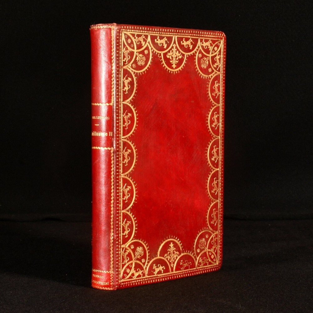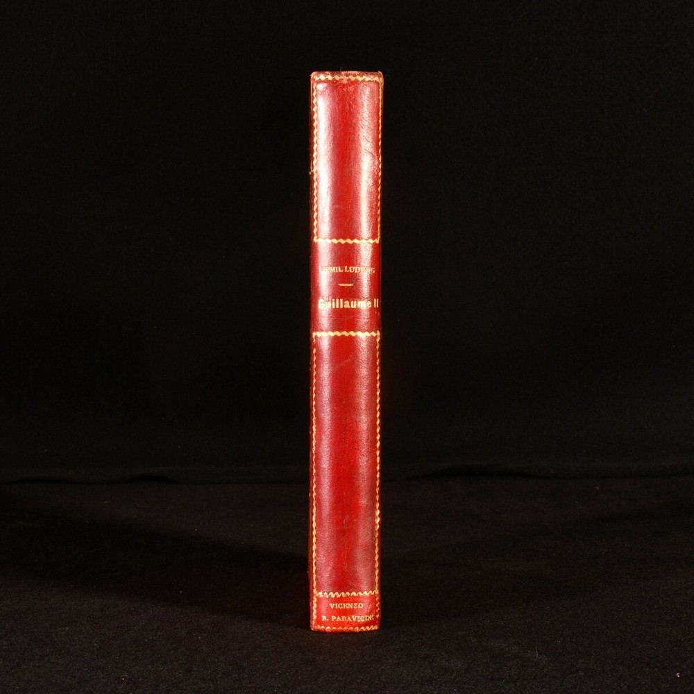 Click here to see our other books! Bibliotheque Historique: Guillaume II Emil Ludwig; P. Lebrun [trans.] 1930 Payot : Paris 9" by 5.5" 445pp. (1) SUMMARY A first edition copy of Emil Ludwig's biography of the German Emperor Wilhelm II, translated by Lebrun, in an exquisite binding. Fine Binding,First Edition,Illustrated,Leather Binding Overall Condition: Fine This book weighs 0.75 KG when packed UK Postage: £ 3.99 US Postage: £ 19.99 EU Postage : £ 15.99 European Postage: £ 16.99 Asia Postage: £ 21.99 Worldwide Postage: £ 25.99 DESCRIPTION The first edition of this work in a full polished calf binding, with gilt decoration to the boards, spine, and square. All edges gilt and gauffered. A biography of the last German Emperor and the King of Prussia, Wilhelm II (1859-1941), which forms part of the Bibliotheque Historique series. This biography was written by the German-Swiss author Emil Ludwig (1881-1948), known for his accessible and engaging biographies. The text has been translated to French by P. Lebrun. CONDITION In a full calf binding. Externally bright and very smart, with just a little rubbing to the extremities. Internally, firmly bound. Pages are age toned but clean. Overall Condition: Fine GLOSSARY OF TERMS Overall Condition (Dustwrapper condition rating is shown after that for the book itself, where a dustwrapper is present) Fine - Very well preserved copy showing very little wear Very Good Indeed - Only one or two minor faults, really a very attractive copy Very Good - Quite a wide term meaning no major faults but probably several smaller ones often expected given the age of the book, but still a respectable copy Good - Meaning not very good. Some more serious faults as will be described in the condition report under 'condition' Good Only - Meaning one or more faults that could really do with repair Fair - As with good only above but with other faults leaving a compromised copy even after repair Poor - Really bad and possibly seriously incomplete. We only sell books in this condition where their rarity or value makes them attractive none the less. Major defects will be described. GUARANTEE We offer a full money back guarantee on our descriptions. Please ask for details and conditions. We prefer PAYPAL. If you pay via PAYPAL we will post the item off the same or the next working day with the postage you have selected. Please note we cannot accept USD cheques