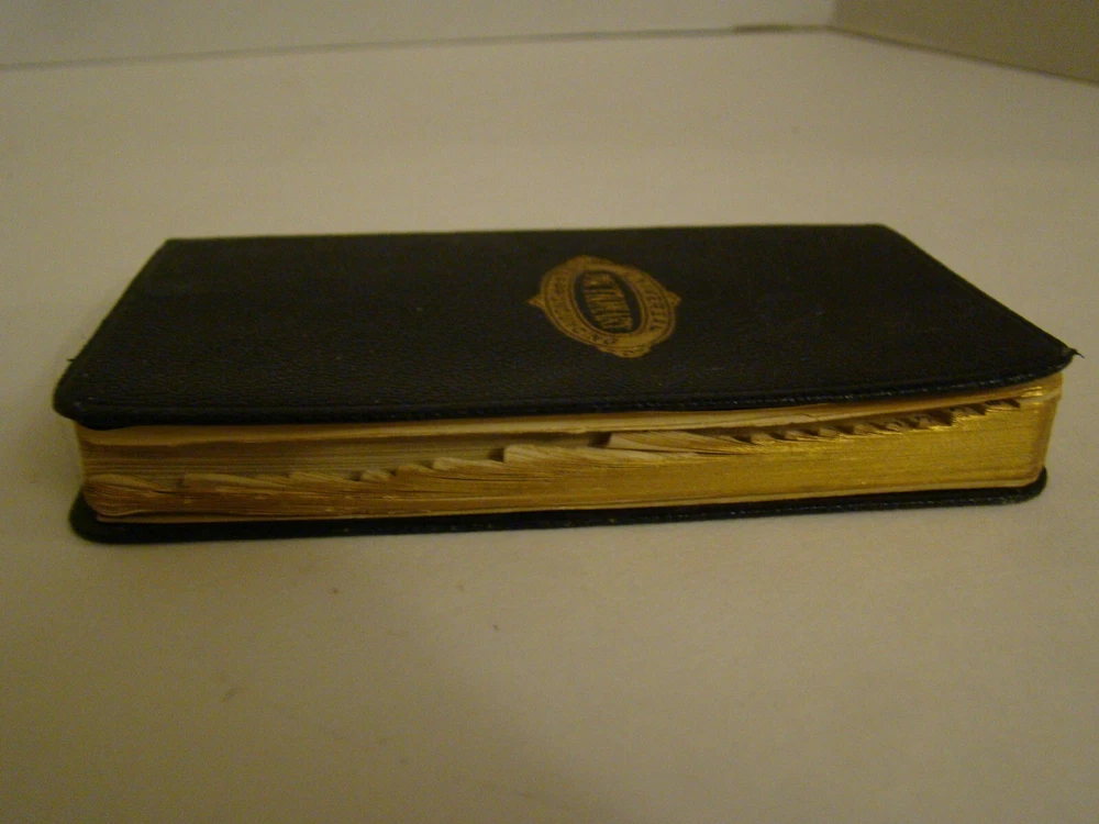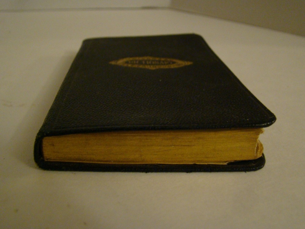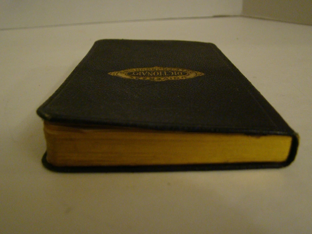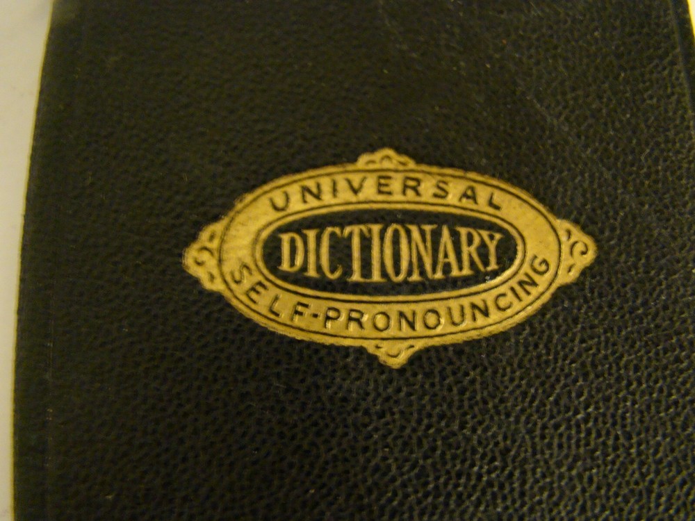 This dictionary measures 3 inches by 5 inches. It includes a section on weights and measures, and postal rates at the time it was published. Some of the letter tabs are bent.