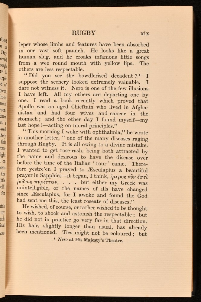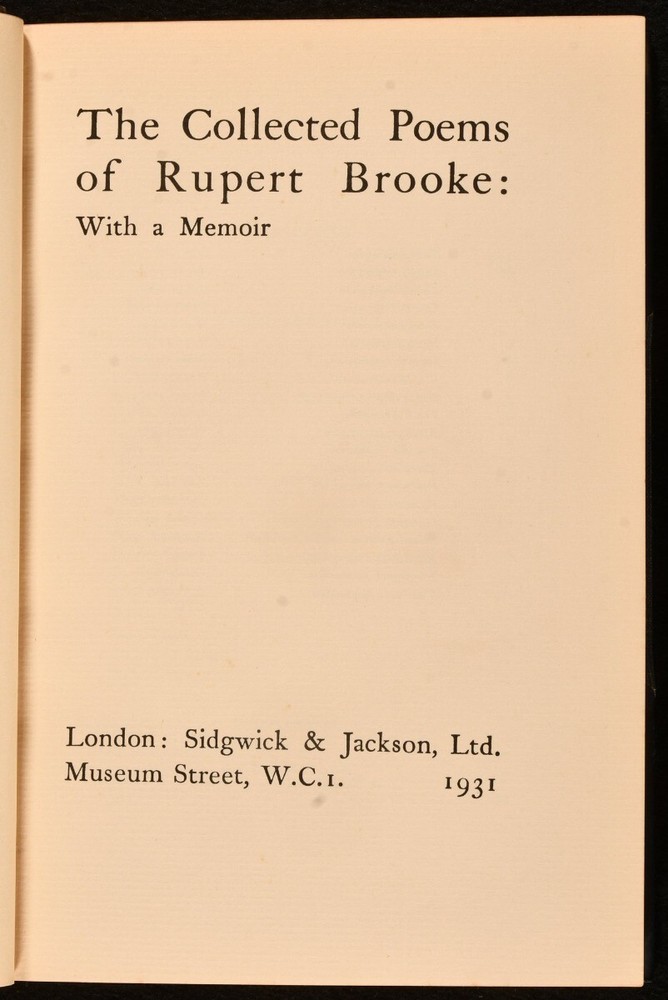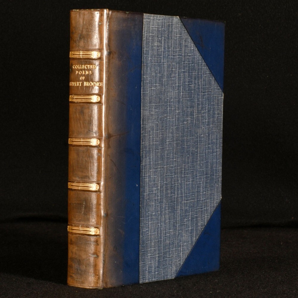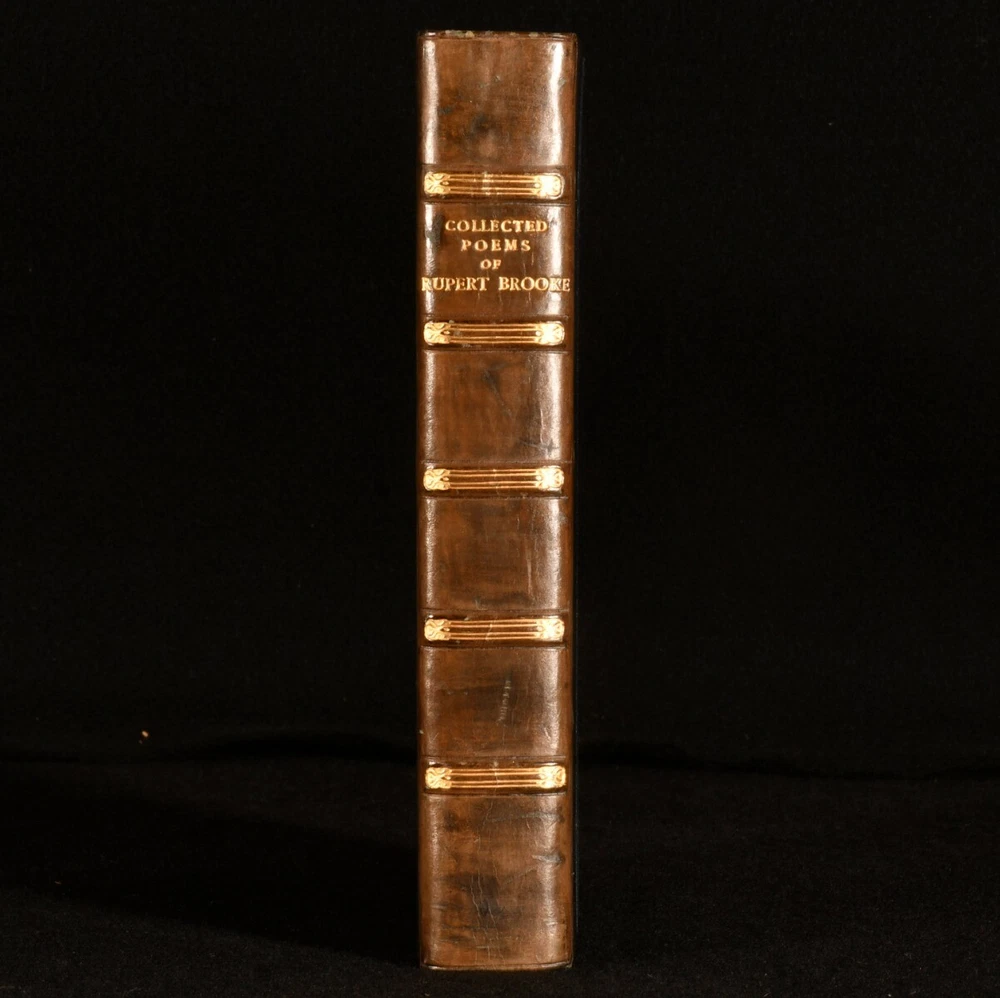 Click here to see our other books! The Collected Poems of Rupert Brooke With a Memoir Rupert Brooke 1931 Sidgwick & Jackson Ltd : London 8" by 5.5" clviii, 162pp. SUMMARY A very neat edition of this collection of poetry by Rupert Brook with a memoir. Leather Binding,Original Binding,Publishers' Original Binding Overall Condition: Very Good Indeed This book weighs 0.75 KG when packed UK Postage: £ 3.99 US Postage: £ 19.99 EU Postage : £ 15.99 European Postage: £ 16.99 Asia Postage: £ 21.99 Worldwide Postage: £ 25.99 DESCRIPTION Twentieth impression. Illustrated with frontispiece and one portrait plate. Collated complete. The memoir of Rupert Brooke, an English poet known for his idealist war sonnets written during the First World War. Includes a collection of his poetry, such as: Second Best, Blue Evening, Beauty and Beauty, and The Great Lover. CONDITION In the original half calf binding with blue cloth boards. Externally, very smart with minor shelf wear and light discolouration of the spine. Internally, firmly bound. Pages are very bright and clean. Contemporary ink inscription to front endpaper. Previous owner's bookplate to front endpaper. Overall Condition: Very Good Indeed GLOSSARY OF TERMS Overall Condition (Dustwrapper condition rating is shown after that for the book itself, where a dustwrapper is present) Fine - Very well preserved copy showing very little wear Very Good Indeed - Only one or two minor faults, really a very attractive copy Very Good - Quite a wide term meaning no major faults but probably several smaller ones often expected given the age of the book, but still a respectable copy Good - Meaning not very good. Some more serious faults as will be described in the condition report under 'condition' Good Only - Meaning one or more faults that could really do with repair Fair - As with good only above but with other faults leaving a compromised copy even after repair Poor - Really bad and possibly seriously incomplete. We only sell books in this condition where their rarity or value makes them attractive none the less. Major defects will be described. GUARANTEE We offer a full money back guarantee on our descriptions. Please ask for details and conditions. We prefer PAYPAL. If you pay via PAYPAL we will post the item off the same or the next working day with the postage you have selected. Please note we cannot accept USD cheques