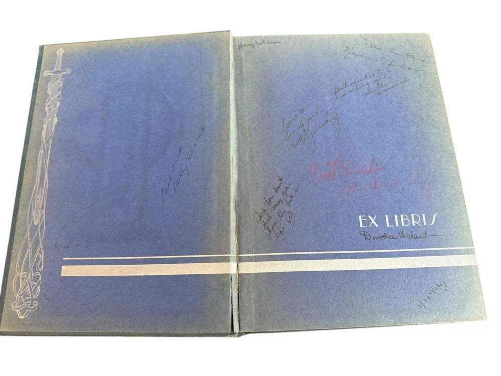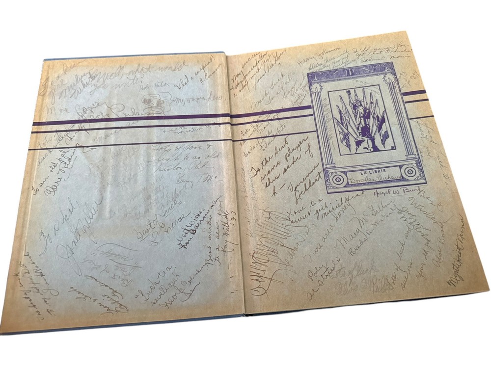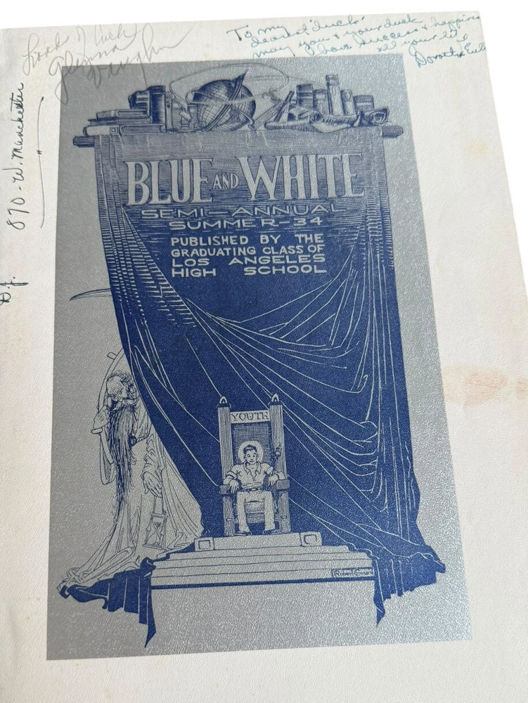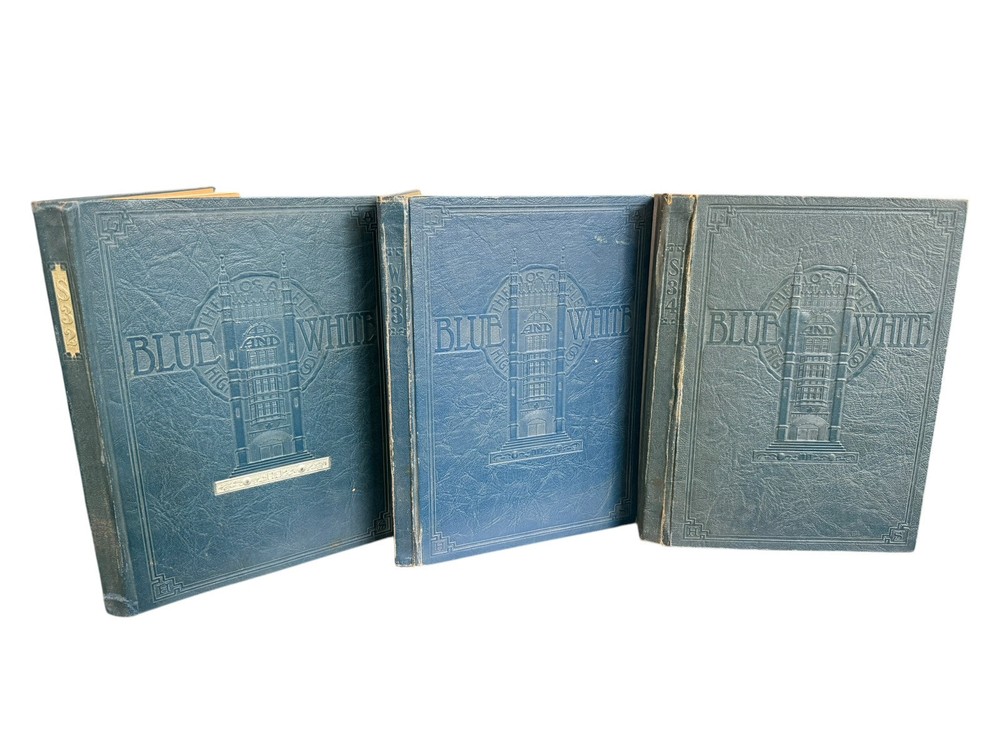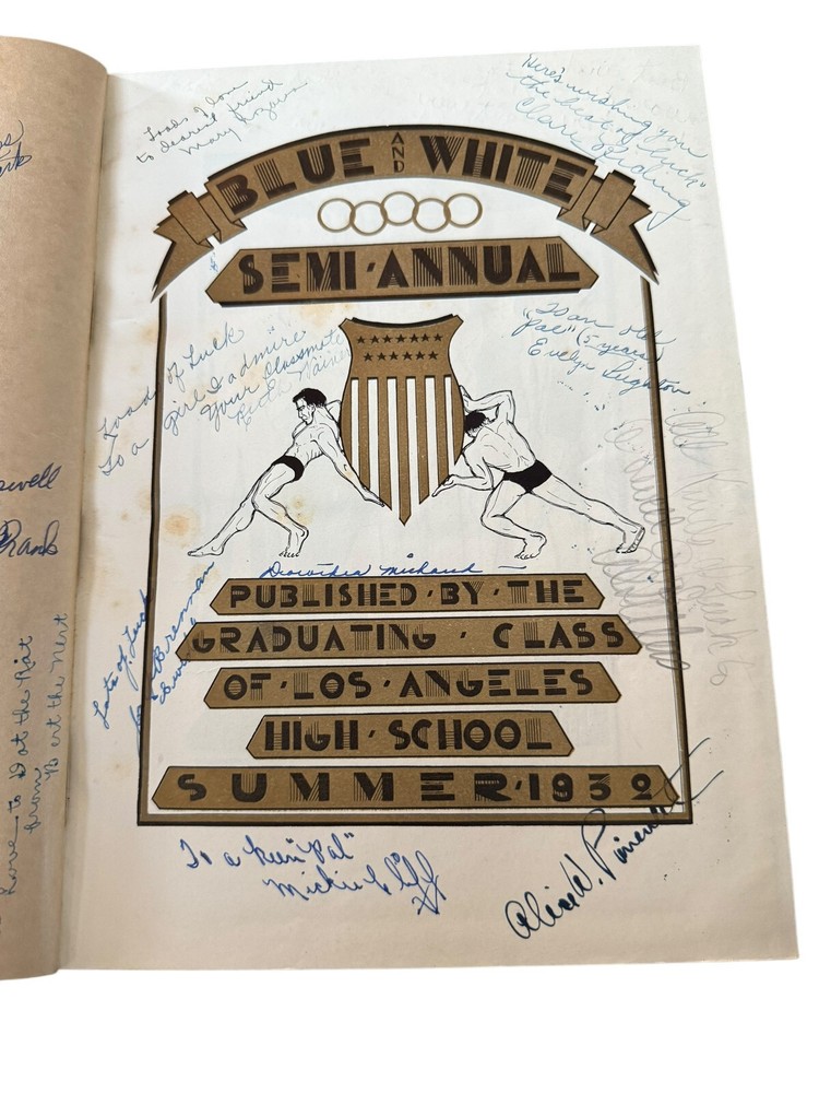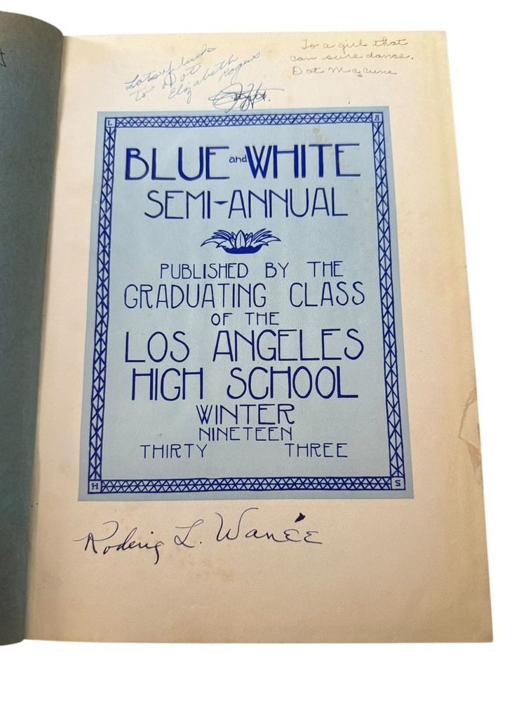 Blue and White Semi-Annual Yearbooks Published by the Graduating Classes of Los Angeles High School Winter 1932, Summer 1933, Winter 1934 Condition: • Bindings: Secure for 1932 and 1933; 1934 has a split at the front endpapers, causing the front board to be somewhat loose. • Covers: Leather bindings with embossed titles and school imagery. Some wear, with edge rubbing and spine stress. • Text Blocks: Toning consistent with age, but pages remain intact with no major losses. • Inscriptions: Heavily inscribed throughout, with numerous handwritten messages from classmates. • Interior: Illustrated endpapers featuring artistic school-related imagery. Some mild foxing and handling wear. Description: This three-volume set of The Blue and White Semi-Annual, the yearbook of Los Angeles High School, spans Winter 1932, Summer 1933, and Winter 1934. These books provide an in-depth snapshot of early 1930s Los Angeles student life, featuring class photos, clubs, sports teams, faculty, and student achievements. Each volume is profusely signed, offering a personal glimpse into the friendships and aspirations of students during the Great Depression era. The artistic cover designs and stylized title pages reflect period aesthetics, and the inscriptions add an irreplaceable personal touch. Los Angeles High School is one of the oldest public schools in California, and these books are excellent for alumni, collectors, and historians. Ships securely and promptly with proper packaging.