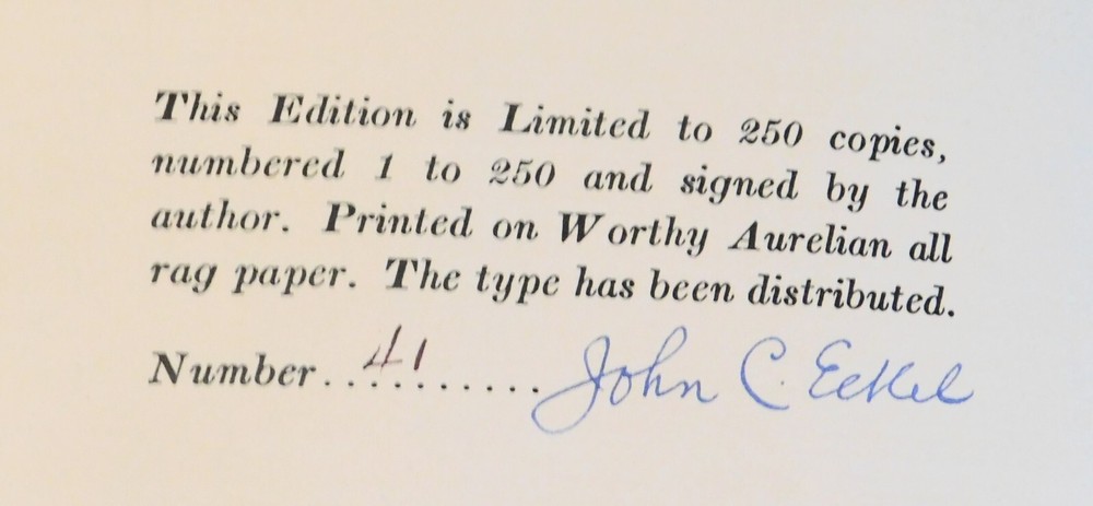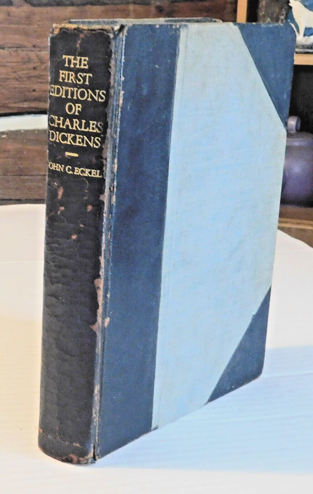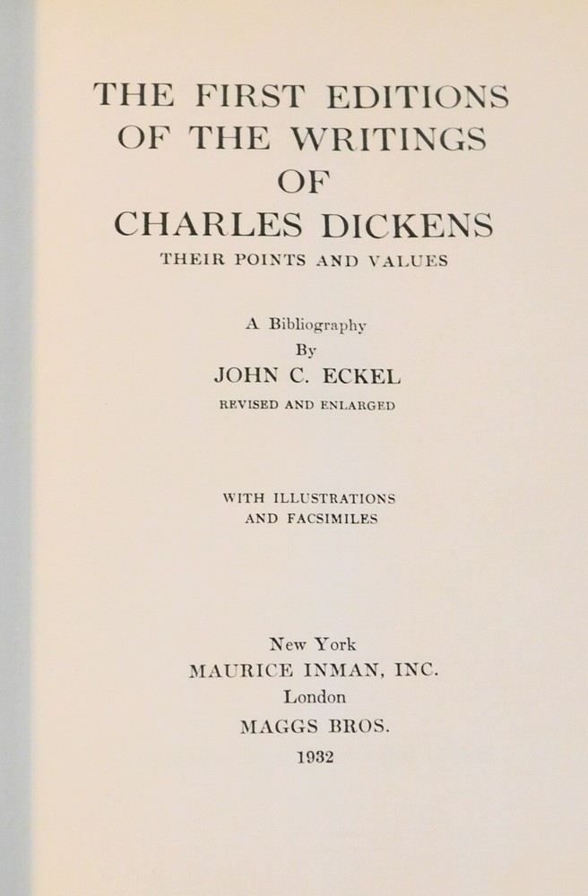 ( Dickens, Charles). Eckel, John C. THE FIRST EDITIONS OF THE WRITINGS OF CHARLES DICKENS, THEIR POINTS AND VALUES. A Bibliography. NY: Maurice Inman, Inc. / London: Maggs Bros., 1932. Large octavo, black calf backed gray cloth with corners bound in black calf; t.e.g. The leather is heavily rubbed & scuffed. xvi & 272 pp. Pastedowns and endpapers darkened. Illustrated with frontispiece & facsimiles. Internally very nice. Revised and enlarged edition. No. 41 of 250 copies signed by Eckel. I UNCONDITIONALLY GUARANTEE THE AUTHENTICITY OF THE ABOVE AUTOGRAPH! TERMS: Shipping charges are calculated based on the total packed weight of this item. New York State residents will be assessed and charged the relevant sales tax. All items are guaranteed authentic and as described. Be sure to add me to your favorites list ! Check out my other items !