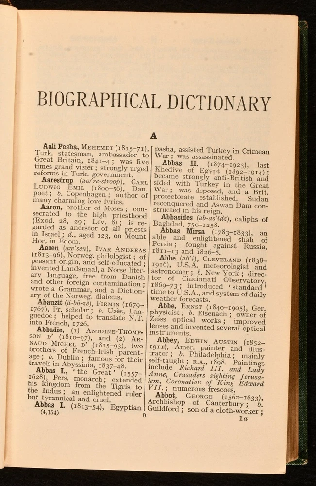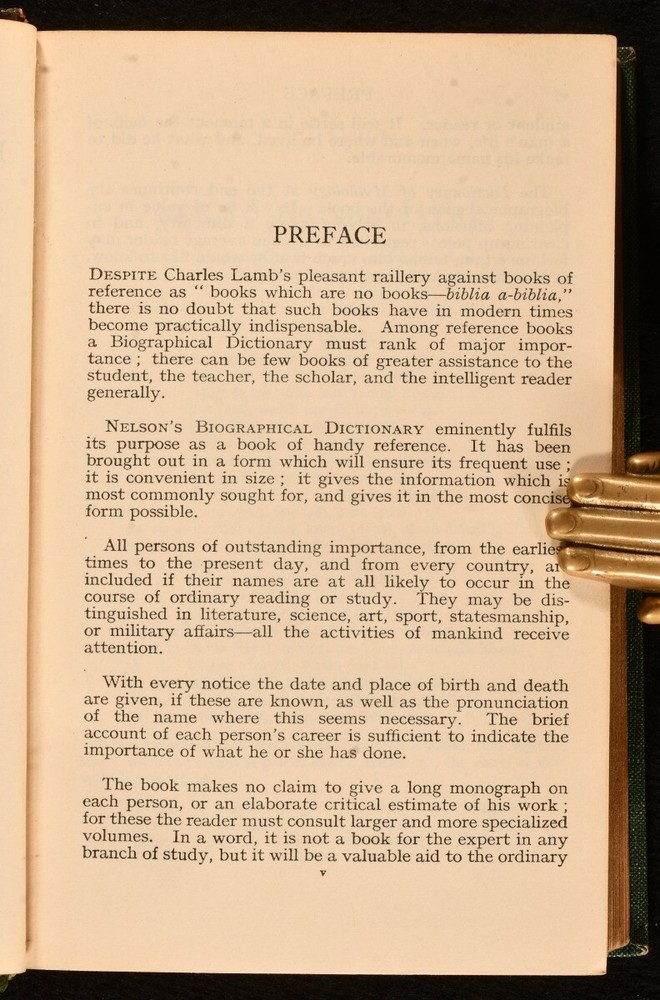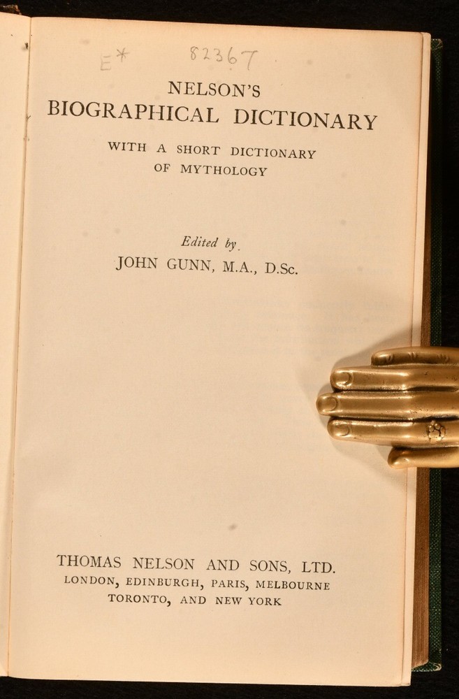 Click here to see our other books! Nelson's Biographical Dictionary: with a Short Dictionary of Mythology John Gunn 1936 Thomas Nelson And Sons : London 7" by 4.5" viii, 592pp. SUMMARY Handsomely bound in a quarter morocco Riviere signed binding. Leather Binding,Signed Binding Overall Condition: Very Good This book weighs 0.75 KG when packed UK Postage: £ 3.99 US Postage: £ 19.99 EU Postage : £ 15.99 European Postage: £ 16.99 Asia Postage: £ 21.99 Worldwide Postage: £ 25.99 DESCRIPTION Handsomely bound in a quatre morocco binding. Bound in a Rivieres signed binding. Nelson's biographical dictionary covers a range of notable people including Samuel Taylor Coleridge, Cleopatra and Charles Babbage. Each entry gives a short account of who they were and why they are important. The Nelson's dictionary celebrates diversity giving voice and credit to a wide range of people, some of whom have been widely neglected within the mainstream historical narrative. CONDITION Handsomely bound in a quarter leather binding with cloth boards. Externally generally smart. Rubbing to the joints resulting in loss. The spine significantly faded. Internally firmly bound in a Riviere signed binding. Pages are bright and clean. Overall Condition: Very Good GLOSSARY OF TERMS Overall Condition (Dustwrapper condition rating is shown after that for the book itself, where a dustwrapper is present) Fine - Very well preserved copy showing very little wear Very Good Indeed - Only one or two minor faults, really a very attractive copy Very Good - Quite a wide term meaning no major faults but probably several smaller ones often expected given the age of the book, but still a respectable copy Good - Meaning not very good. Some more serious faults as will be described in the condition report under 'condition' Good Only - Meaning one or more faults that could really do with repair Fair - As with good only above but with other faults leaving a compromised copy even after repair Poor - Really bad and possibly seriously incomplete. We only sell books in this condition where their rarity or value makes them attractive none the less. Major defects will be described. GUARANTEE We offer a full money back guarantee on our descriptions. Please ask for details and conditions. We prefer PAYPAL. If you pay via PAYPAL we will post the item off the same or the next working day with the postage you have selected. Please note we cannot accept USD cheques