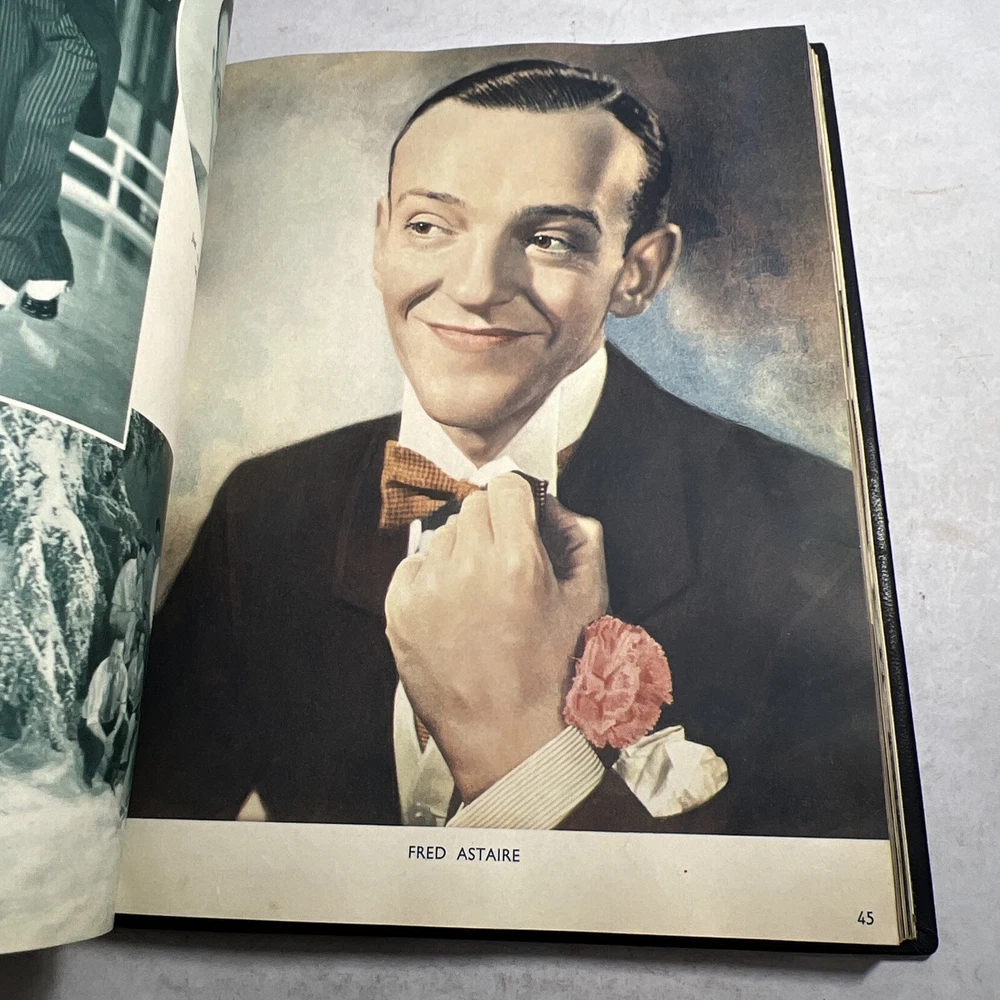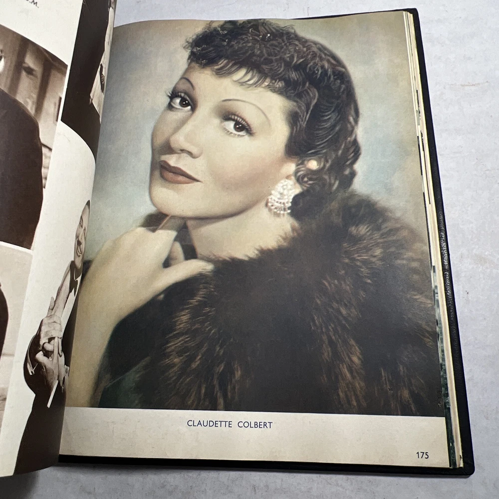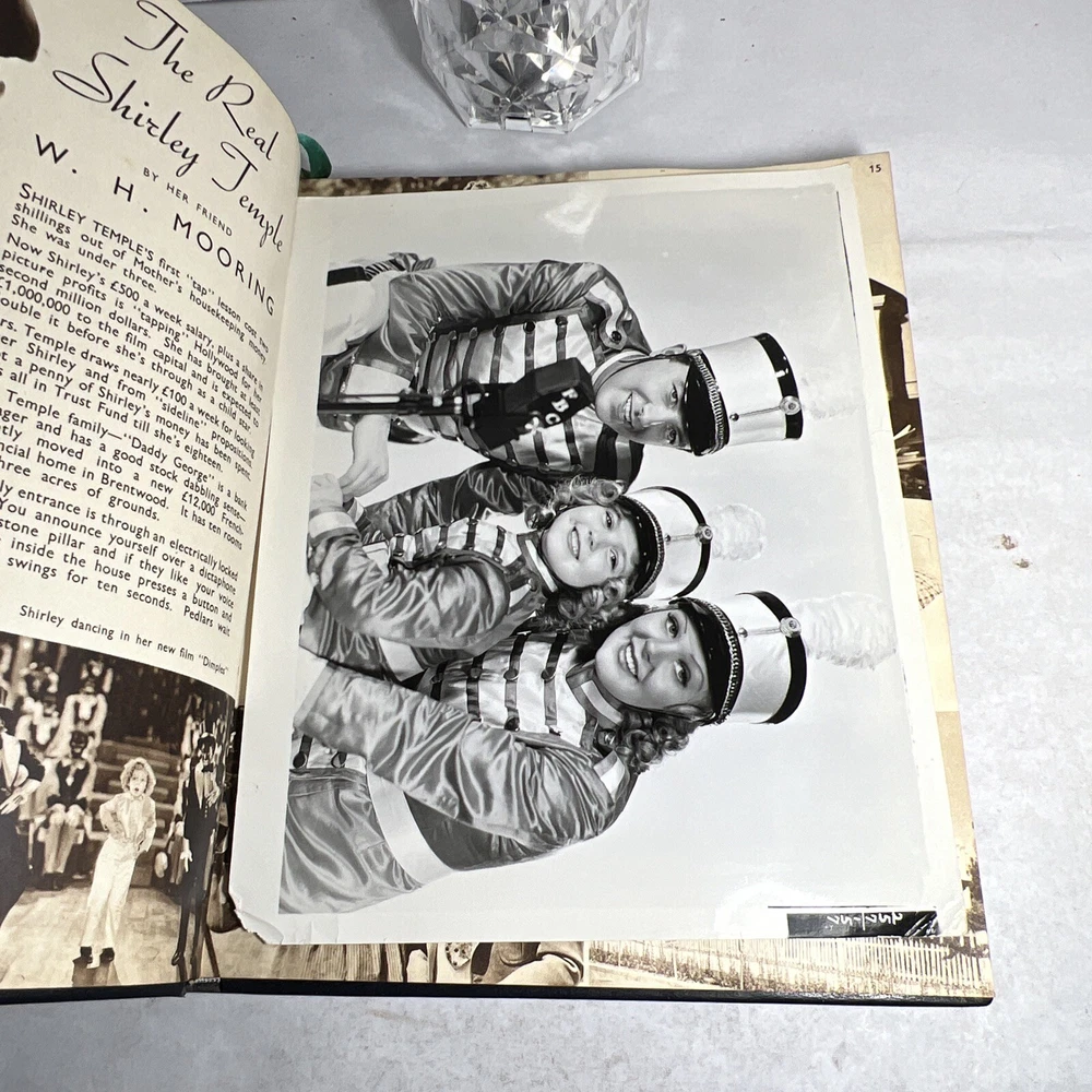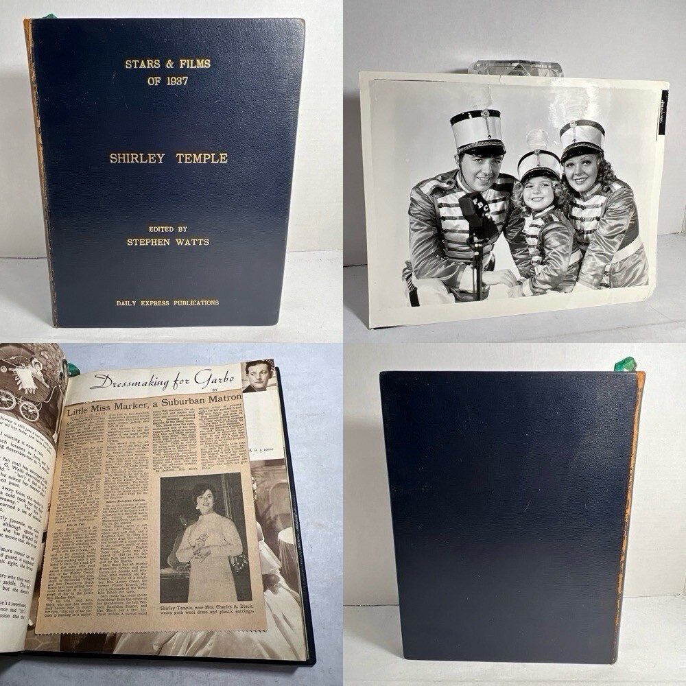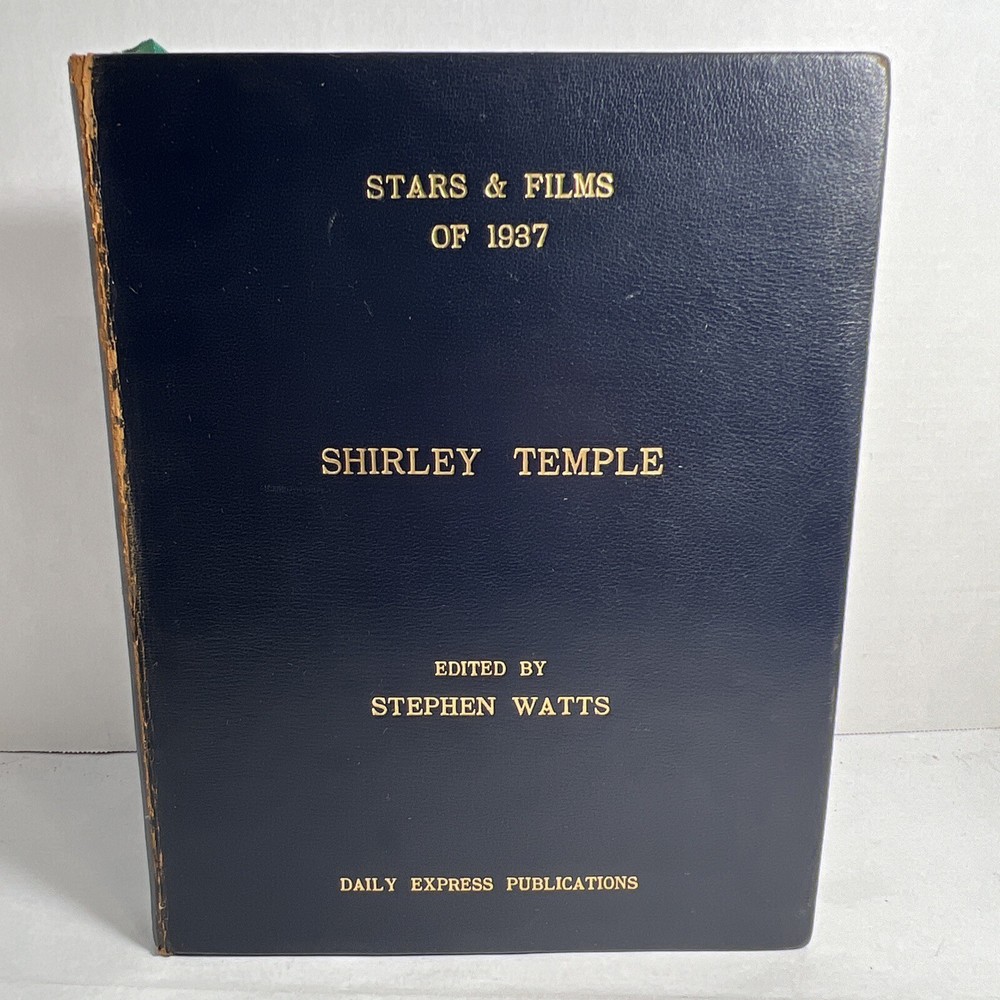 1937 STARS & FILMS by Stephen Watts which has been adorned with gold gilt lettering to the front cover and spine in a beautiful leather bind. Also comes with a 1960’s News Clipping that is of an article of Shirley Temple as well as a high gloss 8x10 Shirley Temple Promo Photo which was stuffed within the pages as was the clipping. - Bookmark (green and attached to the book) - Hardcover (rare, one in existence - which is this one). - Book features Shirley Temple, Joan Crawford, Gary Cooper and many other notable stars from the Golden Era! - Photo from “Poor Little Rich Girl” NOTE: The original cover of the book by Stephen Watts is NOT included within the bound volume. LANGUAGE: English PAGES: 208 MEASURES: 9” x 11.25” (book), 8” x 10” (photo) CONDITION: (Book) Has wear to the spine in the form of chipping and scuffing. Internal pages have some staining and discoloration around the edges, mainly in regards to the inside cover board pages and the first few internal pages. Slight dusty vintage smell to this book but not overly so, is very faint. Overall: VERY GOOD! (Photo) Has torn bottom right corner, has corner and edge wear in the form of crimps or creases, face of photo when held under light may have slight indentations or scuff marks. Back has quitting “Poor little rich girl” and other markings around edges. Overall: GOOD SHIPPING: Fast & free via USPS (for USA). Will ship same day if payment is received by 3pm EST! Free returns! Shipped with care (cardboard backers, bubble wrap, peanuts & or double boxed whenever necessary). Signature confirmation for high value items is required. ID: D