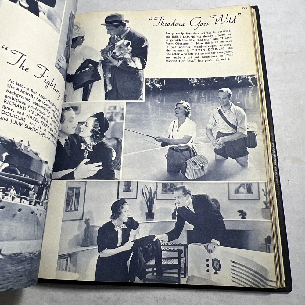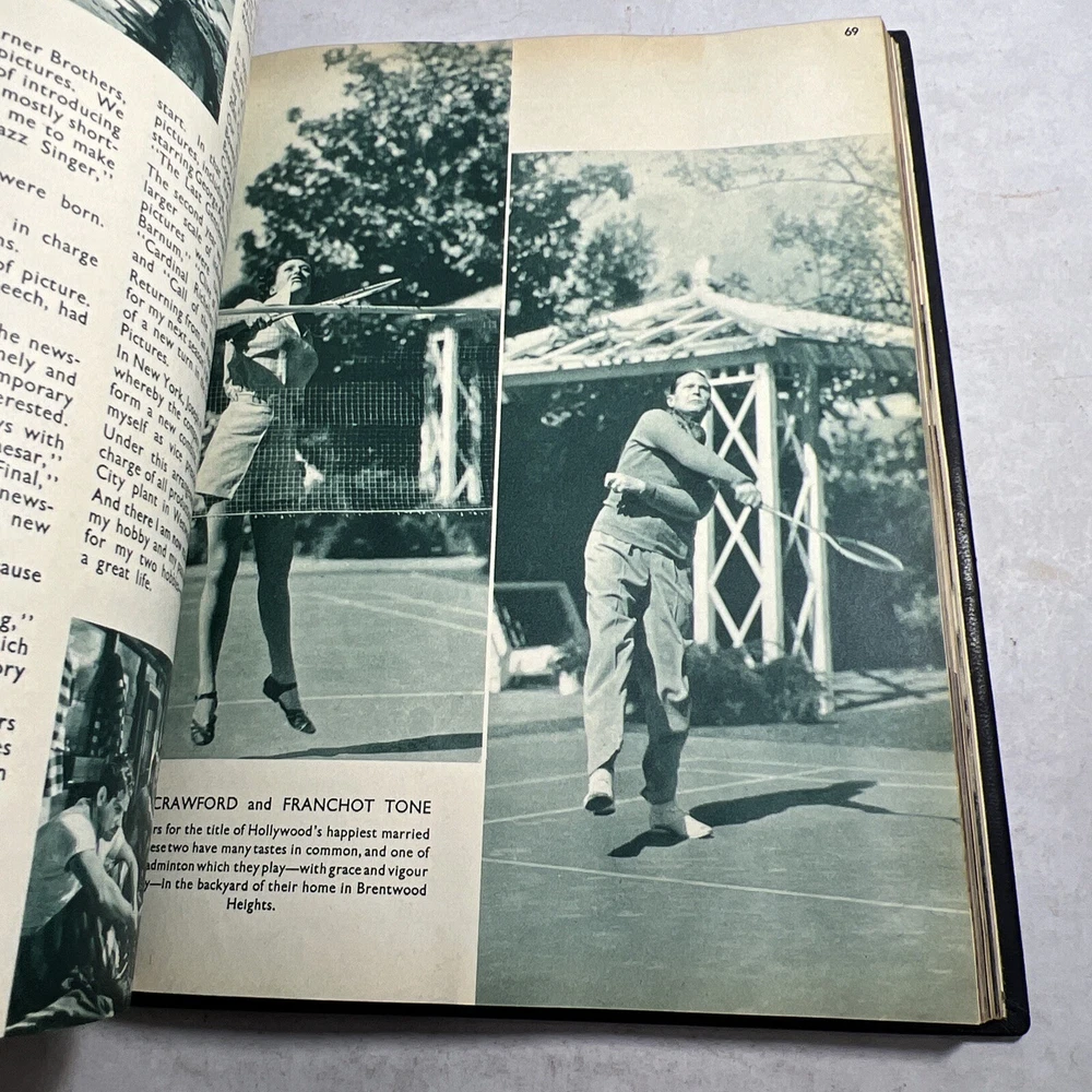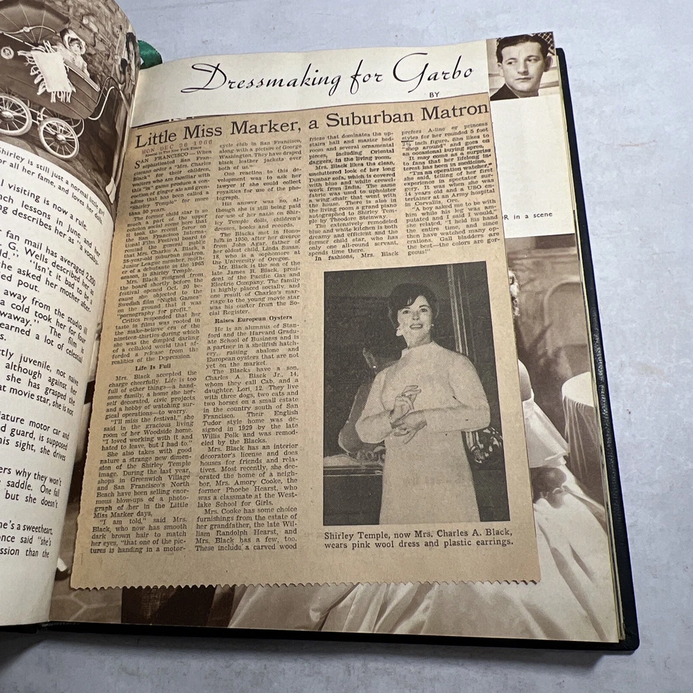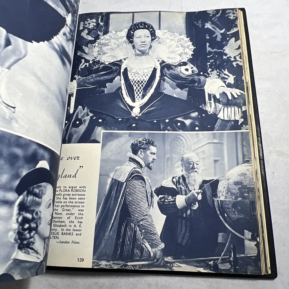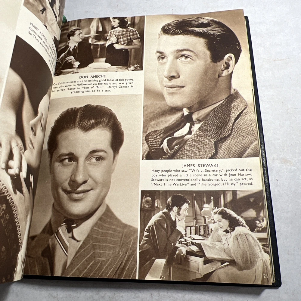 1937 STARS & FILMS by Stephen Watts which has been adorned with gold gilt lettering to the front cover and spine in a beautiful leather bind. Also comes with a 1960’s News Clipping that is of an article of Shirley Temple as well as a high gloss 8x10 Shirley Temple Promo Photo which was stuffed within the pages as was the clipping. - Bookmark (green and attached to the book) - Hardcover (rare, one in existence - which is this one). - Book features Shirley Temple, Joan Crawford, Gary Cooper and many other notable stars from the Golden Era! - Photo from “Poor Little Rich Girl” NOTE: The original cover of the book by Stephen Watts is NOT included within the bound volume. LANGUAGE: English PAGES: 208 MEASURES: 9” x 11.25” (book), 8” x 10” (photo) CONDITION: (Book) Has wear to the spine in the form of chipping and scuffing. Internal pages have some staining and discoloration around the edges, mainly in regards to the inside cover board pages and the first few internal pages. Slight dusty vintage smell to this book but not overly so, is very faint. Overall: VERY GOOD! (Photo) Has torn bottom right corner, has corner and edge wear in the form of crimps or creases, face of photo when held under light may have slight indentations or scuff marks. Back has quitting “Poor little rich girl” and other markings around edges. Overall: GOOD SHIPPING: Fast & free via USPS (for USA). Will ship same day if payment is received by 3pm EST! Free returns! Shipped with care (cardboard backers, bubble wrap, peanuts & or double boxed whenever necessary). Signature confirmation for high value items is required. ID: D