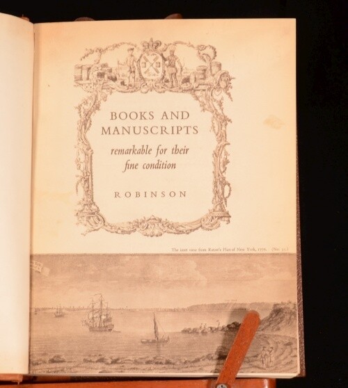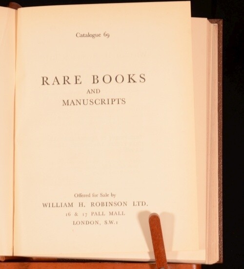 Click here to see our other books! Catalogues 65, 69 and 70 W Robinson 1938-1940 William H Robinson Ltd. : London 9.5" by 7.5" 81pp; 116pp; 224pp SUMMARY A selection of Robinson's catalogues on books and manuscripts, bound in one. Illustrated,Leather Binding Overall Condition: Very Good Indeed This book weighs 1.5 KG when packed UK Postage: £ 3.99 US Postage: £ 23.99 EU Postage : £ 18.99 European Postage: £ 19.99 Asia Postage: £ 31.99 Worldwide Postage: £ 32.99 DESCRIPTION Featuring photographic images of many books and manuscripts described and illustrated title pages. Catalogue 65 explores books and manuscripts that are remarkable for their condition, and includes a particularly valuable copy of Chaucer's Canterbury Tales. Catalogue 69 features rare books and manuscripts, and describes a rare broadsheet of Little Tom the Sailor by William Blake. Finally catalogue 70 lists books and manuscripts relating to America. This includes the Library of George Grenville who was the prompter of the Stamp Act, and was therefore one of the main agents in the genesis of the USA. CONDITION In a half calf binding with cloth boards. Externally, smart with slight rubbing to the spine. Internally, firmly bound. Pages are bright and clean. Small closed tear to illustrated title page of catalogue 65. Pages are bright and clean, aside from light tide marks to front endpapers. Overall Condition: Very Good Indeed GLOSSARY OF TERMS Overall Condition (Dustwrapper condition rating is shown after that for the book itself, where a dustwrapper is present) Fine - Very well preserved copy showing very little wear Very Good Indeed - Only one or two minor faults, really a very attractive copy Very Good - Quite a wide term meaning no major faults but probably several smaller ones often expected given the age of the book, but still a respectable copy Good - Meaning not very good. Some more serious faults as will be described in the condition report under 'condition' Good Only - Meaning one or more faults that could really do with repair Fair - As with good only above but with other faults leaving a compromised copy even after repair Poor - Really bad and possibly seriously incomplete. We only sell books in this condition where their rarity or value makes them attractive none the less. Major defects will be described. GUARANTEE We offer a full money back guarantee on our descriptions. Please ask for details and conditions. We prefer PAYPAL. If you pay via PAYPAL we will post the item off the same or the next working day with the postage you have selected. Please note we cannot accept USD cheques