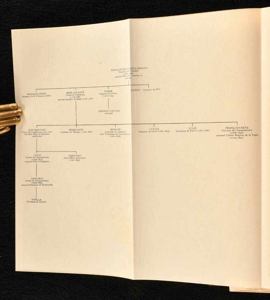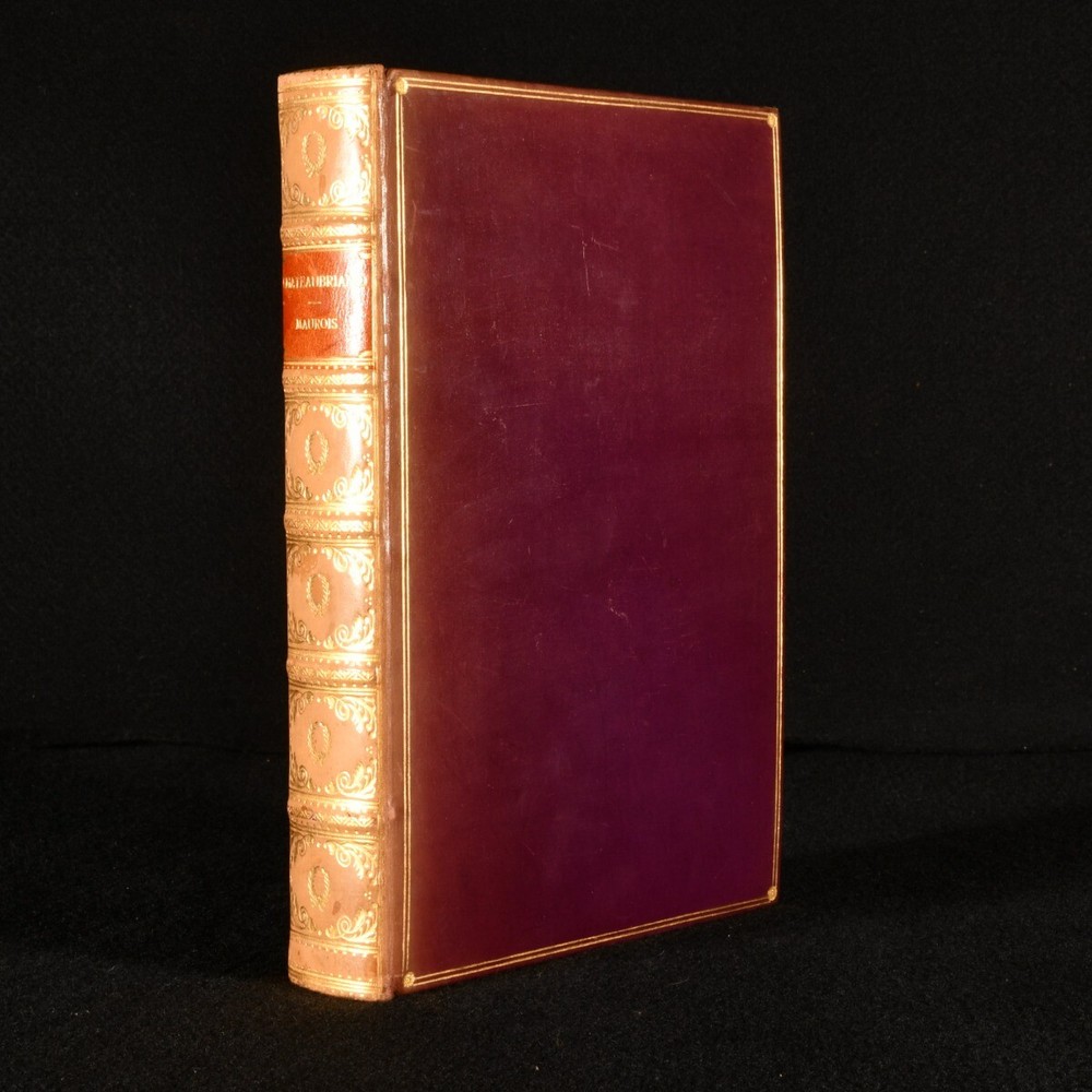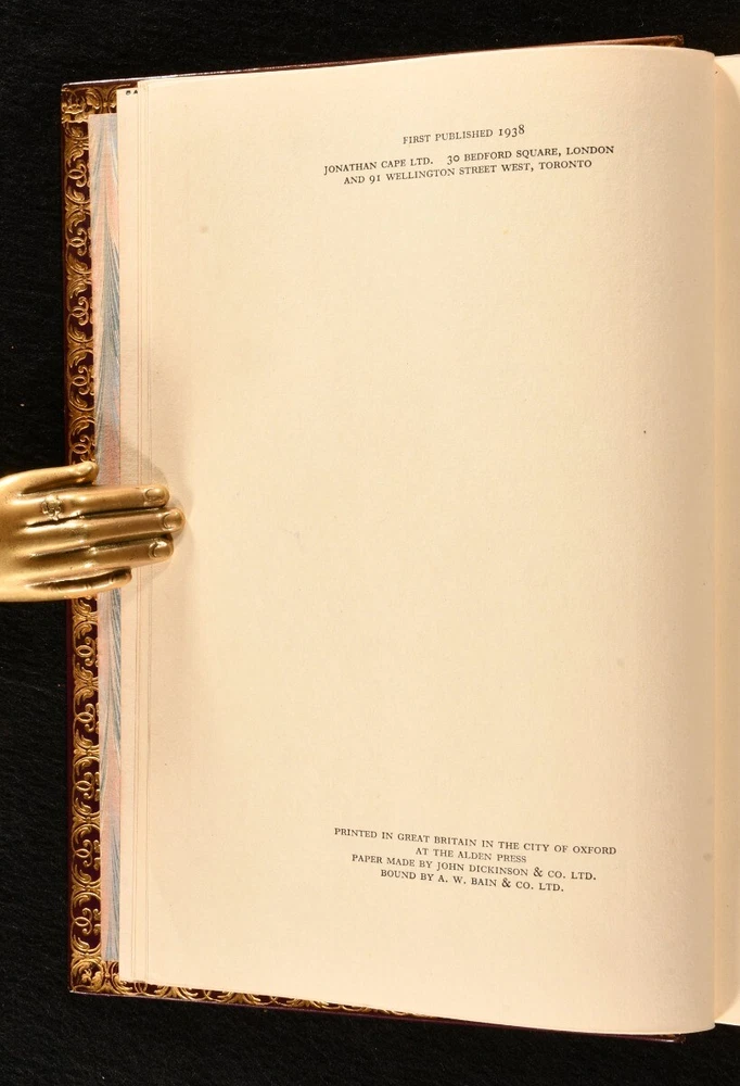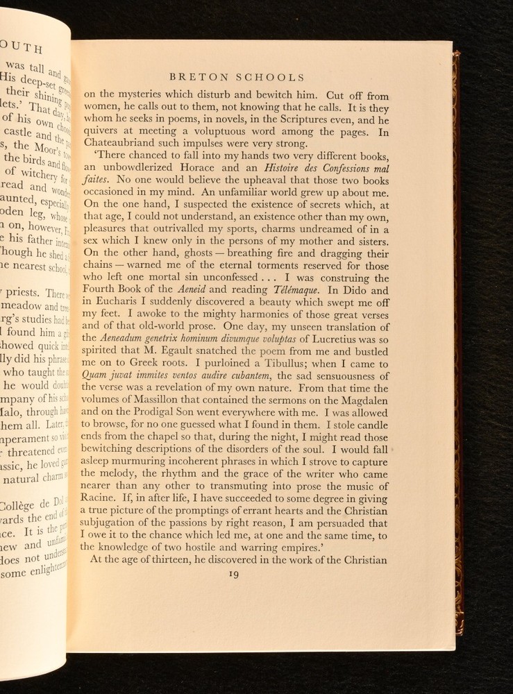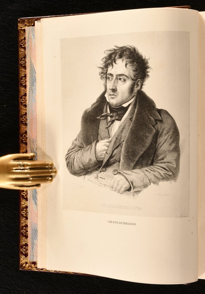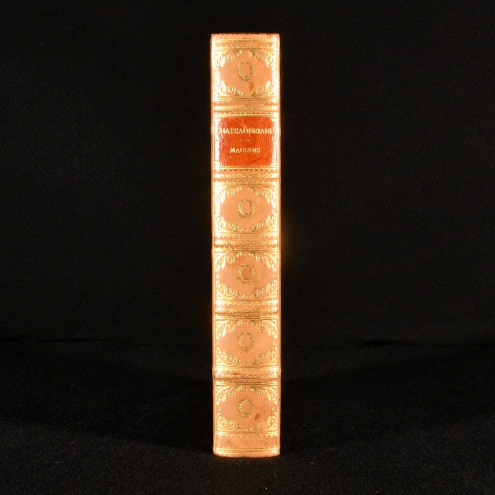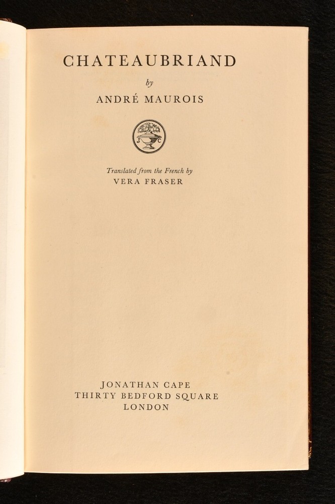 Click here to see our other books! Chateaubriand Andre Maurois; Vera Fraser [trans.] 1938 Jonathan Cape : London 8.5" by 6" 360pp. SUMMARY The first English translation of this biography of French author François-René de Chateaubriand, in an exquisite Bayntun full calf binding. Fine Binding,First Edition,Folding Plates,Illustrated,Leather Binding,Pleasing Copy,Rebound,Signed Binding Overall Condition: Near Fine This book weighs 0.75 KG when packed UK Postage: £ 3.99 US Postage: £ 19.99 EU Postage : £ 15.99 European Postage: £ 16.99 Asia Postage: £ 21.99 Worldwide Postage: £ 25.99 DESCRIPTION The first edition of this biographical sketch of François-René de Chateaubriand, important French author and politician who had a great influence on French literature of the nineteenth century, dominating the literary scene of the time. The first English edition, translated from the French of André Maurois by Vera Fraser. Recounting from his childhood and youth, his time as a soldier and voyager, his exile in England, and much more. Illustrated with a frontispiece and three full page plates, as well as a folding plate illustrating his genealogical tree. Collated, complete. In a beautiful fine full calf binding, signed Bayntun. CONDITION In a lovely full calf binding signed Bayntun, with five raised bands and gilt tooling to the spine, pictorial endpapers, and gilt to the edges. Externally lovely with minor shelf wear only and some sunning to the spine. Internally, firmly bound. With a minor faint spotting to the first few leaves, otherwise the pages are bright and clean. Illustrated with a frontispiece and three full page plates, as well as a folding plate illustrating his genealogical tree. Collated, complete. Overall Condition: Near Fine GLOSSARY OF TERMS Overall Condition (Dustwrapper condition rating is shown after that for the book itself, where a dustwrapper is present) Fine - Very well preserved copy showing very little wear Very Good Indeed - Only one or two minor faults, really a very attractive copy Very Good - Quite a wide term meaning no major faults but probably several smaller ones often expected given the age of the book, but still a respectable copy Good - Meaning not very good. Some more serious faults as will be described in the condition report under 'condition' Good Only - Meaning one or more faults that could really do with repair Fair - As with good only above but with other faults leaving a compromised copy even after repair Poor - Really bad and possibly seriously incomplete. We only sell books in this condition where their rarity or value makes them attractive none the less. Major defects will be described. GUARANTEE We offer a full money back guarantee on our descriptions. Please ask for details and conditions. We prefer PAYPAL. If you pay via PAYPAL we will post the item off the same or the next working day with the postage you have selected. Please note we cannot accept USD cheques