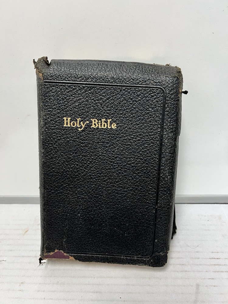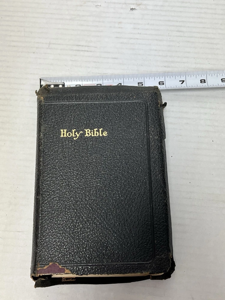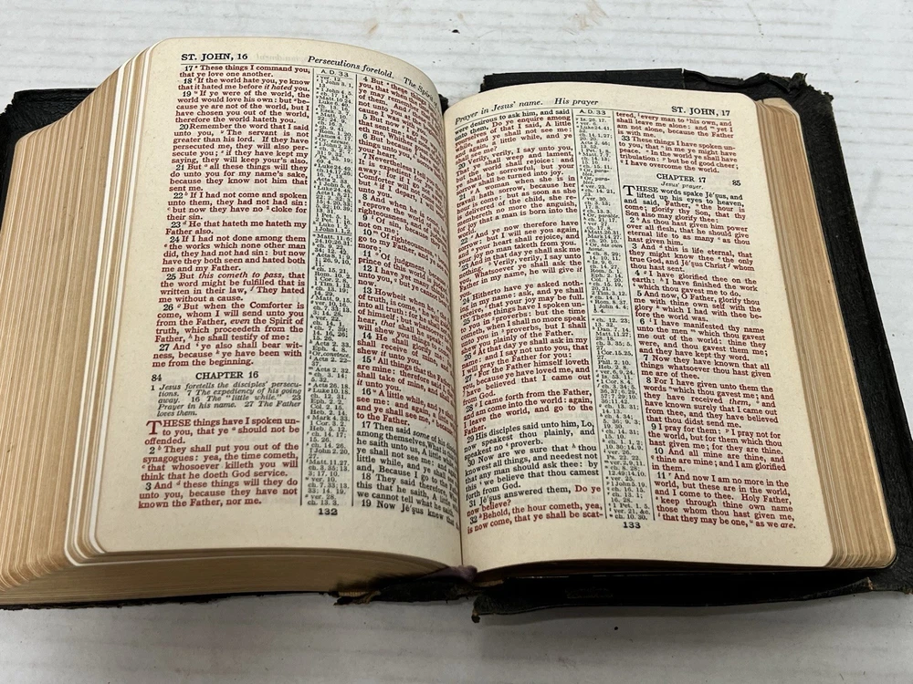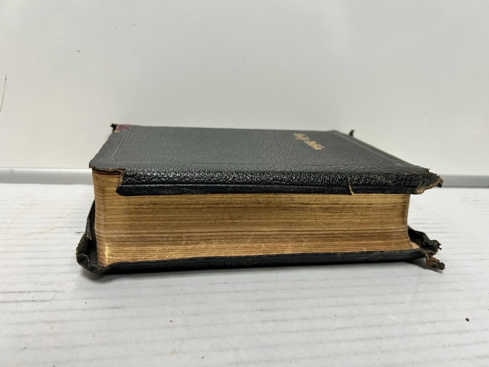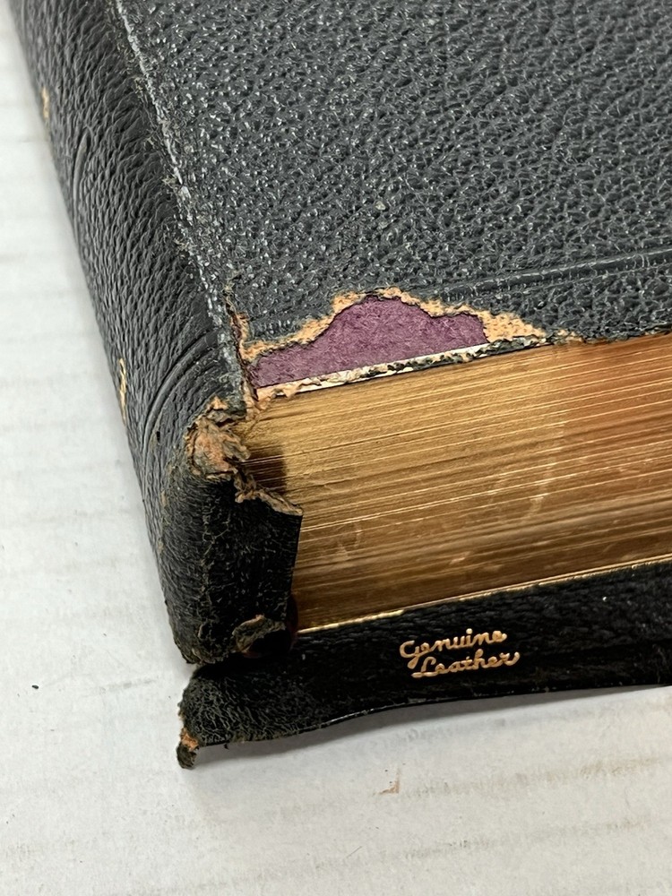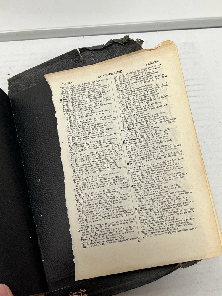 Leather cover is worn and has tears. Pages are in very good shape other than 2 pages of the concordance are torn out but still present. Please see pictures for condition.