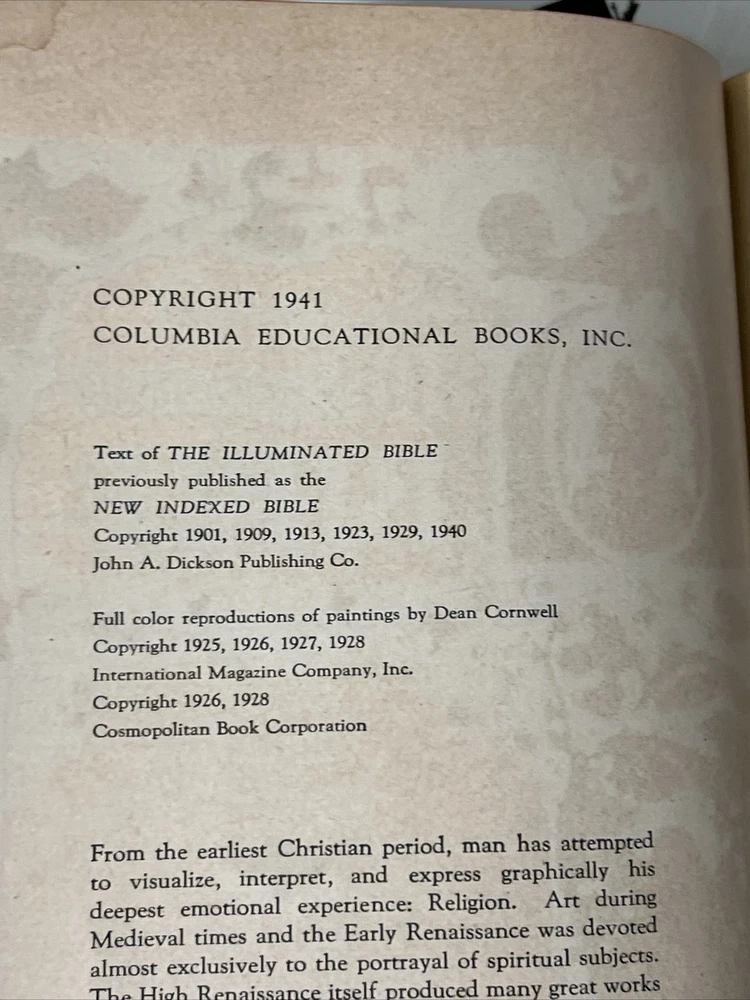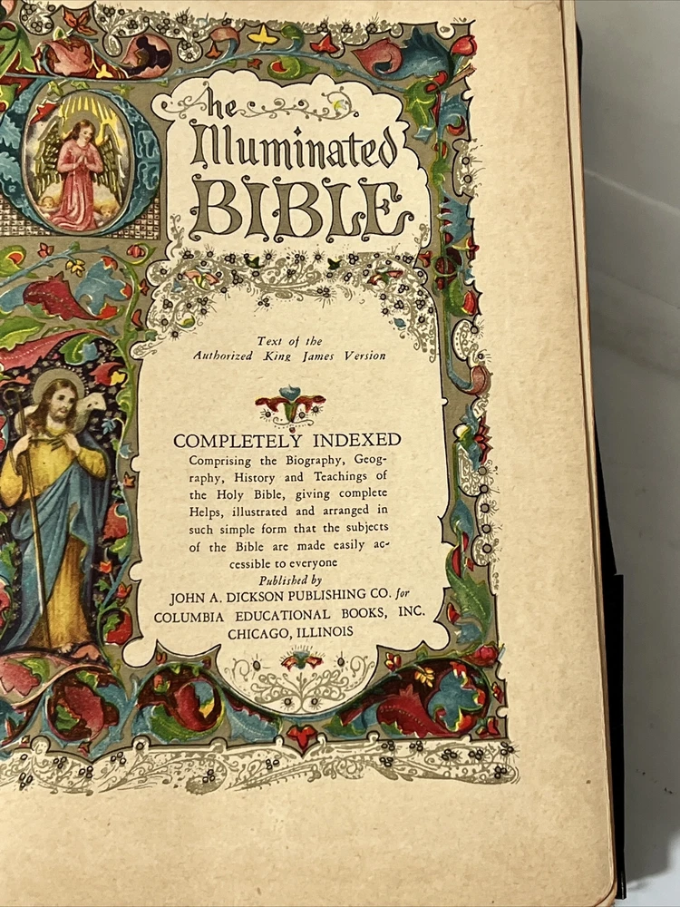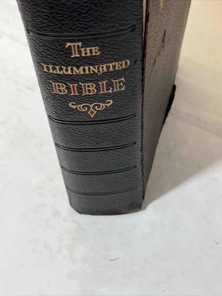 Bibliographic & Condition Details Title: The Illuminated Bible Author: Various Publisher: John A Dickson Publication Date: 1941 Binding: Flex cover shows a lot of wear Book Condition: Exterior acceptable Inside pages in good condition Dust Jacket Condition: N/A Page Condition: Good no writing or highlighting Edition: Unknown Printing: Unknown Book Type: Religious Bible Features: Illustrated Dimensions: 8 3/4" x 6 1/2 " x 2 1/4" Notes: see photos for condition