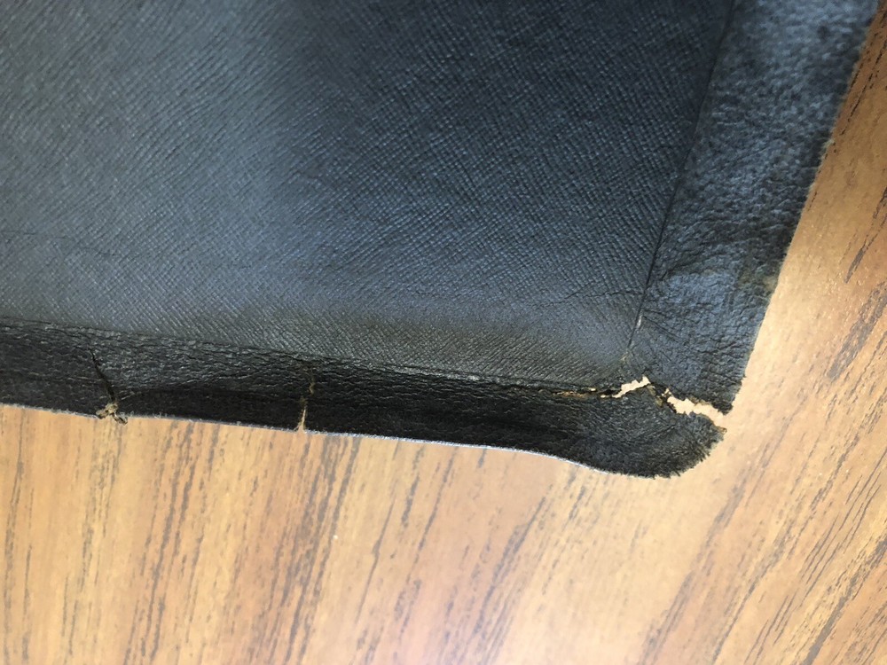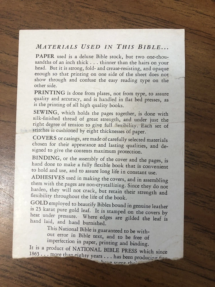 1944 The Holy Bible KJV Leather Self-Pronouncing Reference Edition 23K Gold leaf stamped on cover titles and page edges, according to National Bible publisher's enclosed literature, see photos. Interior in very good, clean, unmarked, but with an old book odor, no mold. Genuine leather covers are worn and with tears to the overlapping edges. A group of pages were caught when the book was closed resulting in a small crease on the bottom corner, see photos. With center col references, tab indexes, maps, concordance, etc, but not red letter. Media mail, boxed, returns accepted