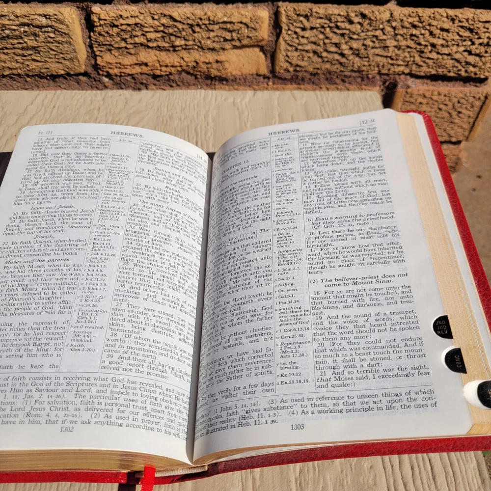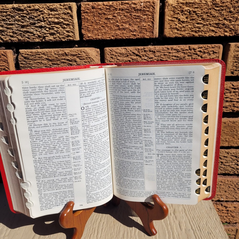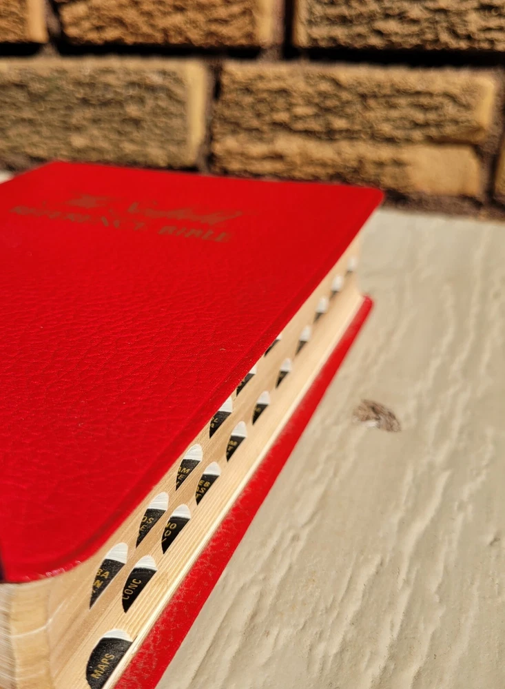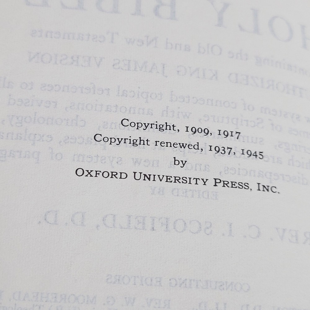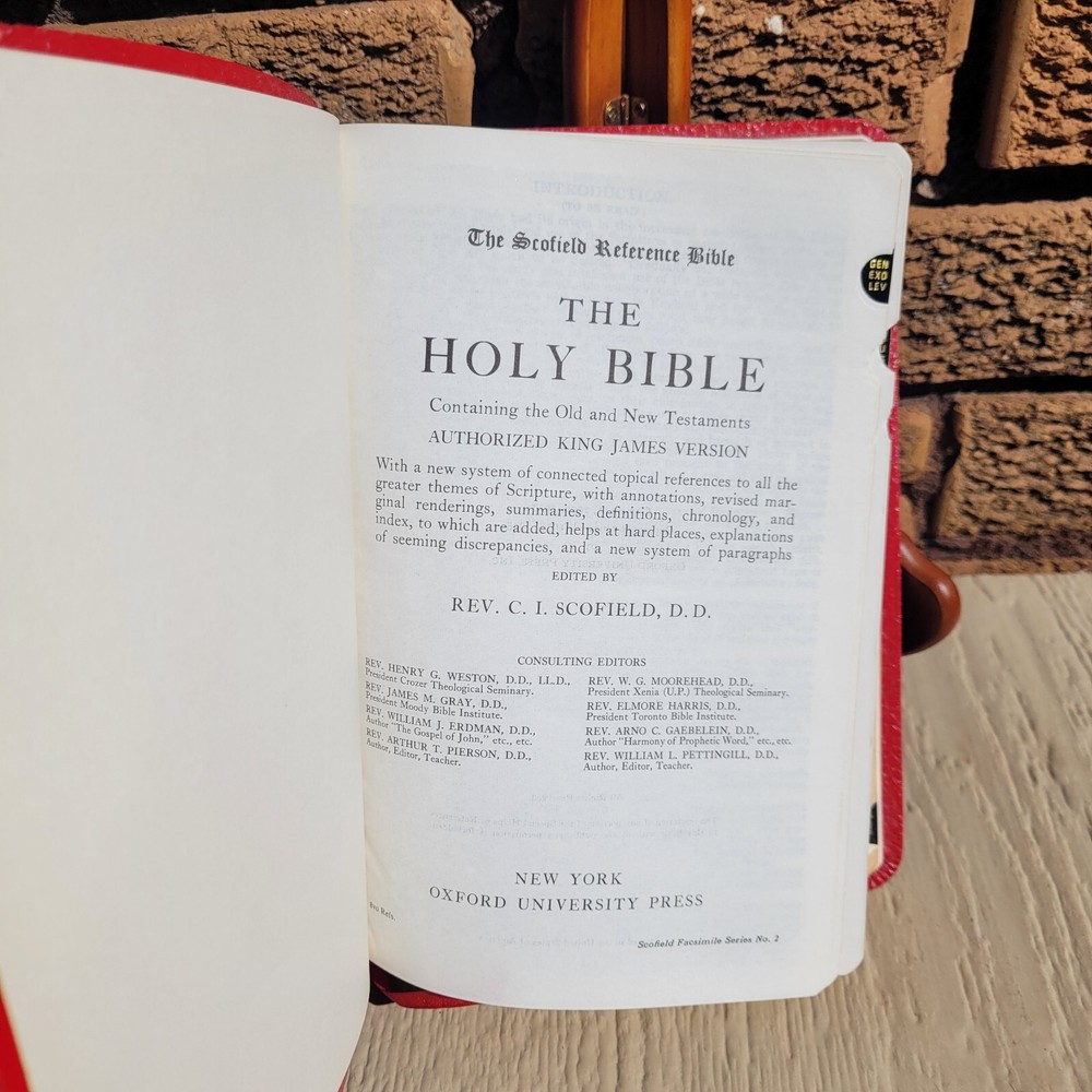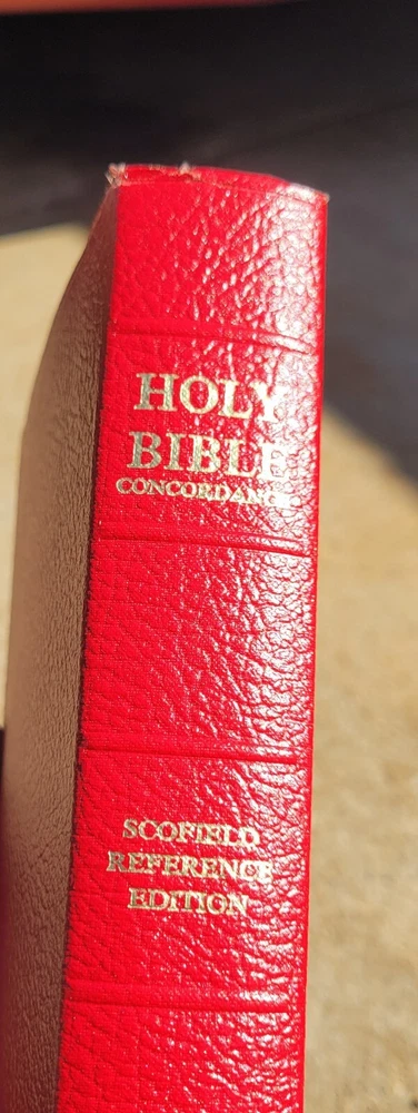 1945 HOLY BIBLE Concordance Scofield Reference Edition Indexed Oxford Red Bonded Leather. The original owner wrote their name on the first page, and there are some imperfections on the corners and pages as shown in the photos. Otherwise, it is in overall good condition. Condition is "Used." Shipped with USPS Media Mail.