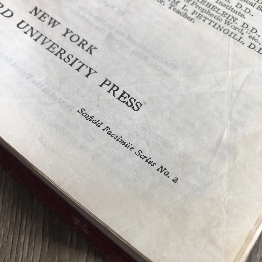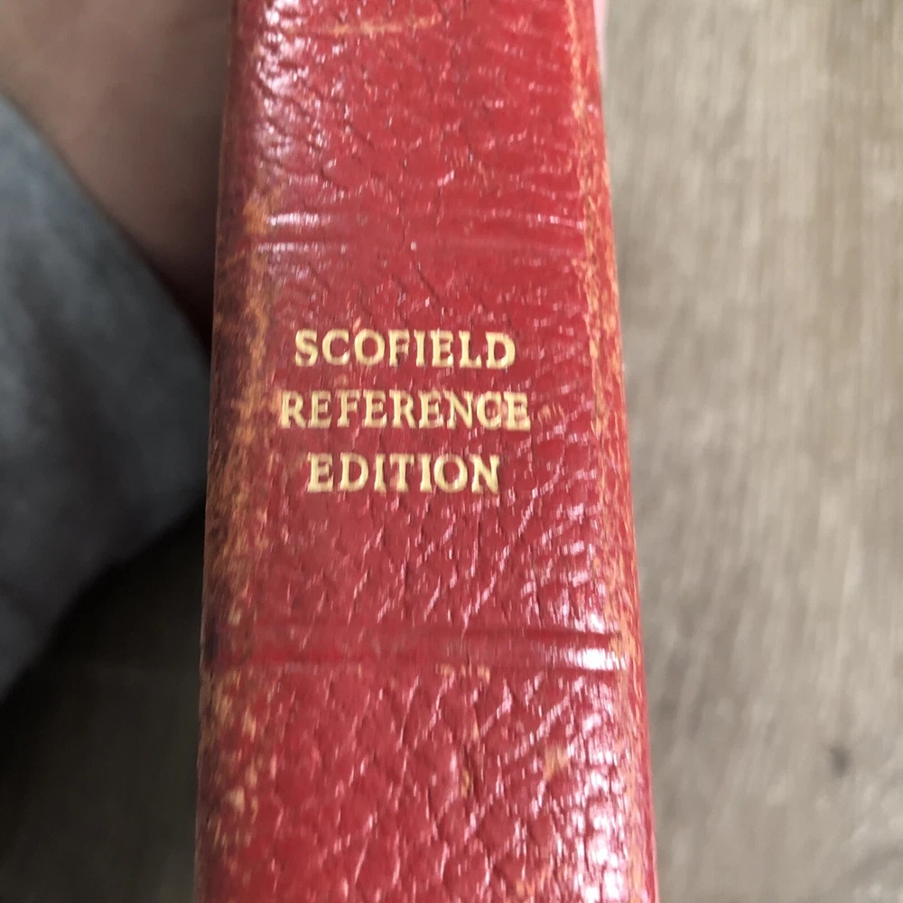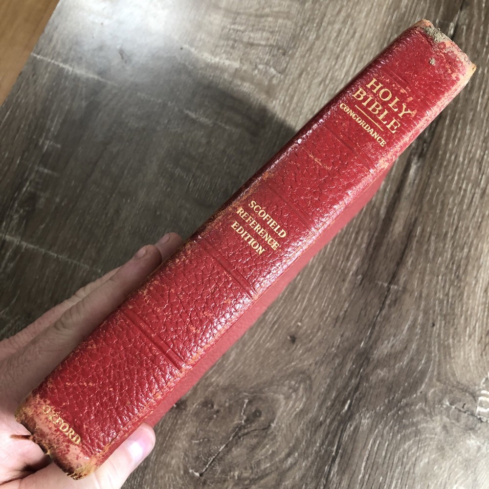 1945 Oxford Scofield Reference Bible KJV - Facsimile No. 2 - Red Persian Leather. This is a used Bible. There are blemishes and imperfections. Please see all photos. I have tried to show much of the damages in the photos. There is some writing. Pages are separating. The spine is separating. Please see all photos.