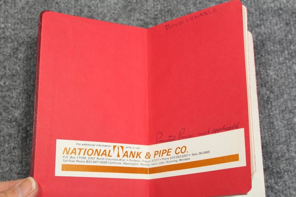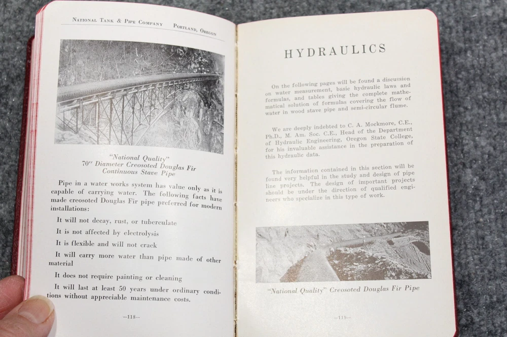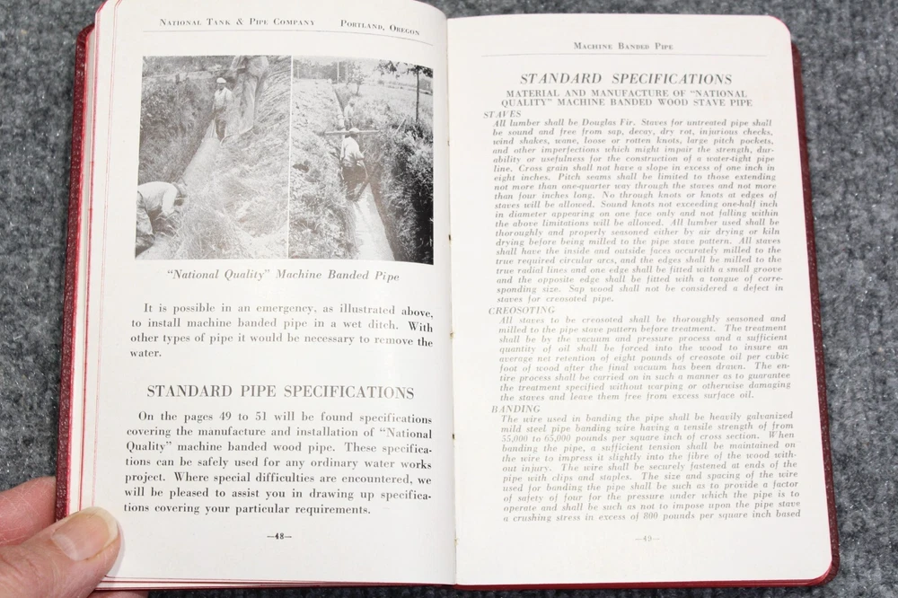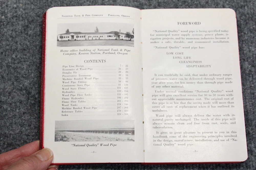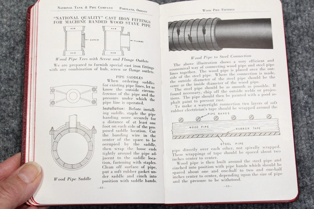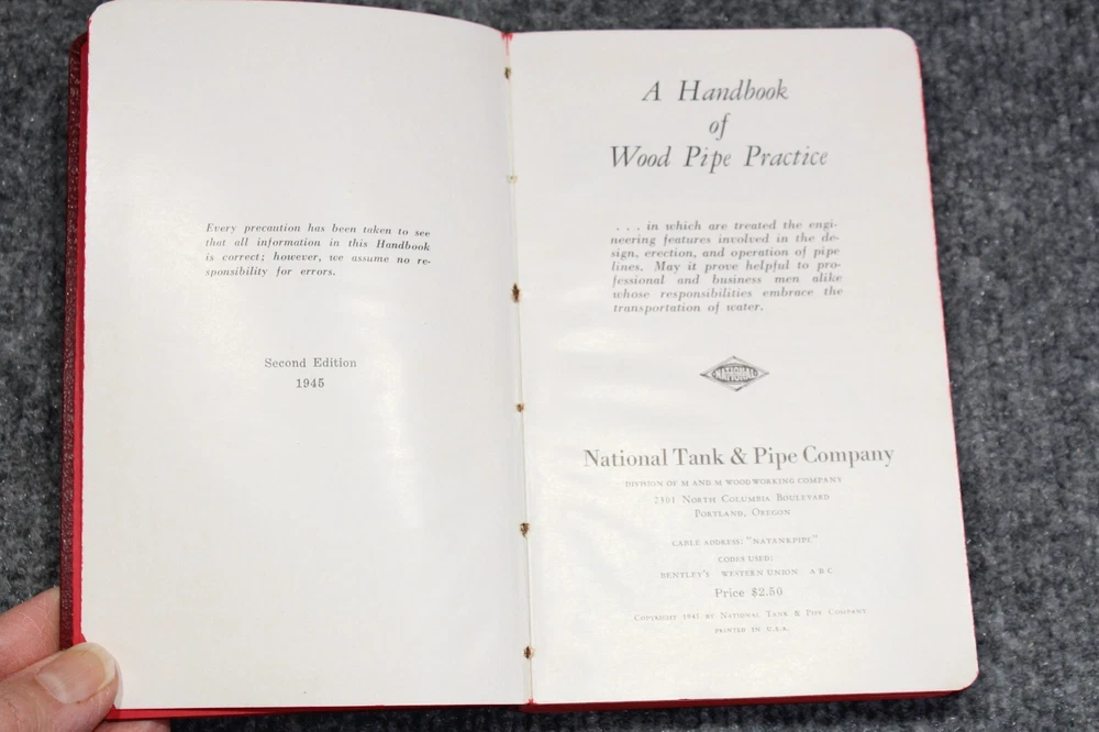 1945 Wood Pipe Handbook National Tank Pipe Company Portland Oregon 2nd Edition Good condition. The cover boards exhibit wear. There is writing in ink on the front free endpage. The text pages are clean with no writing, marks, stains, etc. Please see the included photos for close-up condition of the item. All images are photos or scans of the exact item you will receive. No stock or re-used photos . Please review images and condition notes, and feel free to ask any questions you may have. The item will be securely packaged to assure safe arrival. I am always happy to combine shipping whenever possible. Thank you for your interest!