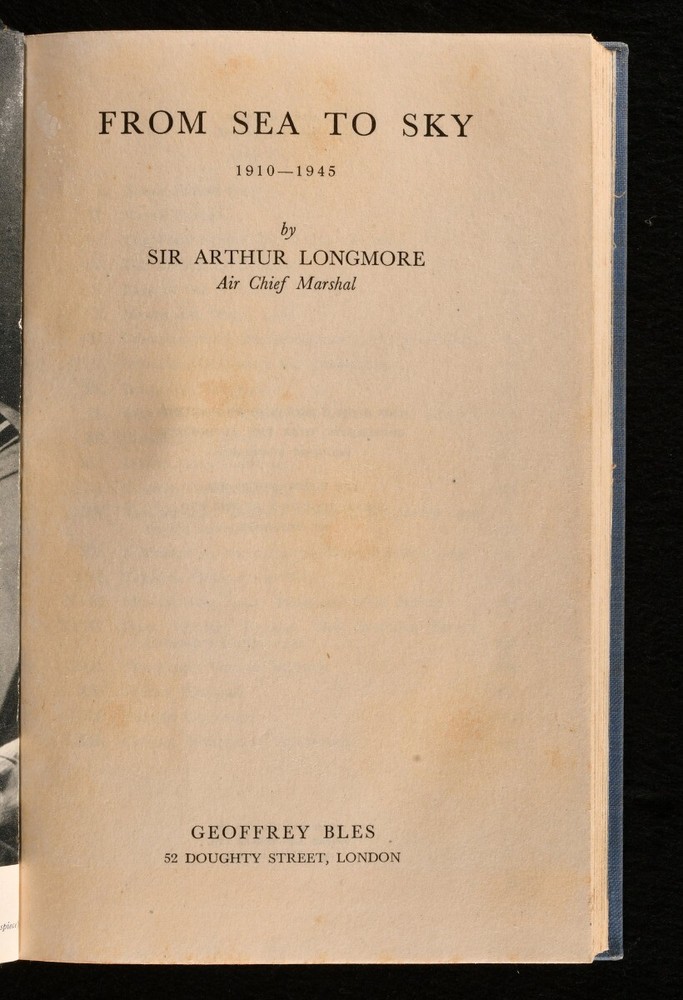 Click here to see our other books! From Sea to Sky 1910-1945 Arthur Longmore 1946 Geoffrey Bles : London 8.5" by 5.5" [4], 5-304pp SUMMARY A Sangorski & Sutcliffe bound copy of the first edition of Arthur Longmore's memoir of his time spent working in the Royal Navy. Fine Binding,First Edition,Illustrated,Leather Binding,Signed Binding Overall Condition: Near Fine This book weighs 0.75 KG when packed UK Postage: £ 3.99 US Postage: £ 19.99 EU Postage : £ 15.99 European Postage: £ 16.99 Asia Postage: £ 21.99 Worldwide Postage: £ 25.99 DESCRIPTION The first edition of this work. In a Sangorski and Sutcliffe binding. The memoir of Arthur Longmore, recounting his long and affluent career in the Royal Air Force, in which he reached a high rank of importance. Illustrated with a frontispiece, and thirty-two plates. CONDITION In a quarter morocco Sangorski and Sutcliffe binding with cloth to the boards. Externally, smart, with a little discolouration and a few light marks to the boards. Spine is a little faded. Internally, firmly bound. Pages are bright and clean, with just a few odd spots. Overall Condition: Near Fine GLOSSARY OF TERMS Overall Condition (Dustwrapper condition rating is shown after that for the book itself, where a dustwrapper is present) Fine - Very well preserved copy showing very little wear Very Good Indeed - Only one or two minor faults, really a very attractive copy Very Good - Quite a wide term meaning no major faults but probably several smaller ones often expected given the age of the book, but still a respectable copy Good - Meaning not very good. Some more serious faults as will be described in the condition report under 'condition' Good Only - Meaning one or more faults that could really do with repair Fair - As with good only above but with other faults leaving a compromised copy even after repair Poor - Really bad and possibly seriously incomplete. We only sell books in this condition where their rarity or value makes them attractive none the less. Major defects will be described. GUARANTEE We offer a full money back guarantee on our descriptions. Please ask for details and conditions. We prefer PAYPAL. If you pay via PAYPAL we will post the item off the same or the next working day with the postage you have selected. Please note we cannot accept USD cheques