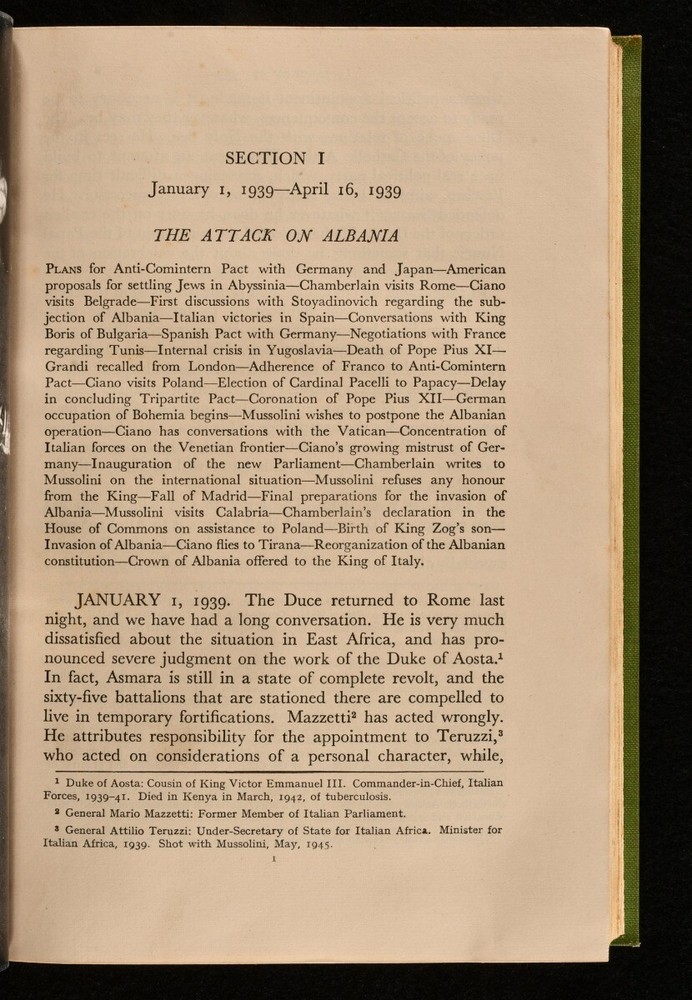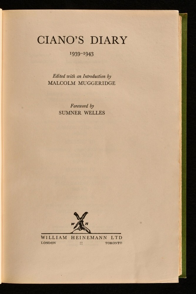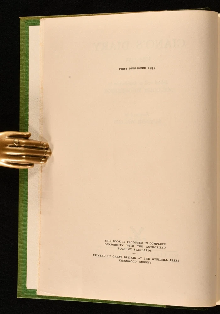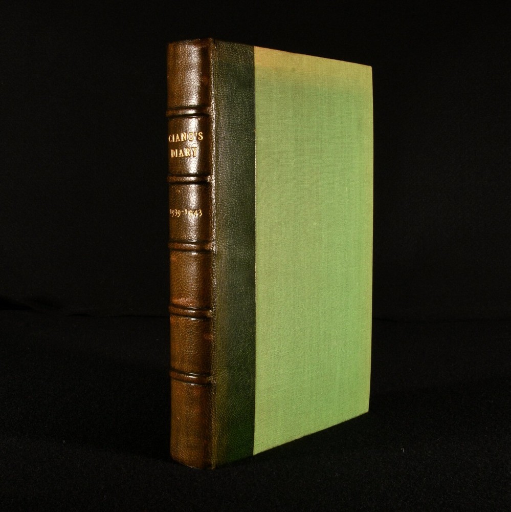 Click here to see our other books! Ciano's Diary 1939-1943 Galeazzo Ciano; Malcolm Muggeridge; Sumner Welles 1947 William Heinemann LTD : London 9.5" by 6.5" [4], v-xxii, 575pp SUMMARY A Sangorski and Sutcliffe bound first edition of the wartime diaries of Galeazzo Ciano, the foreign minister and son-in-law of Mussolini. Fine Binding,First Edition,Illustrated,Leather Binding,Rebound,Signed Binding Overall Condition: Near Fine This book weighs 1.5 KG when packed UK Postage: £ 3.99 US Postage: £ 23.99 EU Postage : £ 18.99 European Postage: £ 19.99 Asia Postage: £ 31.99 Worldwide Postage: £ 32.99 DESCRIPTION The first edition of this work. In a Sangorski and Sutcliffe binding. Extracts from the diary of Galeazzo Ciano from 1939 to 1943, offering an interesting insight into Italy's involvement during the Second World War. Ciano was an Italian diplomat and politician, who served as the Foreign Minister for his father-in-law Mussolini. Ciano was married to Edda Mussolini, the daughter of the dictator. Illustrated with four pages of plates. Collated, complete. Edited with an introduction by Malcolm Muggeridge, foreword by Sumner Welles. CONDITION In a quarter morocco binding by Sangorski and Sutcliffe with cloth to the boards. Externally, smart. A little fading to the spine and head of the boards. Light marks to the boards and spine. Some spots to the fore edge. Internally, firmly bound. Pages are bright and clean. Overall Condition: Near Fine GLOSSARY OF TERMS Overall Condition (Dustwrapper condition rating is shown after that for the book itself, where a dustwrapper is present) Fine - Very well preserved copy showing very little wear Very Good Indeed - Only one or two minor faults, really a very attractive copy Very Good - Quite a wide term meaning no major faults but probably several smaller ones often expected given the age of the book, but still a respectable copy Good - Meaning not very good. Some more serious faults as will be described in the condition report under 'condition' Good Only - Meaning one or more faults that could really do with repair Fair - As with good only above but with other faults leaving a compromised copy even after repair Poor - Really bad and possibly seriously incomplete. We only sell books in this condition where their rarity or value makes them attractive none the less. Major defects will be described. GUARANTEE We offer a full money back guarantee on our descriptions. Please ask for details and conditions. We prefer PAYPAL. If you pay via PAYPAL we will post the item off the same or the next working day with the postage you have selected. Please note we cannot accept USD cheques