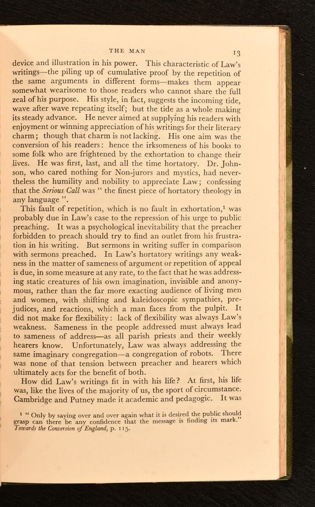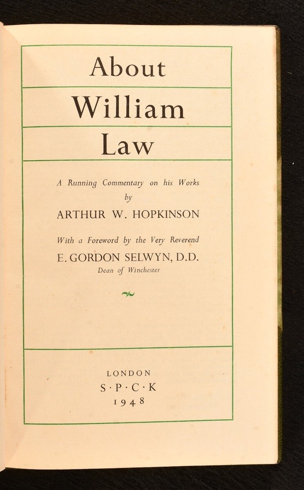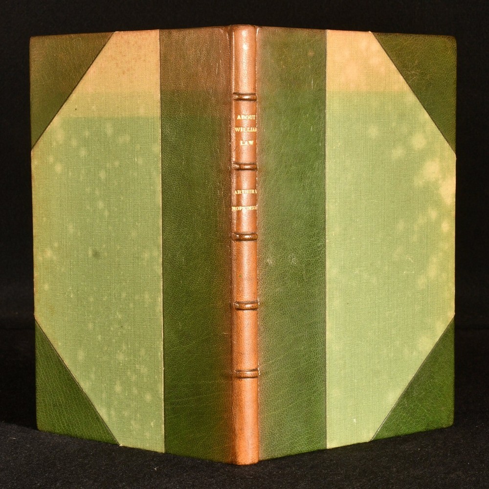 Click here to see our other books! About William Law Arthur W. Hopkinson; E. Gordon Selwyn 1948 S. P. C. K. : London 8.5" by 5.5" ix, [3], 131, [1pp.] SUMMARY A leather-bound, first edition of Arthur Hopkinson's biographical work on theologian and priest, William Law. First Edition,Leather Binding Overall Condition: Very Good Indeed This book weighs 0.75 KG when packed UK Postage: £ 3.99 US Postage: £ 19.99 EU Postage : £ 15.99 European Postage: £ 16.99 Asia Postage: £ 21.99 Worldwide Postage: £ 25.99 DESCRIPTION First edition, in a contemporary half calf binding, with cloth boards. Arthur Hopkinson provides a running commentary of the works of British theological writer, William Law. With a foreword by the Dean of Winchester, E. Gordon Selwyn. William Law was a Church of England priest who lost his placement at Emmanuel College when he refused to take an oath of allegiance to the first Hanoverian King, George I. Law was known for his extensive writings on practical divinity and mysticism. With the bookplate of W. J. Palmer. CONDITION In a contemporary half calf binding, with cloth boards. Externally, excellent, with fading to the spine and the head of the boards. Slight spotting to the cloth. Bookplate to the front endpaper. Very light spotting to endpapers. Internally, firmly bound. Pages bright and clean. Overall Condition: Very Good Indeed GLOSSARY OF TERMS Overall Condition (Dustwrapper condition rating is shown after that for the book itself, where a dustwrapper is present) Fine - Very well preserved copy showing very little wear Very Good Indeed - Only one or two minor faults, really a very attractive copy Very Good - Quite a wide term meaning no major faults but probably several smaller ones often expected given the age of the book, but still a respectable copy Good - Meaning not very good. Some more serious faults as will be described in the condition report under 'condition' Good Only - Meaning one or more faults that could really do with repair Fair - As with good only above but with other faults leaving a compromised copy even after repair Poor - Really bad and possibly seriously incomplete. We only sell books in this condition where their rarity or value makes them attractive none the less. Major defects will be described. GUARANTEE We offer a full money back guarantee on our descriptions. Please ask for details and conditions. We prefer PAYPAL. If you pay via PAYPAL we will post the item off the same or the next working day with the postage you have selected. Please note we cannot accept USD cheques