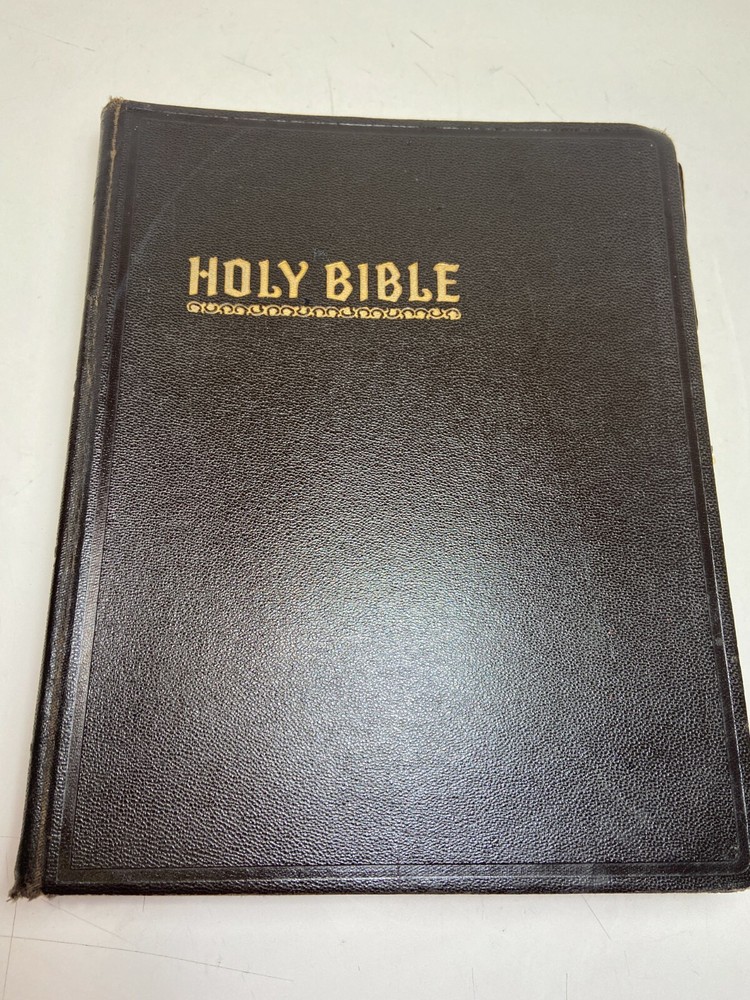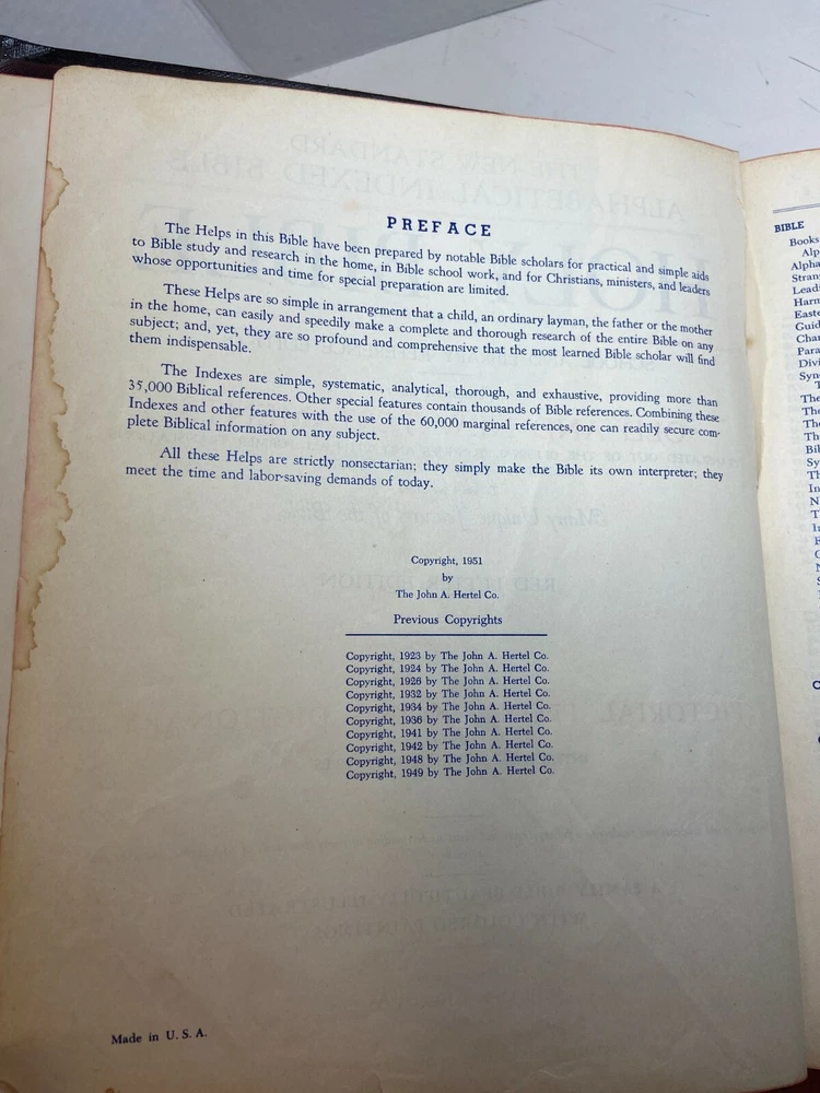 1951 Brown Leather Hertel New Standard Reference Bible Blue Ribbon Minimal Marks Excellent condition. Binding is separating from cover. First page of personal information is torn. Some forms in the book are filled out. Majority of pages are unmarked and clean, in good condition. Please ask for additional photos if desired by messaging.