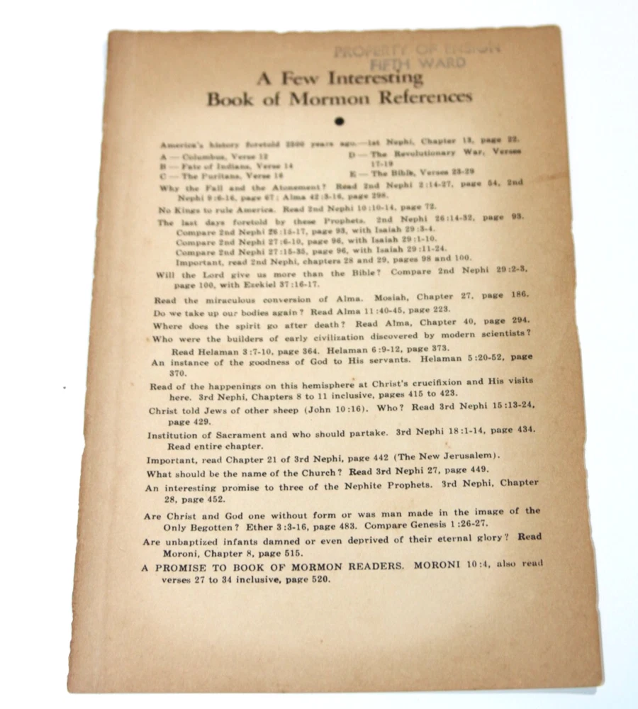 This vintage LDS Book of Mormon features the iconic Angel Moroni cover and is a must-have for any serious collector of religious texts. Published by The Church of Jesus Christ of Latter-Day Saints and written by Joseph Smith Jr., this original English language edition is bound in beautiful leather and is a true treasure to behold. With a focus on Mormonism and religion & spirituality, this book is sure to provide readers with a deeper understanding of their faith. The book is in great shape and is a perfect addition to any collection. Don't miss your chance to own this rare piece of history. Pre-owned in good condition. Does have some white marks on the cover pictured. On top of last page stamped property of Ensign Fifth Ward. Please see photos for more details.
