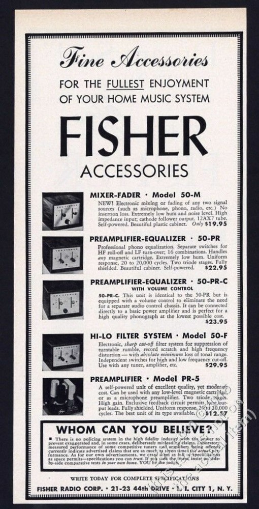 This is an original 1953 print ad for Fisher stereo equipment! It measures approximately 11" x 5" overall, has no stains or tears, comes from a dry, high-altitude, smoke-free environment, and is strictly graded "Very Fine". This vintage ad is not any kind of later reproduction, photocopy or reprint (most ads were published at one time only, and never commercially reproduced). An unusual and distinctive piece for your frame. THANK YOU for the opportunity to earn your business. Please scroll down to see our shipping information. Thank you for helping us celebrate our 19th YEAR on ebay! Watch for our special 19% off sales through the year. t237XXXX 229593 1953 Fisher stereo mixer fader preamp etc 5 models photo vintage print ad
