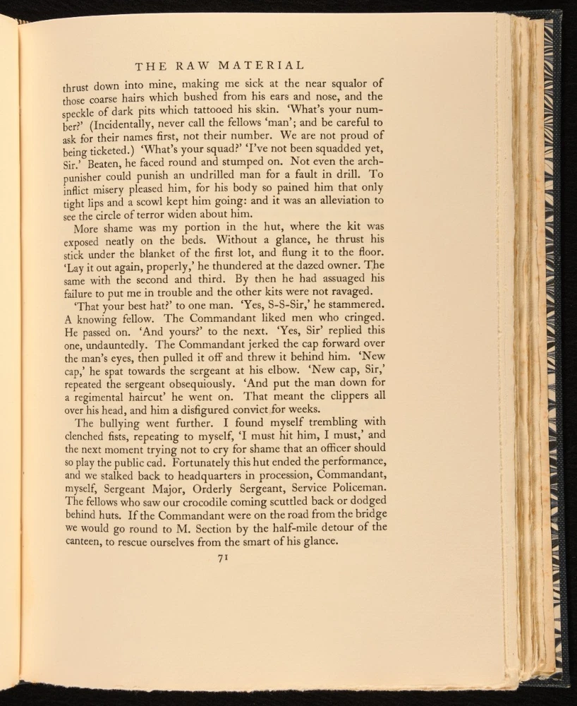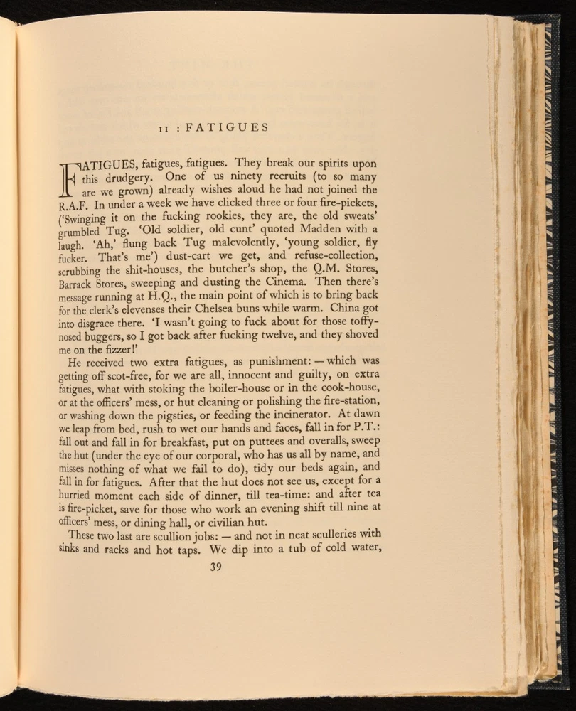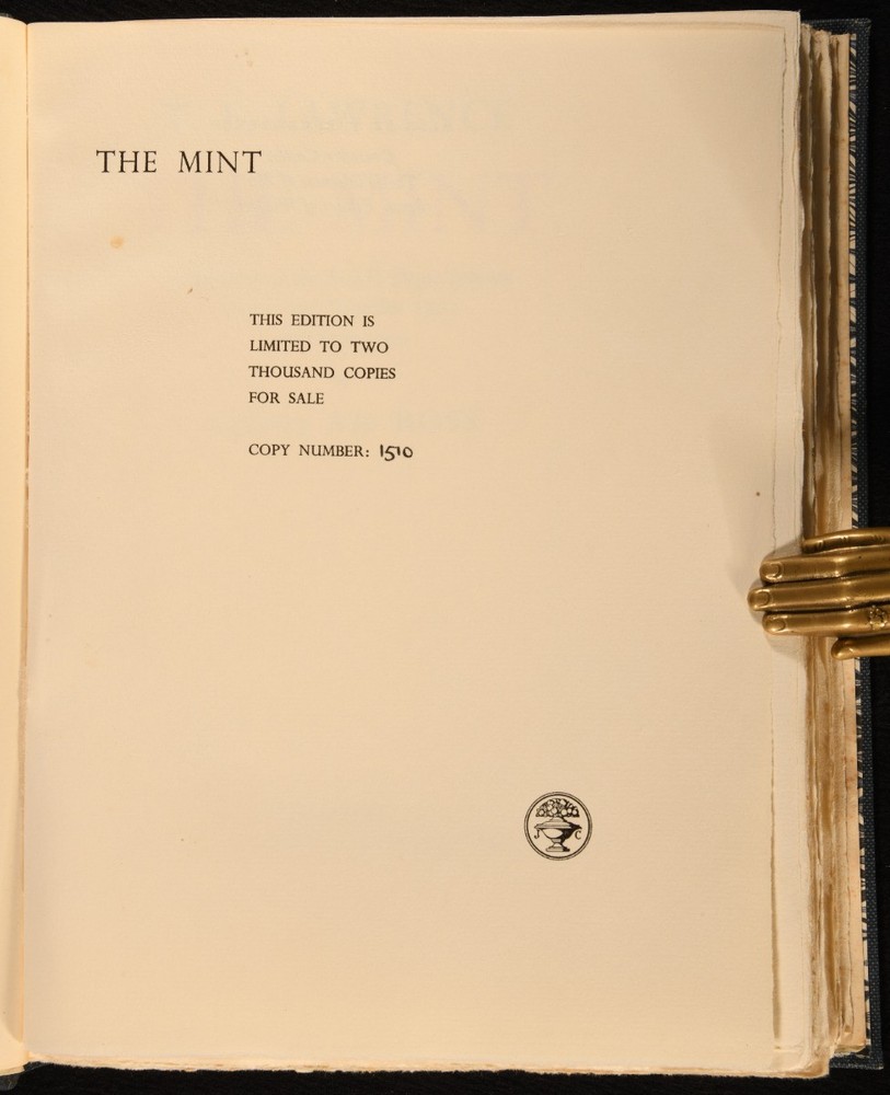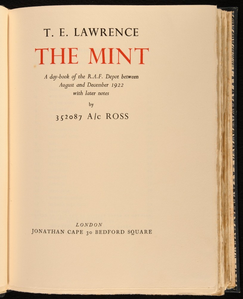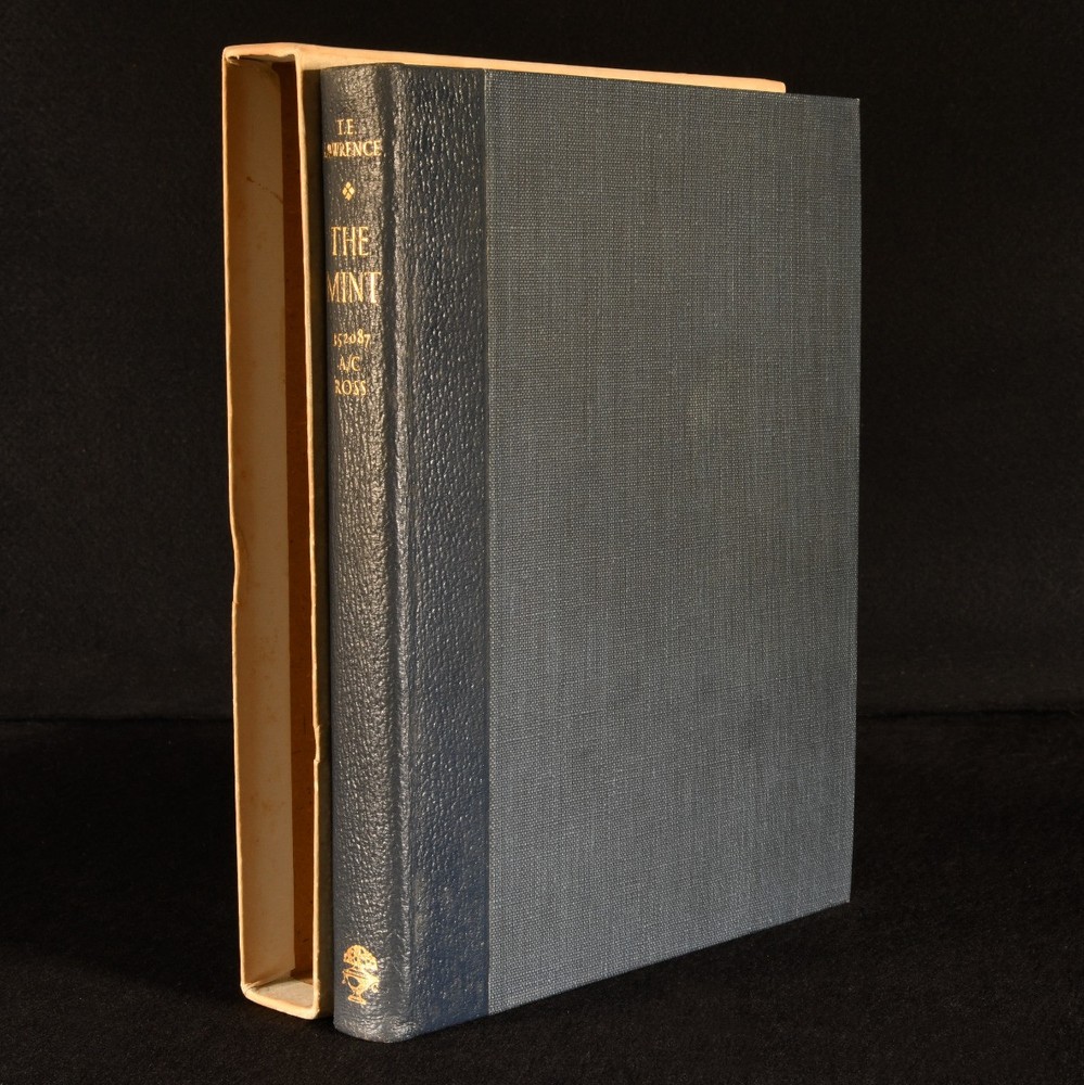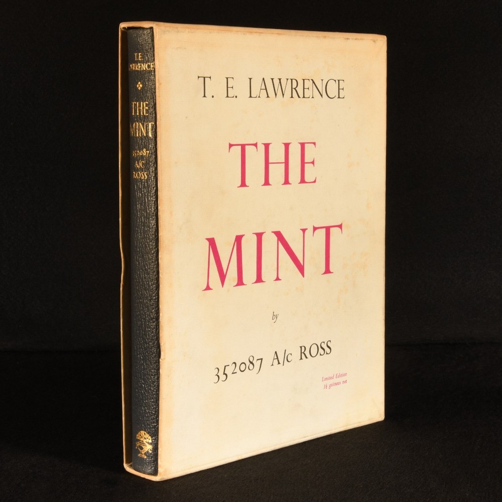 Click here to see our other books! The Mint: A Day-Book of the R. A. F. Depot Between August and December 1922 16 352087 A/c Ross [T. E. Lawrence] 1955 Jonathan Cape : London 11" by 8.5" [2], 206pp SUMMARY An exceptional limited edition example of T. E. Lawrence's memoirs of his time enlisted in the Royal Air Force. First Edition,Leather Binding,Limited Edition,With Slipcase Overall Condition: Fine This book weighs 1.5 KG when packed UK Postage: £ 3.99 US Postage: £ 23.99 EU Postage : £ 18.99 European Postage: £ 19.99 Asia Postage: £ 31.99 Worldwide Postage: £ 32.99 DESCRIPTION A first edition, limited issue, with this copy being no. 150 of 2,000 copies produced. In the publisher's original slip case, with price intact. Lawrence's 'The Mint' is a memoir of his experiences as an enlisted man in the Royal Air Force; working from a notebook he kept while enlisted, Lawrence wrote of the daily lives of fellow servicemen and about his feelings towards the RAF. The book was published posthumously, edited by his brother Prof. A. W. Lawrence. Though noted as flawed by critics, this work is notable for its sharp observation and the insight it gives into Lawrence as a person, and for the censorship issues around its publication. With the bookplate of George Marten to the front pastedown. CONDITION In the publisher's original quarter morocco binding, with cloth covered boards. With paper covered slip case. Externally, fine. Bookplate to front pastedown. Slip case in very good condition indeed, with bumps to joints and light handling marks to boards. Internally, firmly bound. Pages clean and bright. Overall Condition: Fine GLOSSARY OF TERMS Overall Condition (Dustwrapper condition rating is shown after that for the book itself, where a dustwrapper is present) Fine - Very well preserved copy showing very little wear Very Good Indeed - Only one or two minor faults, really a very attractive copy Very Good - Quite a wide term meaning no major faults but probably several smaller ones often expected given the age of the book, but still a respectable copy Good - Meaning not very good. Some more serious faults as will be described in the condition report under 'condition' Good Only - Meaning one or more faults that could really do with repair Fair - As with good only above but with other faults leaving a compromised copy even after repair Poor - Really bad and possibly seriously incomplete. We only sell books in this condition where their rarity or value makes them attractive none the less. Major defects will be described. GUARANTEE We offer a full money back guarantee on our descriptions. Please ask for details and conditions. We prefer PAYPAL. If you pay via PAYPAL we will post the item off the same or the next working day with the postage you have selected. Please note we cannot accept USD cheques
