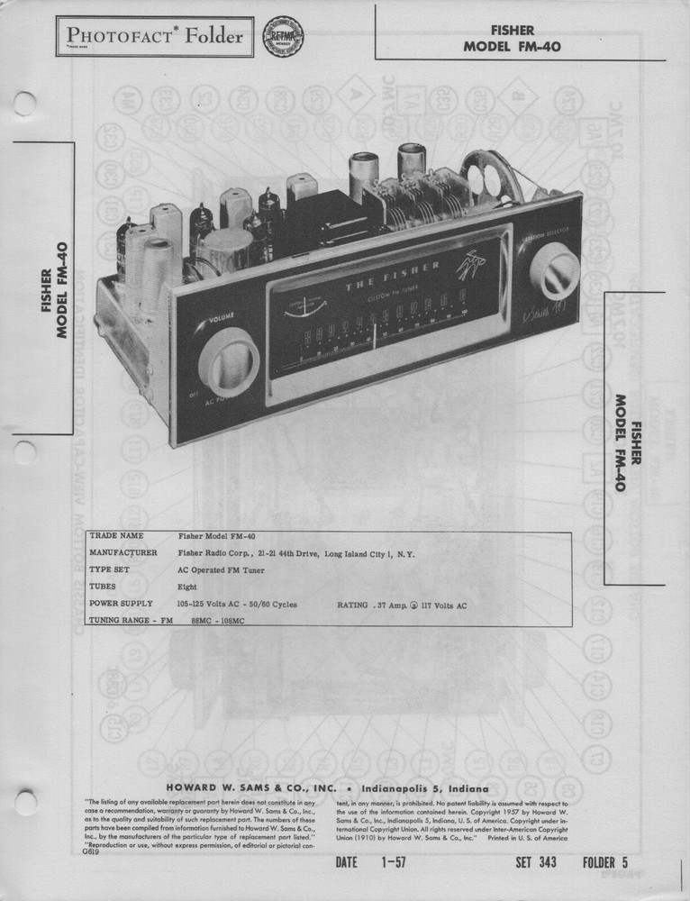 AM FM TUBE RADIO SERVICE MANUAL 1957 THE FISHER FM-40 This listing is for an original Photofact service folder that fits the make and model listed above. This item includes information such as alingnment instructions, schematics, line drawings, exploded views of the interior, parts listings and more. This manual is 8 pages long. US customers receive FREE SHIPPING on all radio and TV service manuals. Outside the US? We mail up to FIVE manuals for the single manual shipping cost! _gsrx_vers_856 (GS 7.0.20 (856))