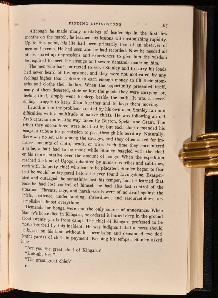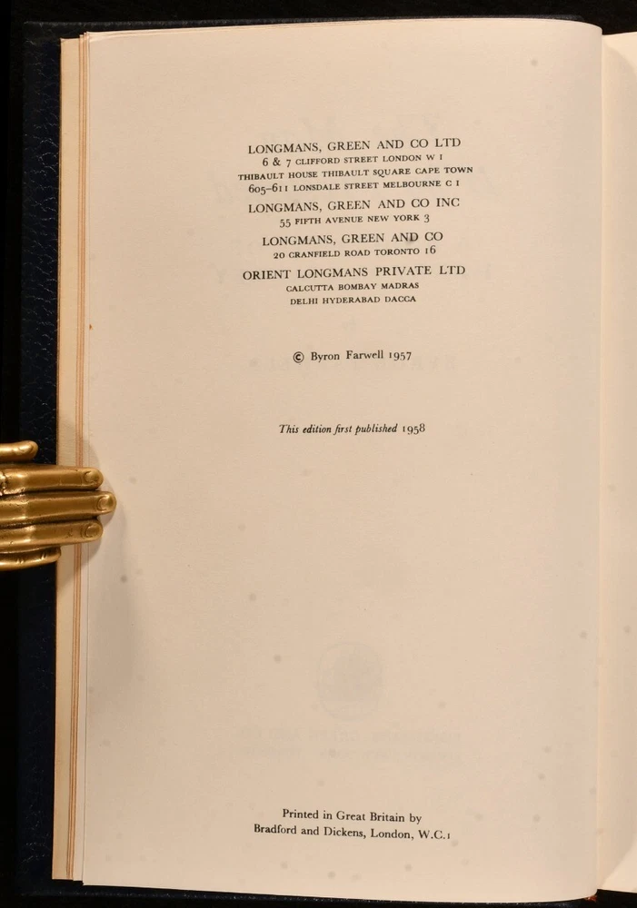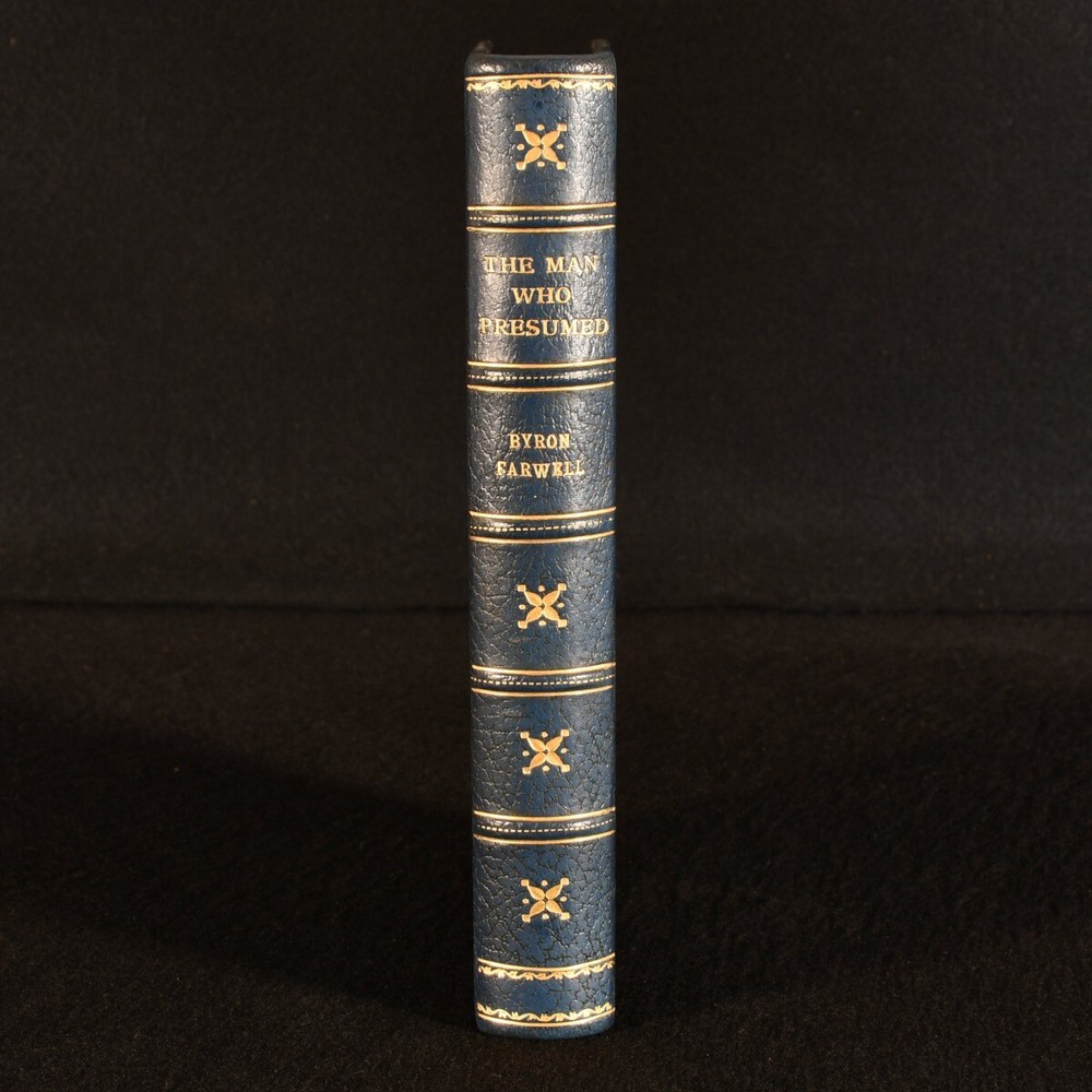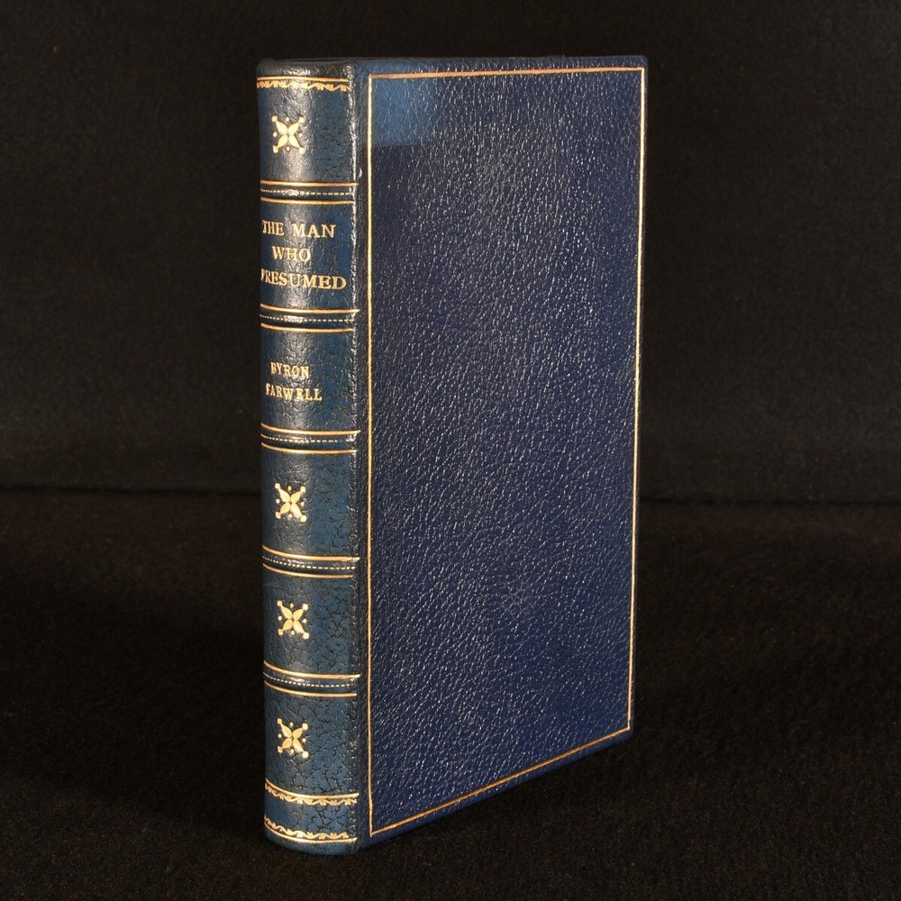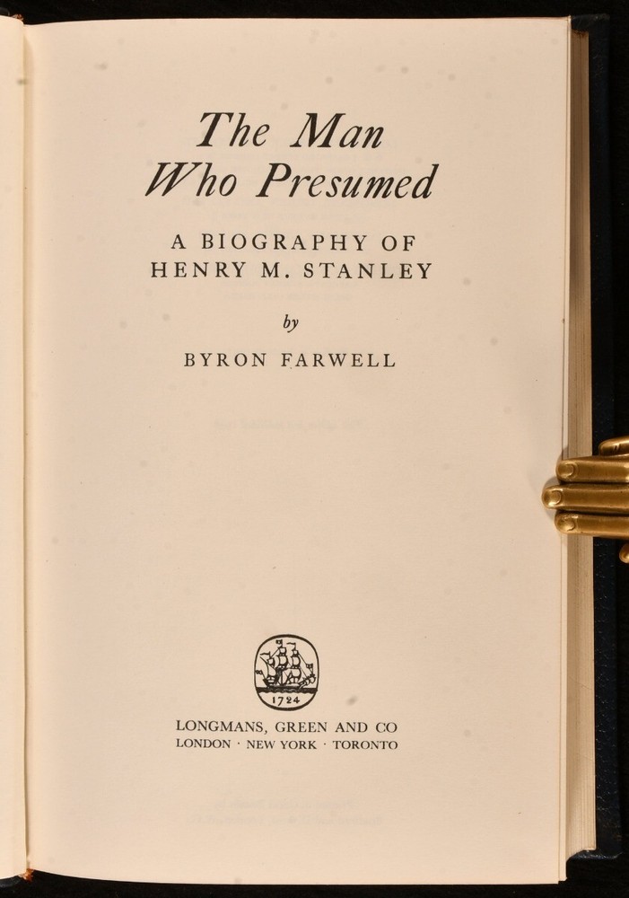 Click here to see our other books! The Man who Presumed: A Biography of Henry M. Stanley Byron Farwell 1958 Longmans, Green & Co. : London 9" by 6" viii, 1-334pp SUMMARY The first UK edition of Byron Falwell's biographical account of the life of the great African explorer Henry M. Stanley, in a full morocco binding. First Edition,Illustrated,Leather Binding Overall Condition: Near Fine This book weighs 1 KG when packed UK Postage: £ 3.99 US Postage: £ 22.99 EU Postage : £ 16.99 European Postage: £ 17.99 Asia Postage: £ 22.99 Worldwide Postage: £ 28.99 DESCRIPTION The first UK edition of this work, which was first published the year prior. With twenty illustrated plates. Collated, complete. The author provides an account of the life of Stanley, from his childhood to his journey to America, his service in the American Civil War, his African explorations, and his eventual marriage. Including an account of his exploration of Central Africa, and his search for missionary and explorer David Livingstone. With the morocco bookplate of W.A. Foyle of Beeleigh Abbey to the front pastedown. William Foyle founded Foyles bookshop in 1903 alongside his brother. He purchased Beeleigh Abbey during the Second World War, an impressive twelfth century monastery in Essex. Beeleigh housed his library, one of the largest private libraries in England. CONDITION In a full morocco binding. Externally, exceptionally lovely, with a small area of fading to head of front board. Bookplate to front pastedown. Internally, firmly bound. Pages clean and bright. Overall Condition: Near Fine GLOSSARY OF TERMS Overall Condition (Dustwrapper condition rating is shown after that for the book itself, where a dustwrapper is present) Fine - Very well preserved copy showing very little wear Very Good Indeed - Only one or two minor faults, really a very attractive copy Very Good - Quite a wide term meaning no major faults but probably several smaller ones often expected given the age of the book, but still a respectable copy Good - Meaning not very good. Some more serious faults as will be described in the condition report under 'condition' Good Only - Meaning one or more faults that could really do with repair Fair - As with good only above but with other faults leaving a compromised copy even after repair Poor - Really bad and possibly seriously incomplete. We only sell books in this condition where their rarity or value makes them attractive none the less. Major defects will be described. GUARANTEE We offer a full money back guarantee on our descriptions. Please ask for details and conditions. We prefer PAYPAL. If you pay via PAYPAL we will post the item off the same or the next working day with the postage you have selected. Please note we cannot accept USD cheques