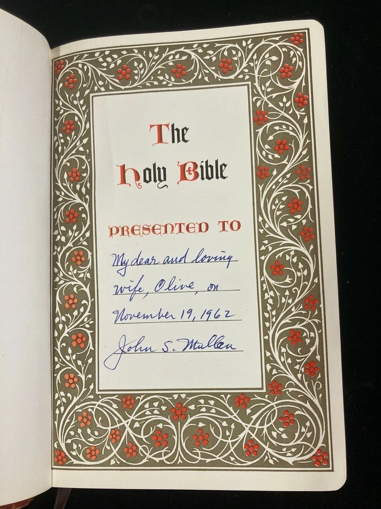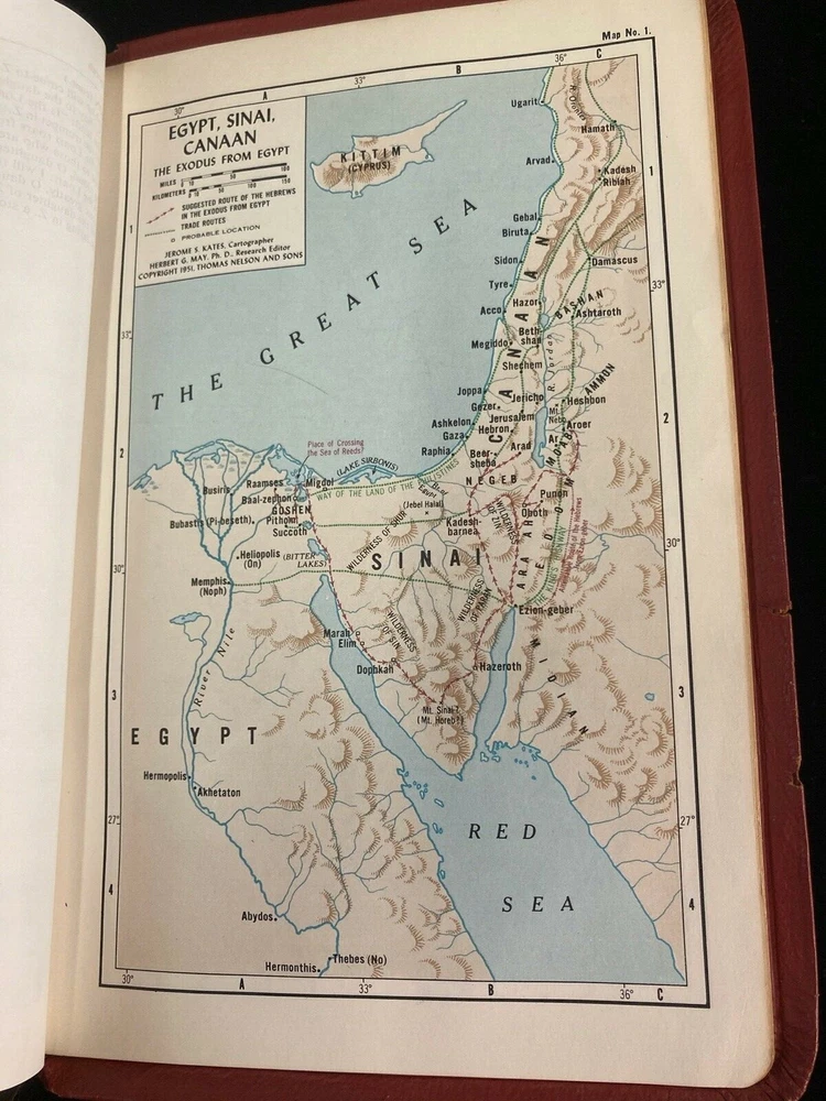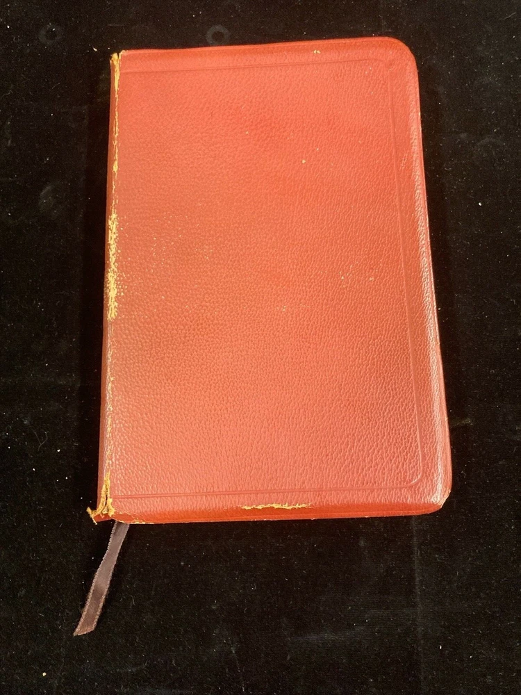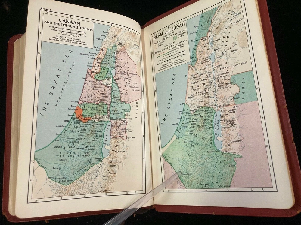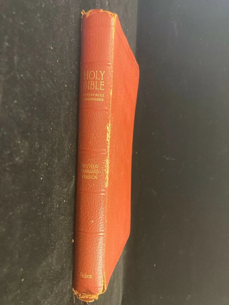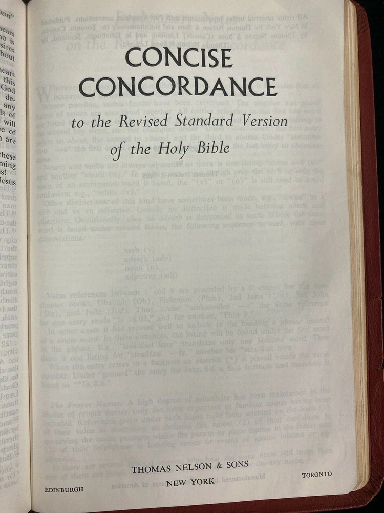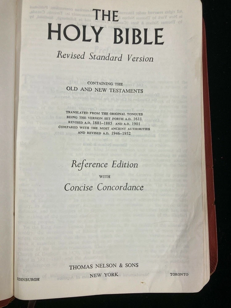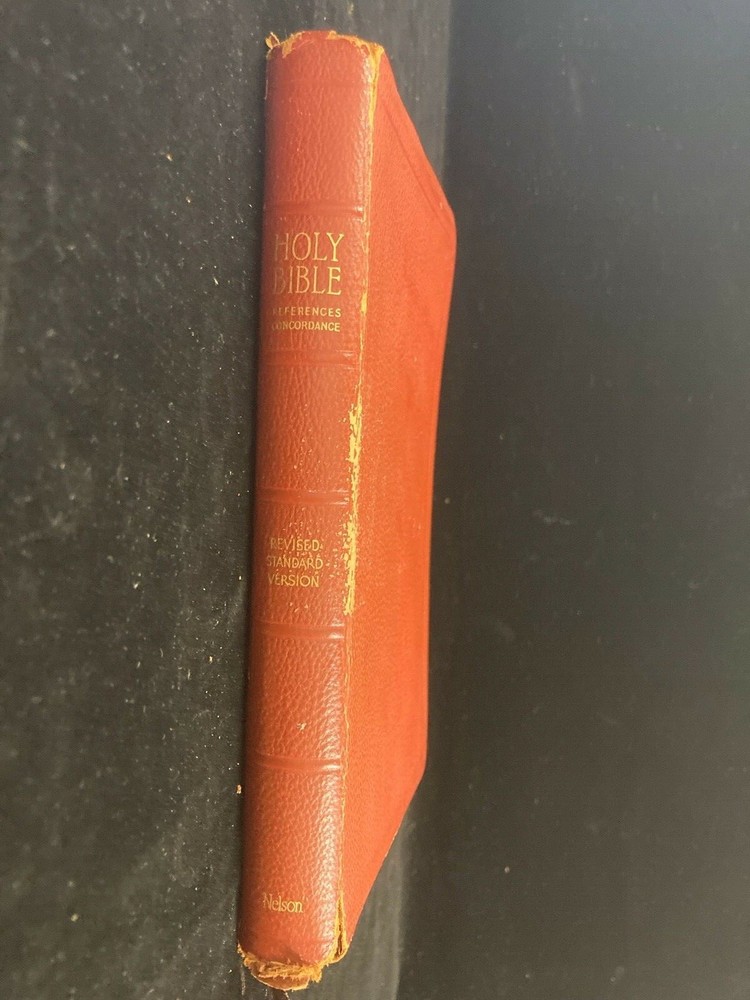 1959 HOLY BIBLE, OLD & NEW TESTAMENTS, REFERENCE EDITION WITH CONCISE CONCORDANCE, THOMAS NELSON & SONS PUBLISHING, NY, LEATHER COVER. INCLUDES MAPS. MEASURES 8 3/4" X 6" X 1". GOOD CONDITION, EXCEPT FOR LEATHER COVER EDGES ARE WORN, FIRST PAGE HAS MINOR SPLINE SEPARATION, AND SOME MINOR SMALL CORNER CREASES. ENJOY!!! (CABINET 1, SHELF 3, LEFT)