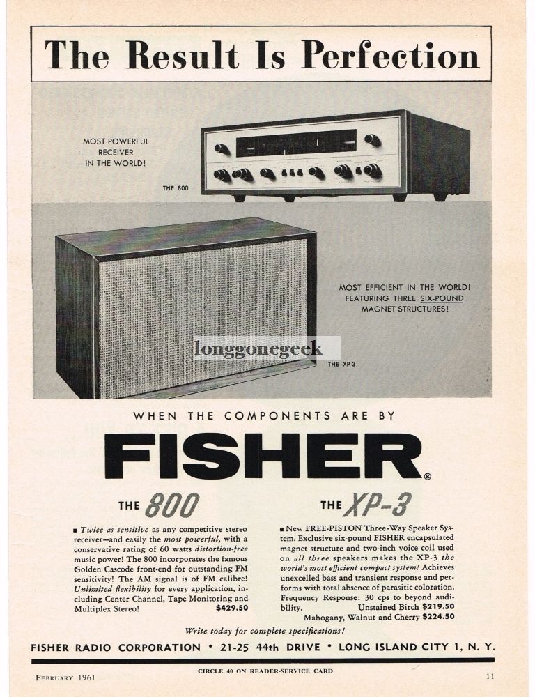 ADVERTISEMENT : 1960 Fisher 800 Stereo Receiver XP-3 Loudspeakers Hi-Fi Vtg Print Ad SIZE APPROXIMATELY: 8" x 11" CONDITION : Excellent-no tears, stains or creases Please note: This sale is for the vintage paper advertisement shown and not the item in the advertisement. It is not a copy, reprint or repro of any kind. Why not purchase one (or more) now! These old advertisements are ideal for: Collectors Historians Museums An intriguing gift Home and Business decor Don't just think of these as old pieces of paper. These are pieces of history. They show the changing fashions, architecture, furniture, design aesthetics and much more over the course of time. Many old ads have detailed info about the product they are advertising and can help with research. They also make a fine substitute for expensive artwork. Many old ads are very beautiful, or have bold graphics; many are drawn and signed by famous artists and illustrators. You could decorate your business, whole house or apartment, man or woman cave with vintage advertisements for the same price as one piece of fine art. Like this item? Why not purchase it now! About The Advertisements All advertisements are carefully removed from the source (magazines, newspapers, books, etc.) and are completely original. No copies, reprints or reproductions of any kind . Most vintage ads were printed on very thin paper and so some of the printing or advertisement from the reverse side may be visible. Ads are shipped flat and are packaged using archival acid-free backing boards and acid-free, clear plastic sleeves. Payment, Shipping and Returns I accept Paypal. Combined Shipping: I only charge shipping for one ad and/or print, no matter how many are purchased, if all items are paid for with a single payment. Items paid for separately will be shipped separately and do not qualify for discounts. If you are having trouble making a combined payment for all your items, please contact me BEFORE making your payment. I may be able to help out and save you some money. 30 day return policy for any reason Thanks for looking!