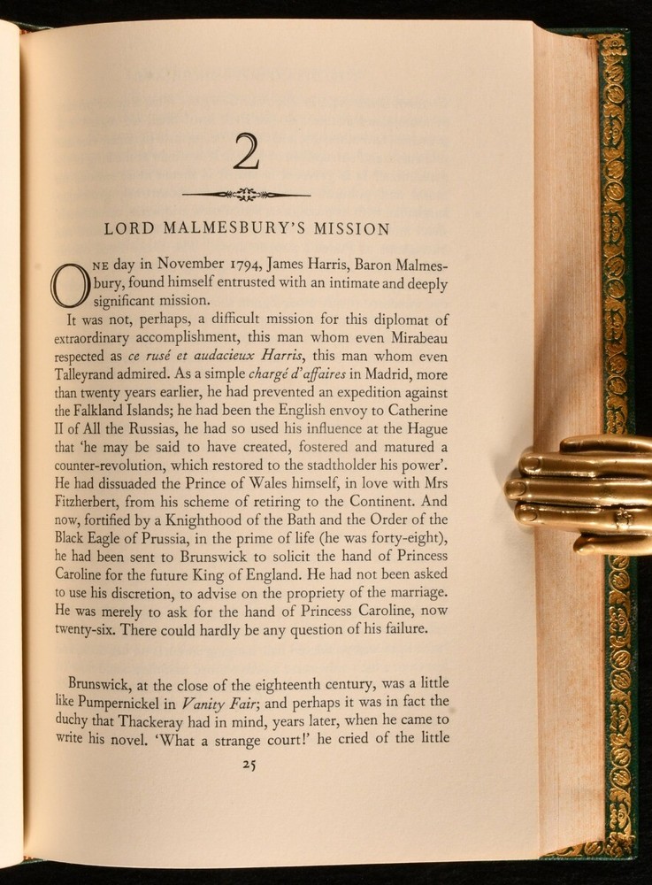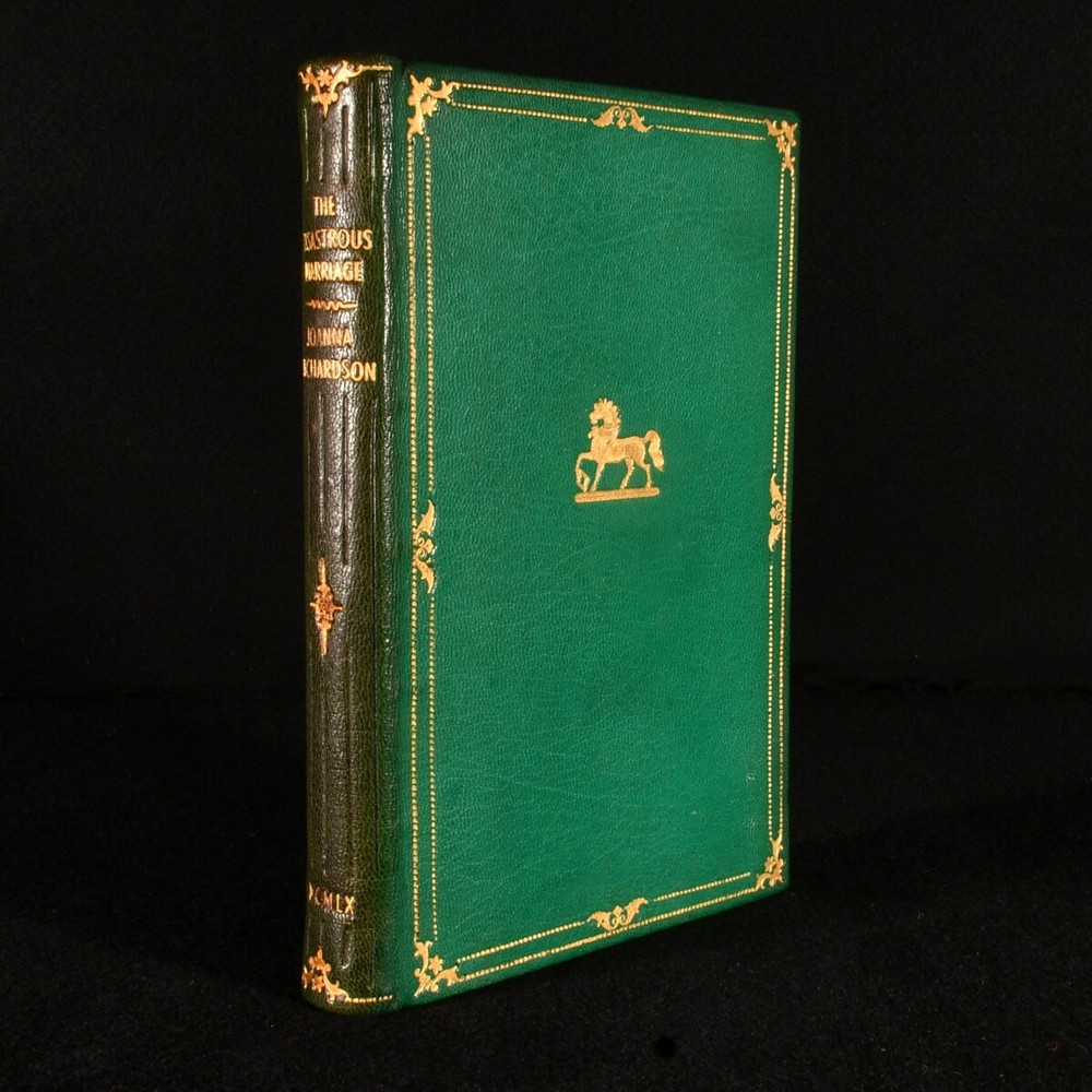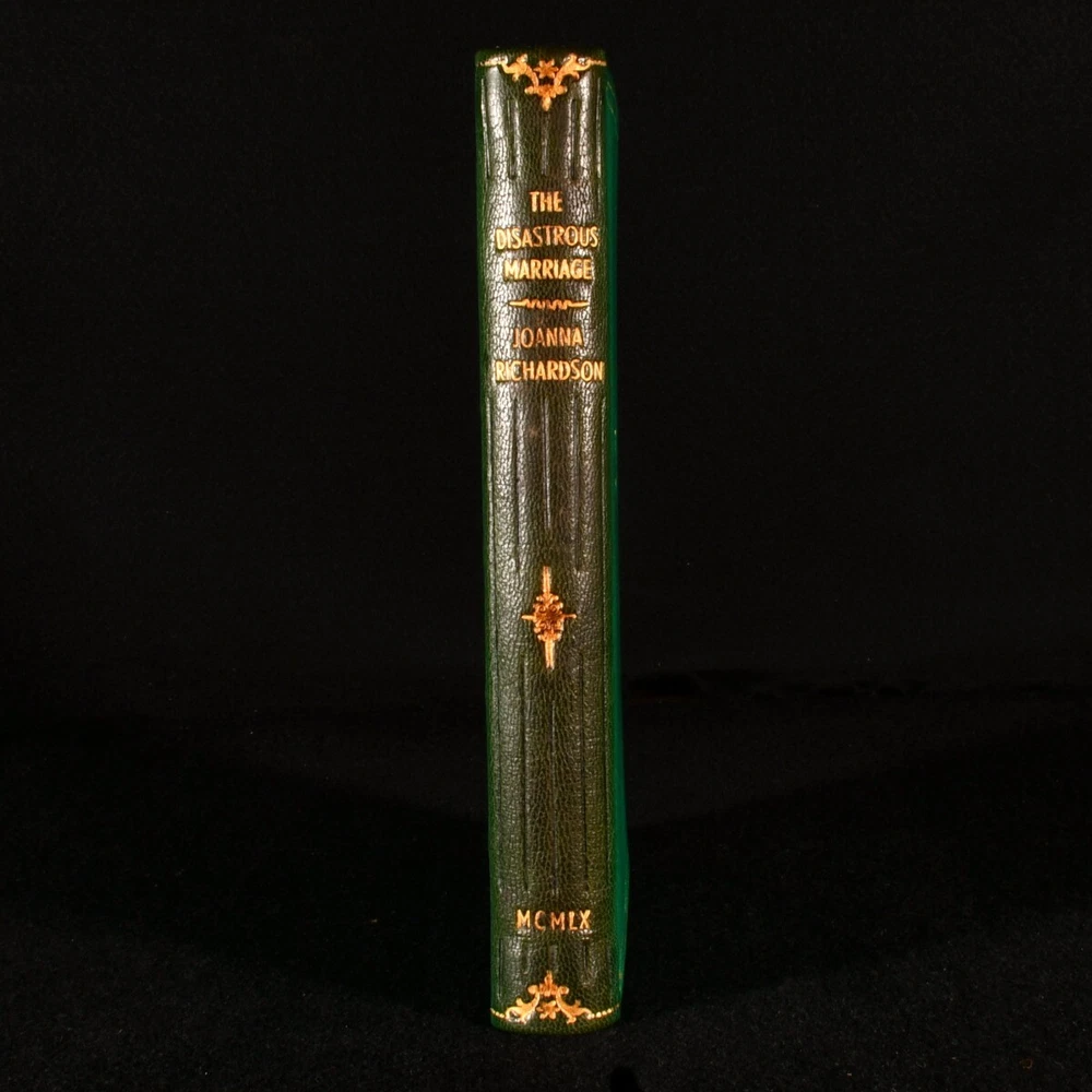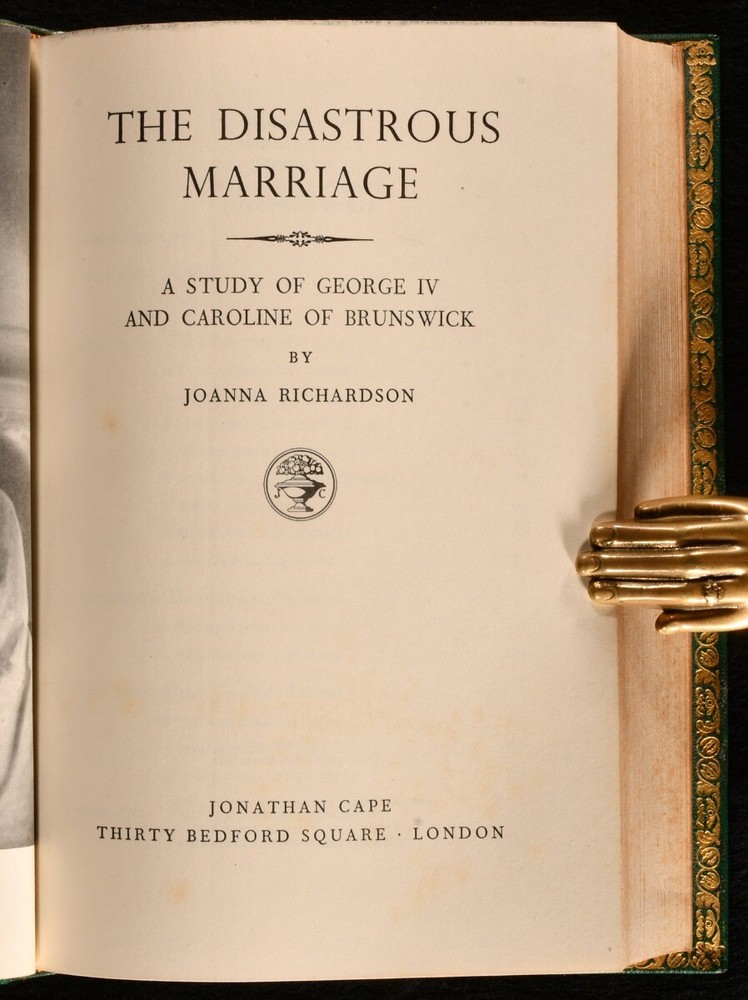 Click here to see our other books! The Disastrous Marriage: A Study of George IV and Caroline of Brunswick Joanna Richardson 1960 Jonathan Cape : London 9" by 6" 255pp SUMMARY A beautifully bound first edition of this historical account of the marriage of Caroline of Brunswick and King George IV. First Edition,Illustrated,Leather Binding,Rebound,Signed Binding Overall Condition: Near Fine This book weighs 0.75 KG when packed UK Postage: £ 3.99 US Postage: £ 19.99 EU Postage : £ 15.99 European Postage: £ 16.99 Asia Postage: £ 21.99 Worldwide Postage: £ 25.99 DESCRIPTION The first edition, first impression of this work. Rebound in an attractive crushed morocco, the binding is signed 'R. W. & H. B. 1962'. With full plate illustrations. An account of the troubled marriage of King George IV and his wife, Caroline of Brunswick. Upon their first meeting, she regarded him as 'very fat' and 'nothing like as handsome as his portrait', while the future King regarded Caroline as unattractive and unhygienic. From this initial impression, the state of their relations deteriorated. The work of Joanna Richardson, who over the course of her career completed twenty-one biographies of writers, poets and other historical figures. CONDITION Rebound in a full crushed morocco signed binding. Some discolouration to back strip, with boards bright. Internally, firmly bound. Minor light spotting to title page, with pages otherwise clean and bright. Overall Condition: Near Fine GLOSSARY OF TERMS Overall Condition (Dustwrapper condition rating is shown after that for the book itself, where a dustwrapper is present) Fine - Very well preserved copy showing very little wear Very Good Indeed - Only one or two minor faults, really a very attractive copy Very Good - Quite a wide term meaning no major faults but probably several smaller ones often expected given the age of the book, but still a respectable copy Good - Meaning not very good. Some more serious faults as will be described in the condition report under 'condition' Good Only - Meaning one or more faults that could really do with repair Fair - As with good only above but with other faults leaving a compromised copy even after repair Poor - Really bad and possibly seriously incomplete. We only sell books in this condition where their rarity or value makes them attractive none the less. Major defects will be described. GUARANTEE We offer a full money back guarantee on our descriptions. Please ask for details and conditions. We prefer PAYPAL. If you pay via PAYPAL we will post the item off the same or the next working day with the postage you have selected. Please note we cannot accept USD cheques